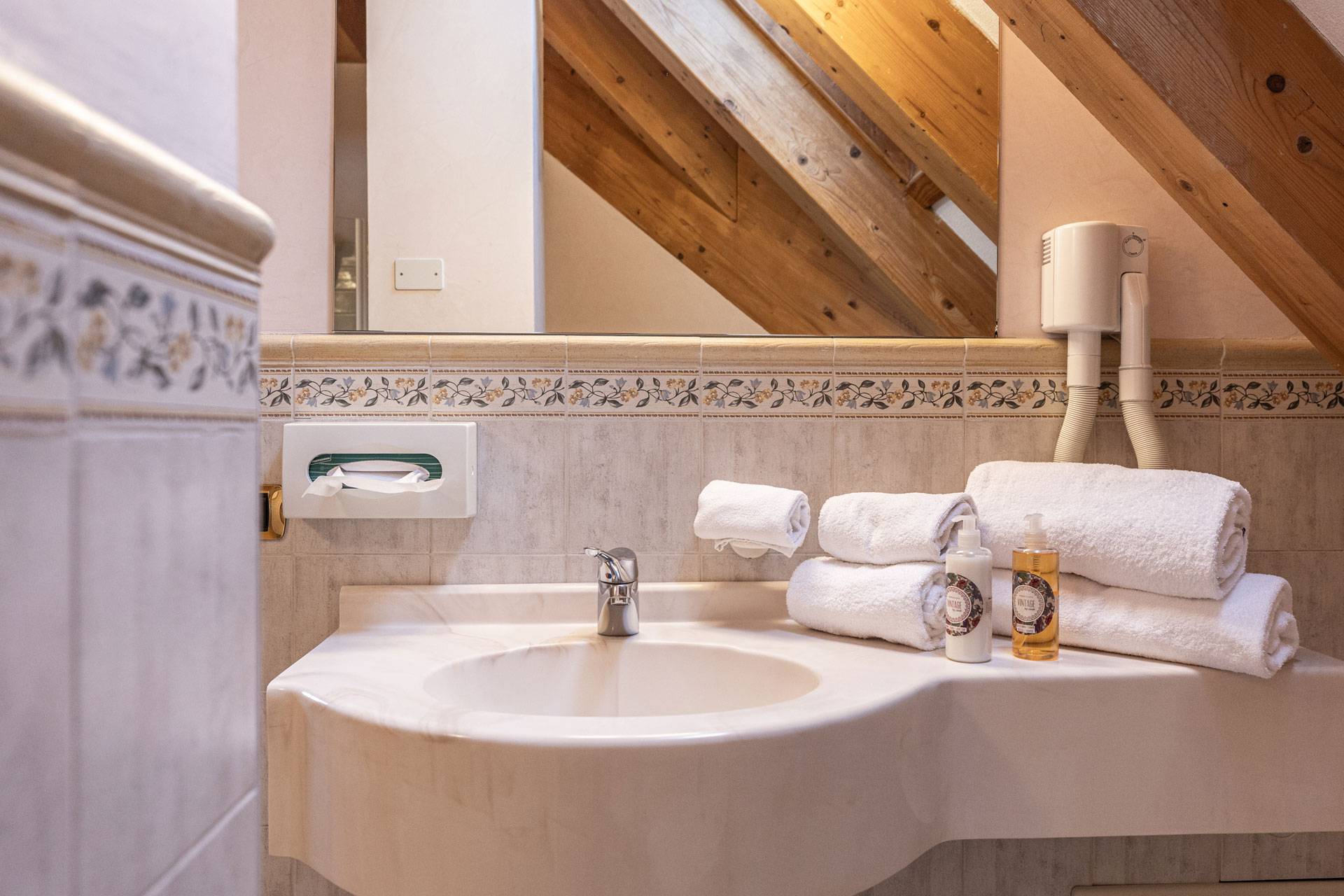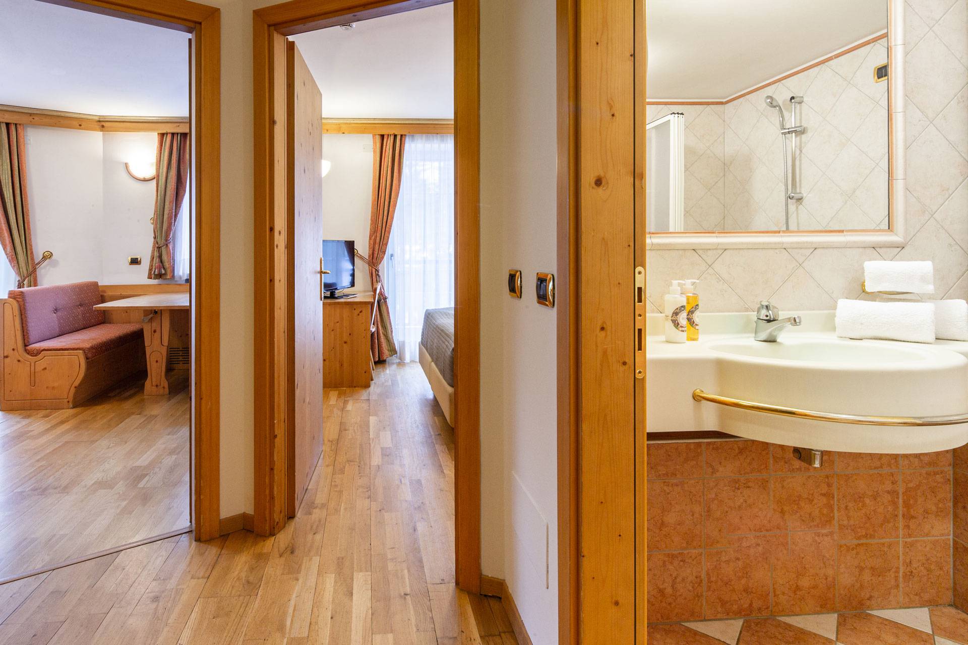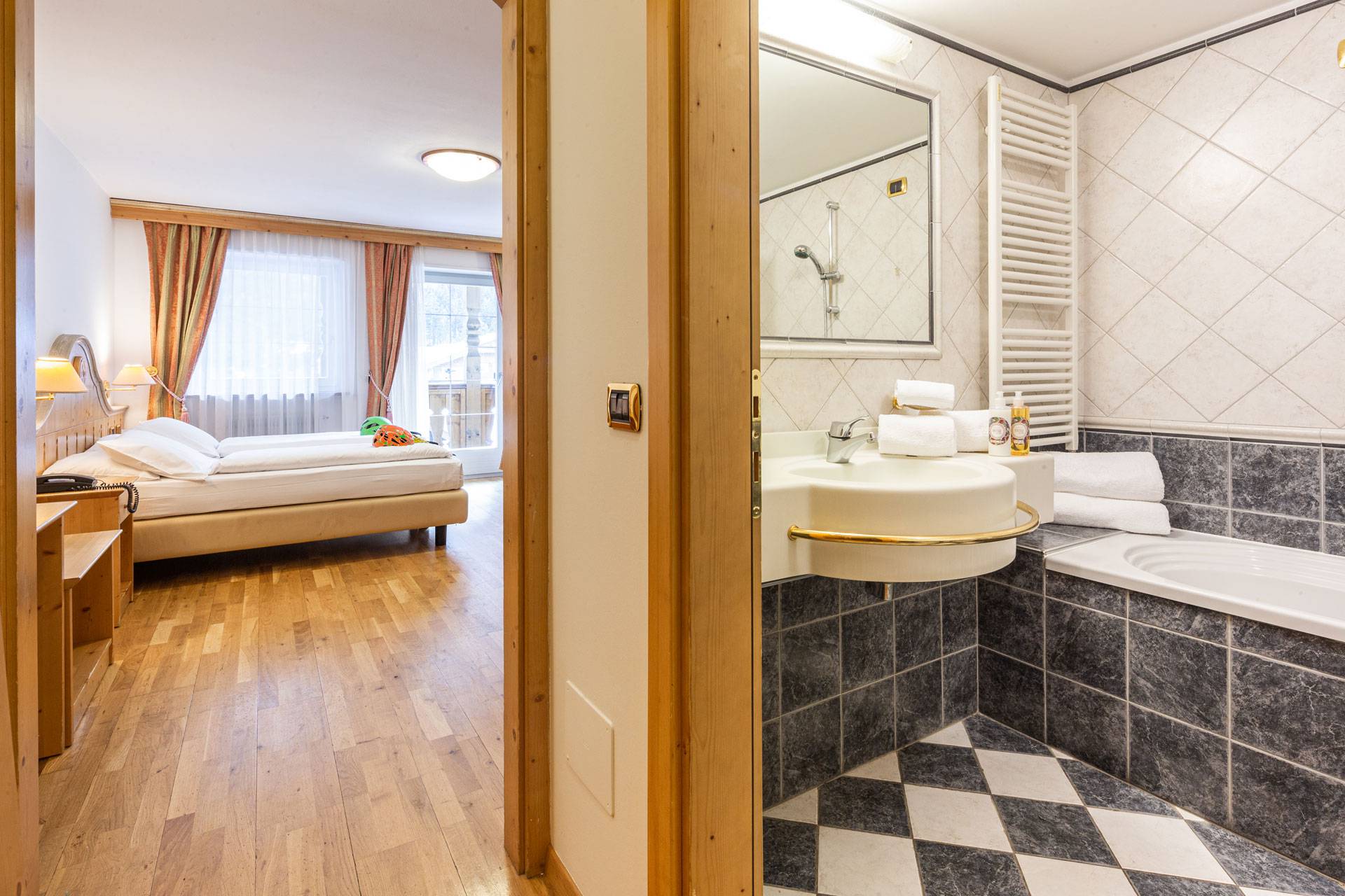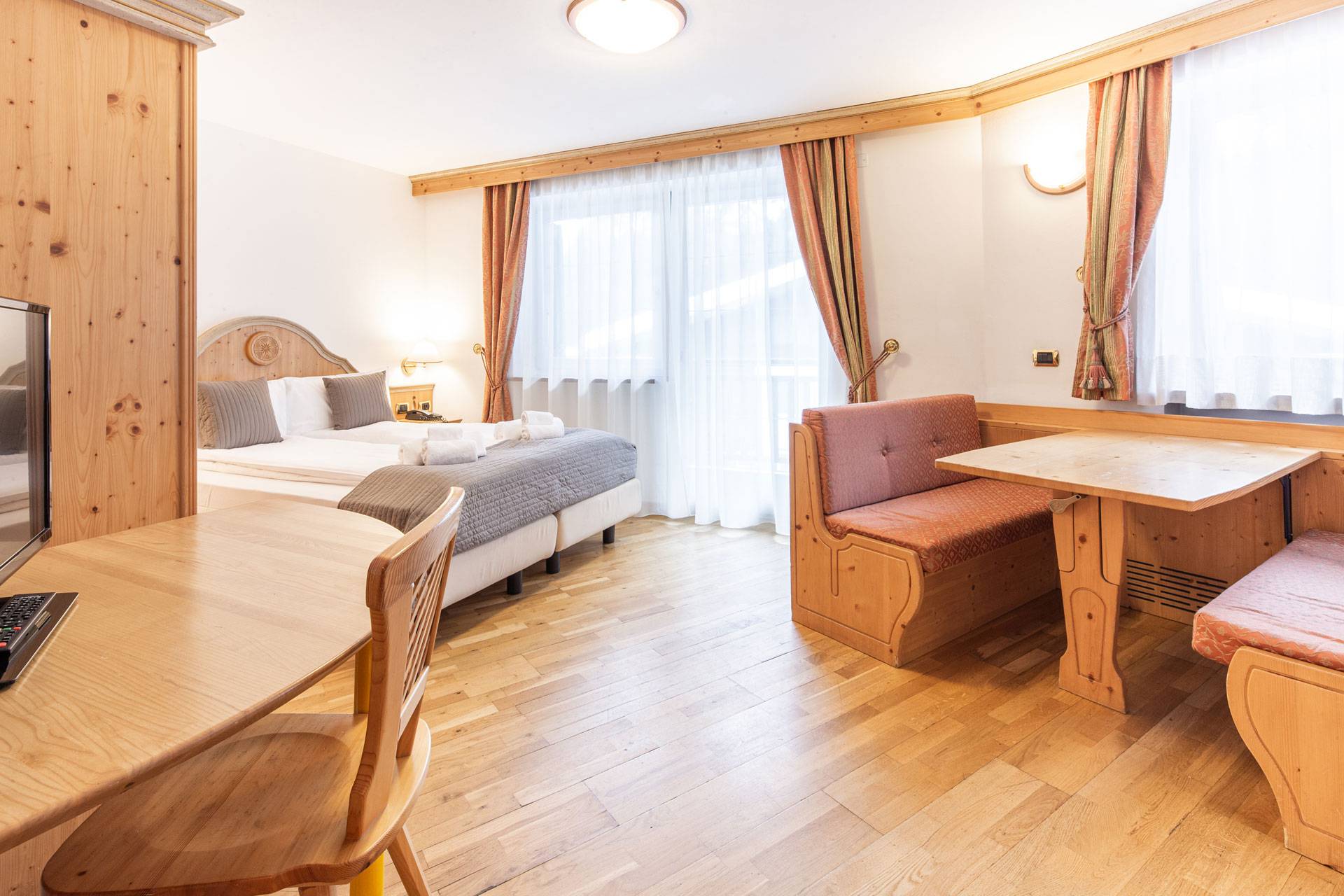 Qaudruple superior room for 3/4 people of about 36 sqm, in mountain style, composed of two separate double rooms, with double bed or twin bed. Desk, color TV, safe and telephone, parquet and carpet. One bathrooms with bathtube, hairdryer, high quality complimentary toiletries and bathrobe. Balcony with view on the Dolomites.