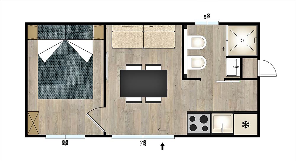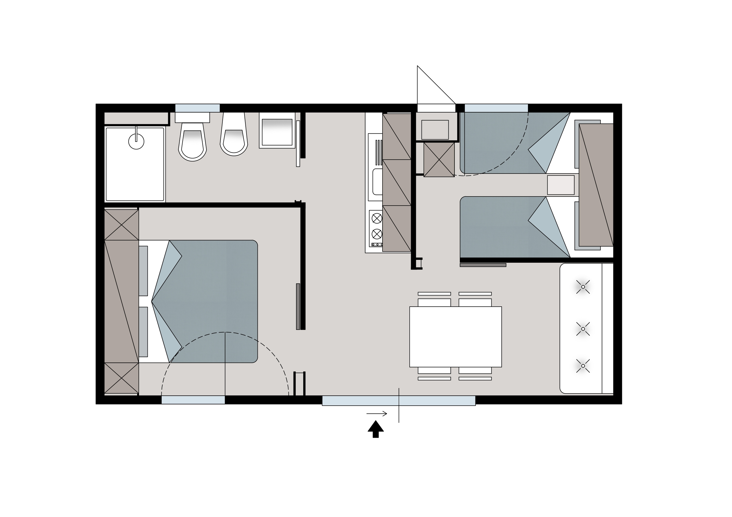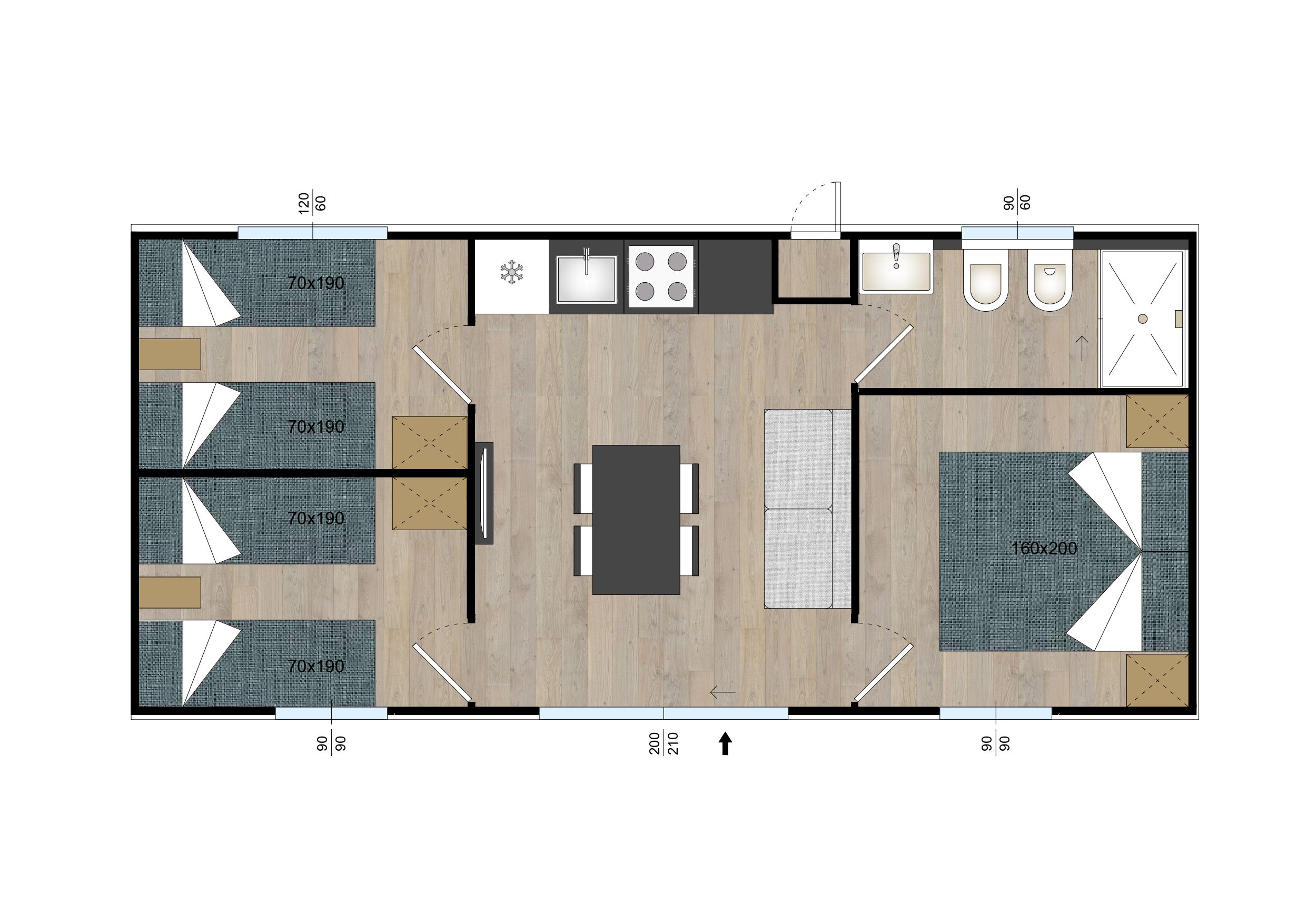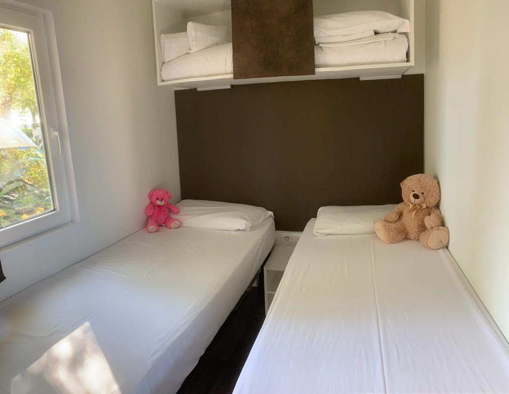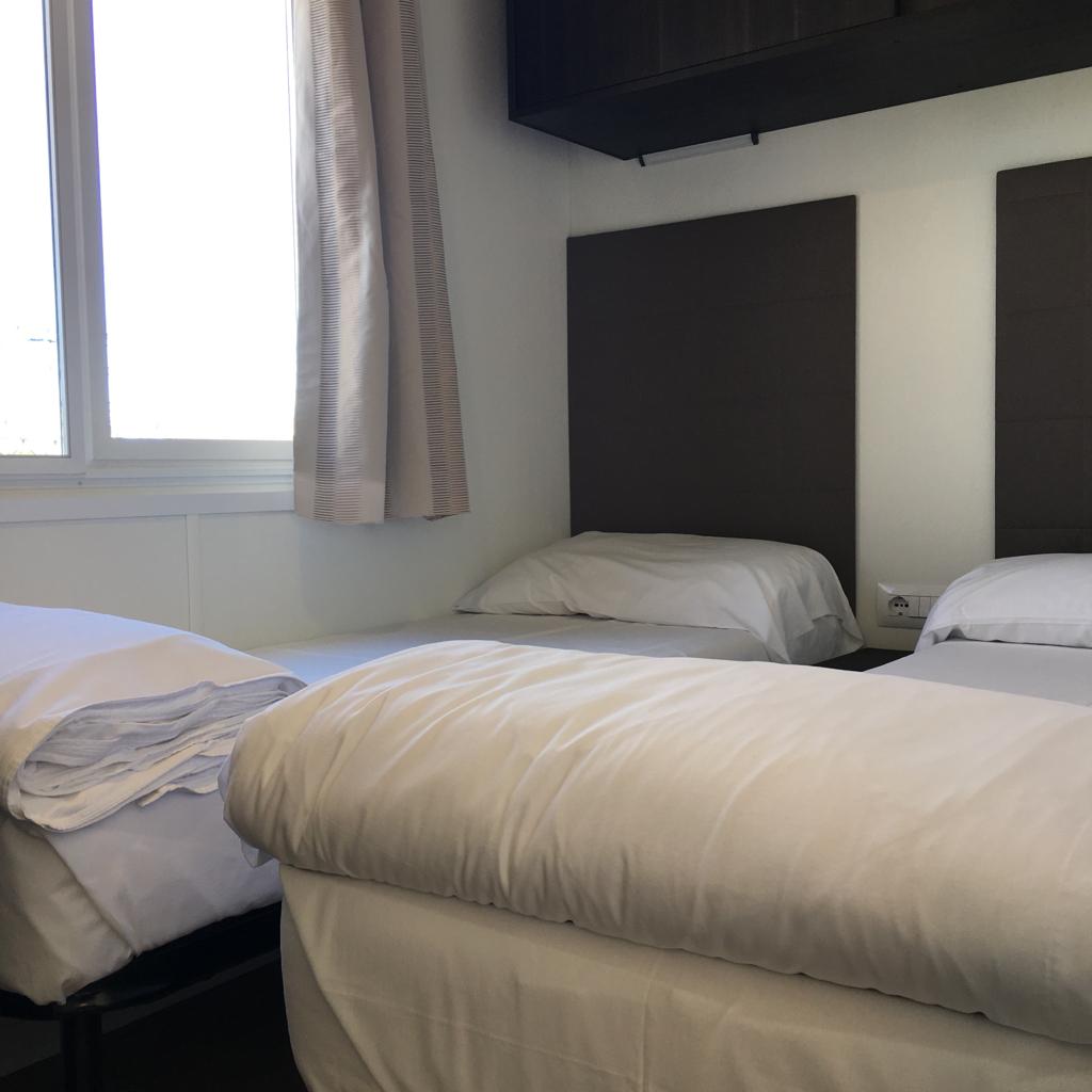 Ideale per le famiglie o gruppi di amici. Una casa mobile basic che comprende clima/riscaldamento, biancheria da letto e 1 asciugamano per persona, terrazza esterna, 4 letti singoli in due camere separate, bagno privato, frigorifero e WIFI. Non dispone di cucina. Pulizie finali incluse. Non disponibili: microonde, caffettiera e bollitore.