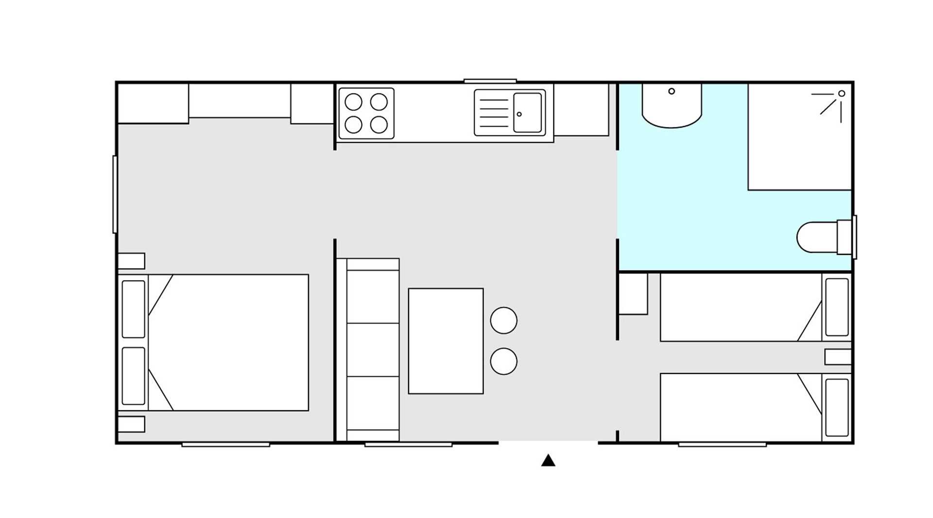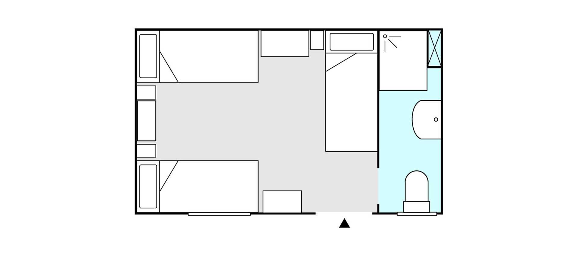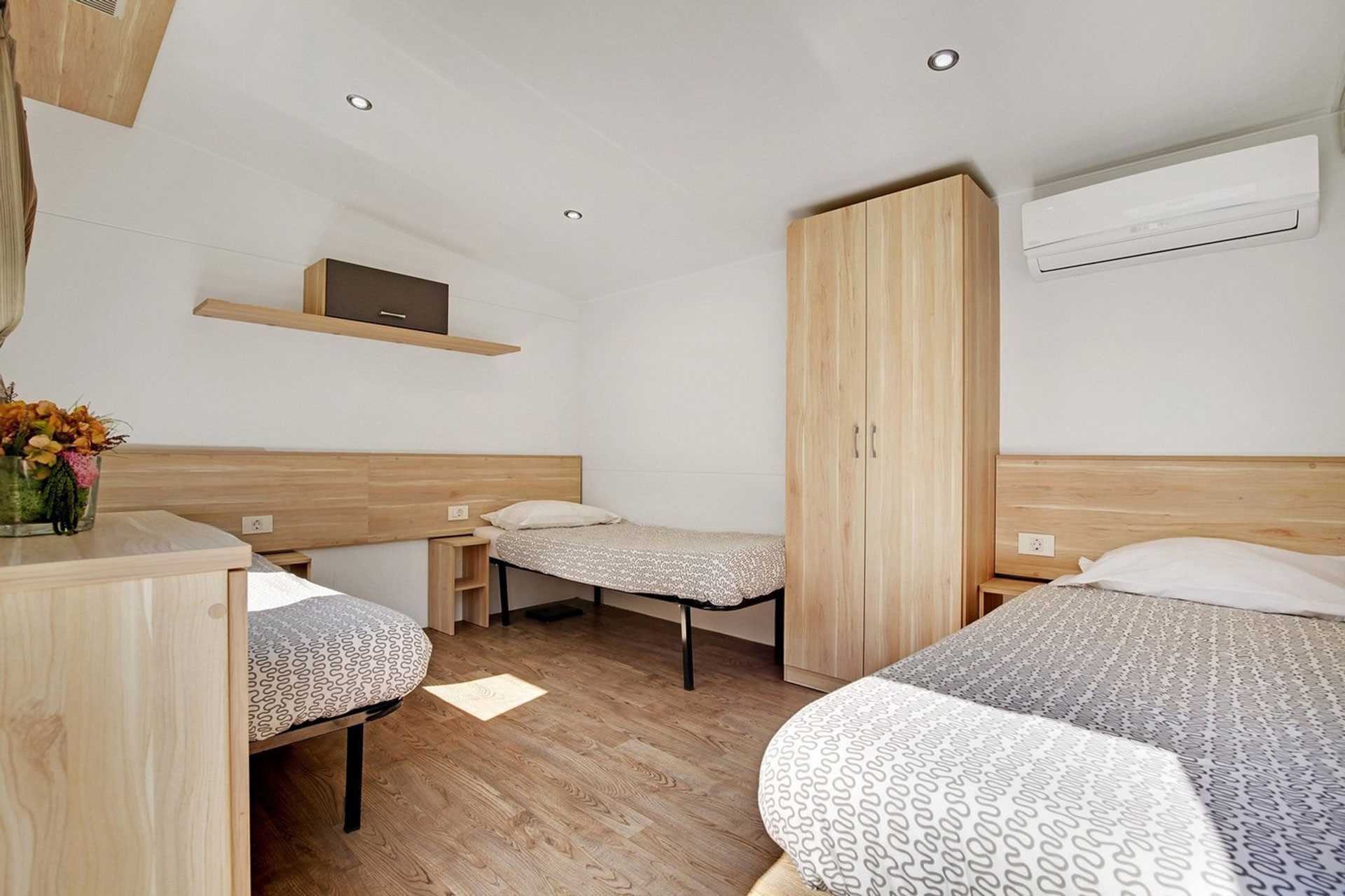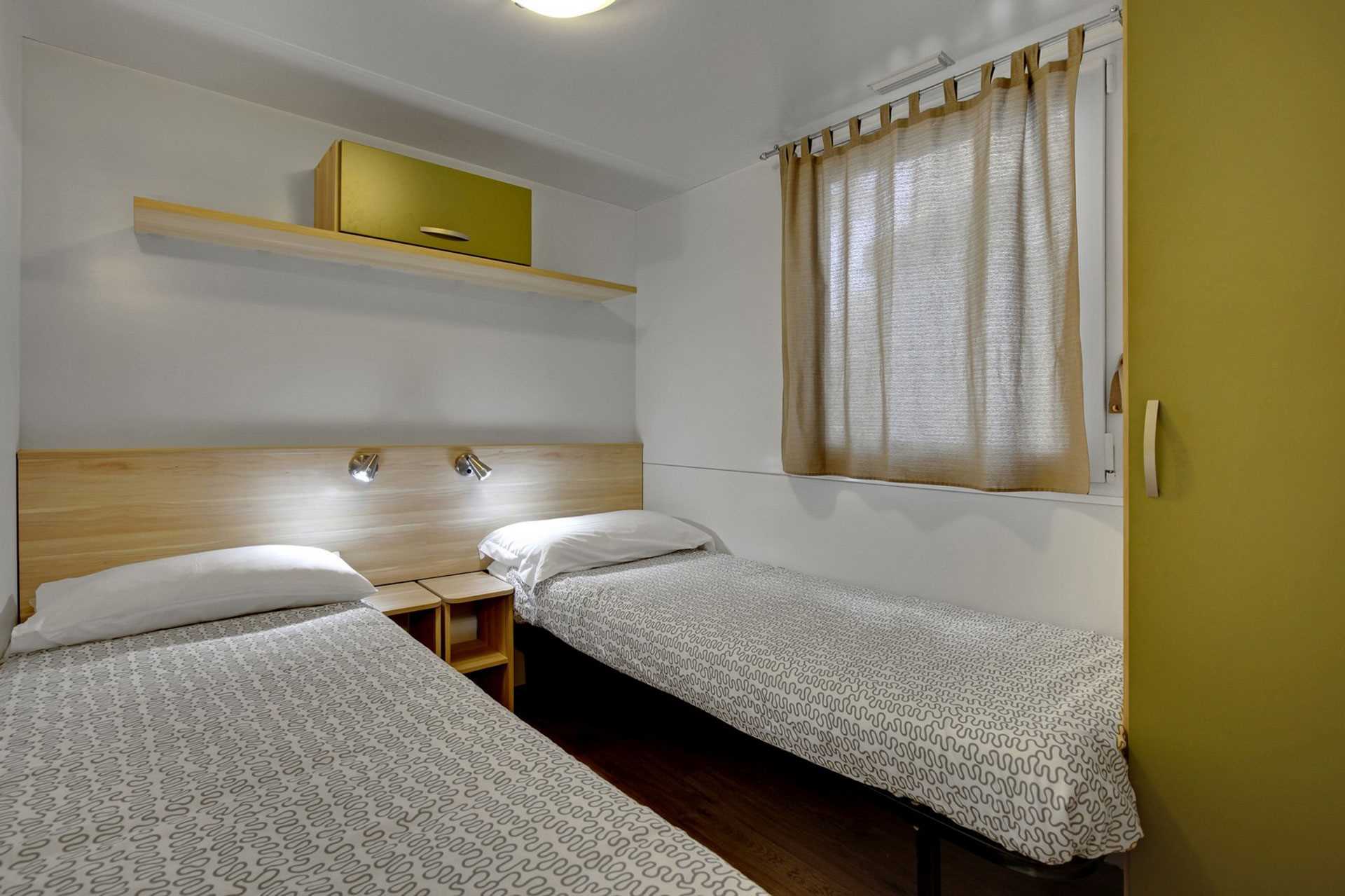 Le Mobile Home “Tigli” sono sistemazioni semplici, ideali per coppie o piccoli gruppi di amici cheviaggiano con un budget ridotto, e che cercano una soluzione abitativa semplice, comoda ed essenziale, senza rinunciare al comfort ed alla tranquillità. Dispongono di una camera composta da 3 letti singoli, sistema di climatizzazione/riscaldamento e bagno privato.