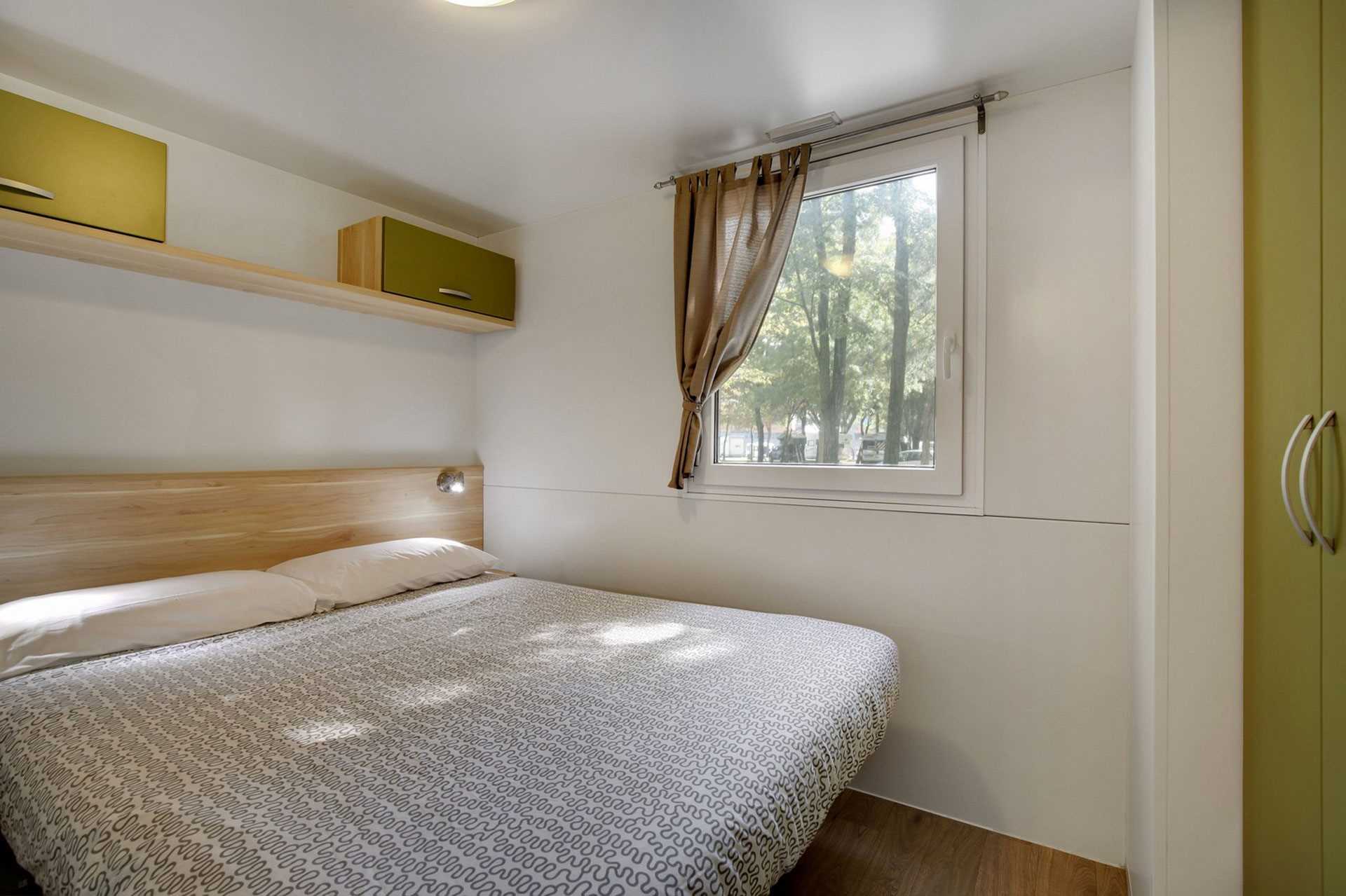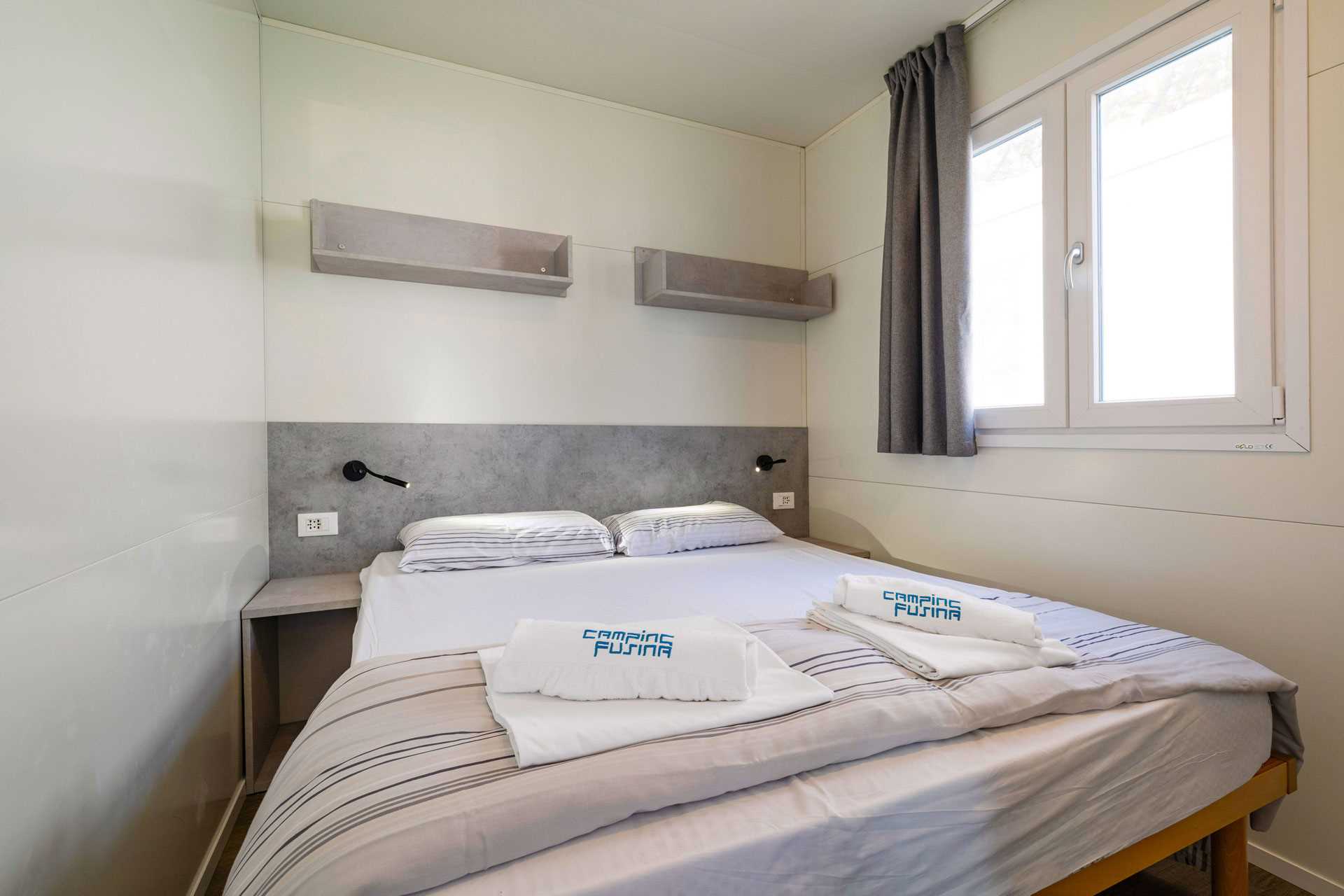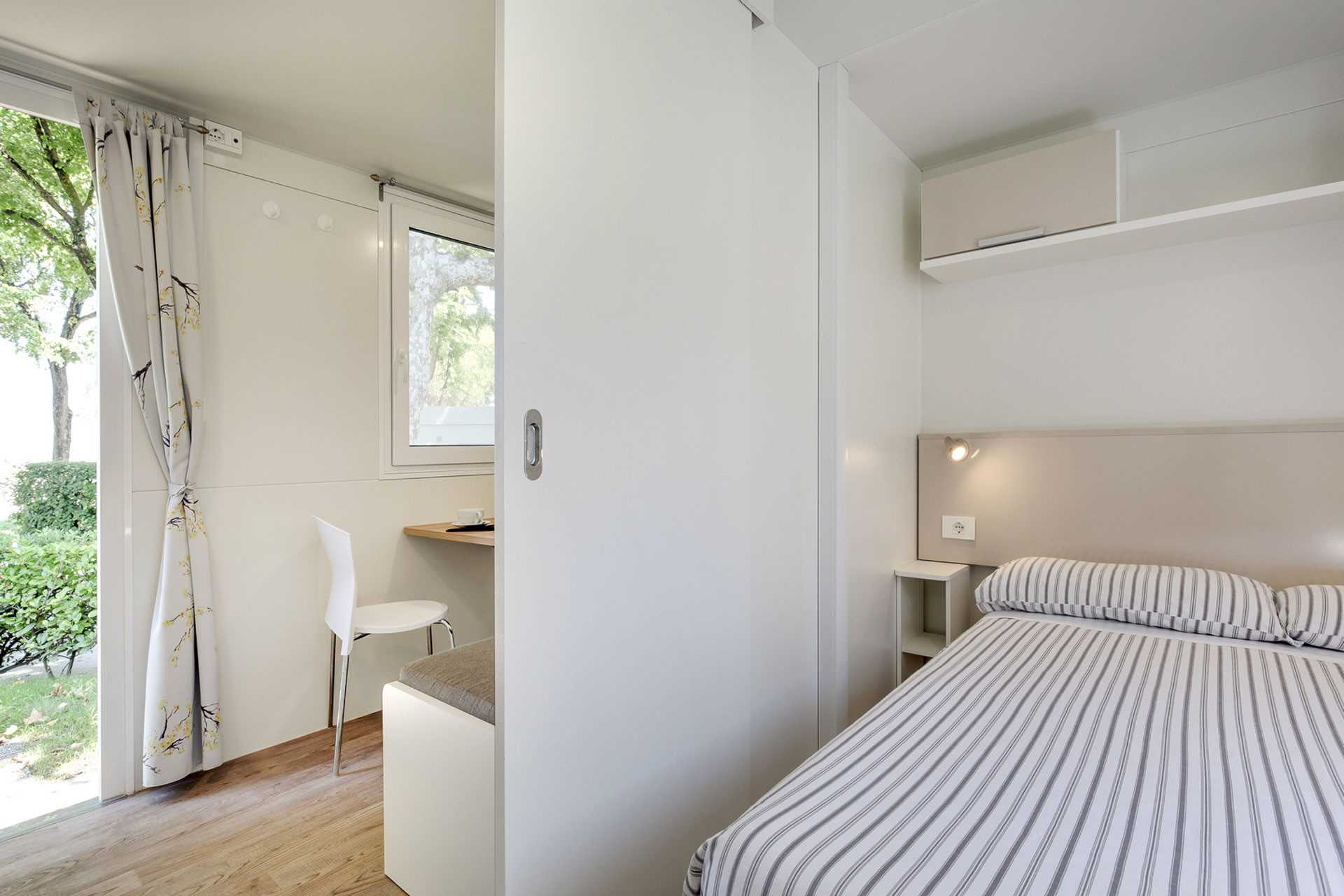 Le Mobile Home “OLMI” sono la nostra ultima eccellenza e rappresentano un nuovo modo di vivere le vacanze in campeggio. Sono soluzioni abitative dal design contemporaneo “Made in Italy” ed ogni elemento è curato nel minimo dettaglio. Oltre al sistema di climatizzazione/riscaldamento ed al bagno privato con doccia massaggiante, offrono ai visitatori una cucina completamente attrezzata con frigorifero. Dispongono di una camera con letto matrimoniale ed una camera con due letti singoli. Tutti gli ambienti si contraddistinguono per le ampie vetrate con vista sulla vegetazione esterna e su Venezia. L’alloggio dispone inoltre di un ampia terrazza esterna.