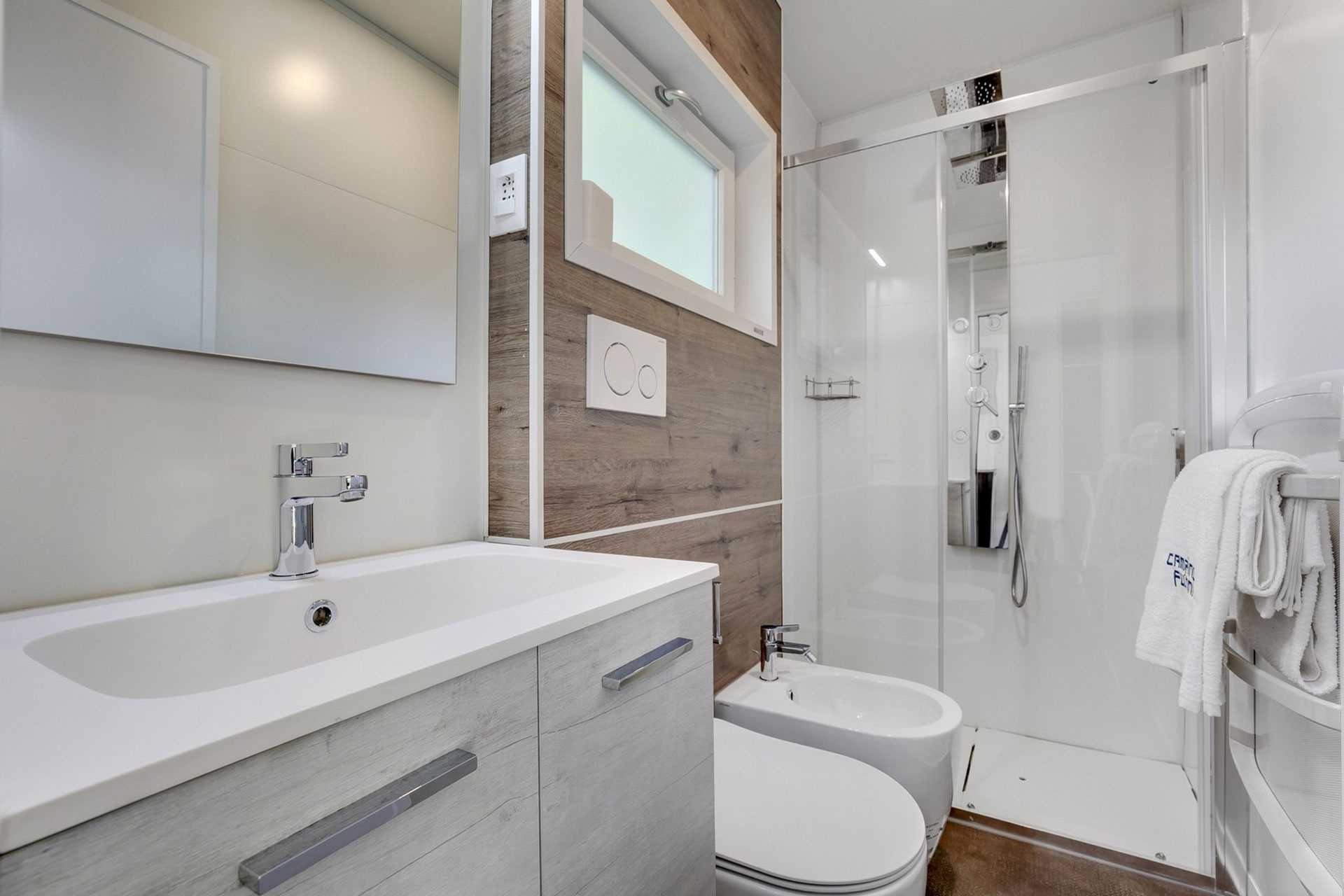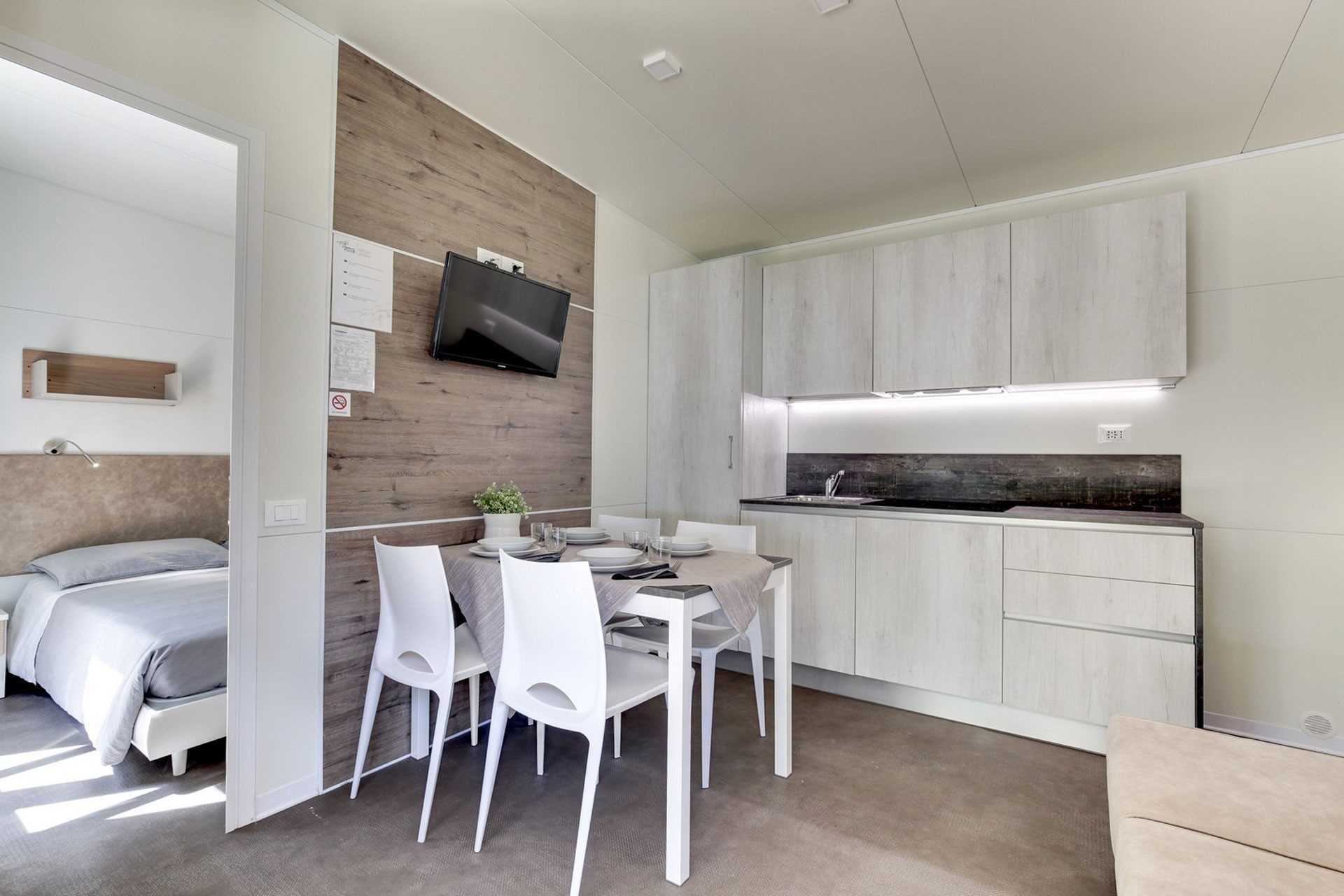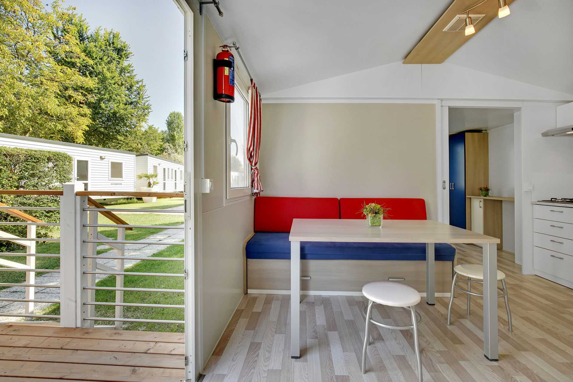Le Mobile Home “OLMI” sono la nostra ultima eccellenza e rappresentano un nuovo modo di vivere le vacanze in campeggio. Sono soluzioni abitative dal design contemporaneo “Made in Italy” ed ogni elemento è curato nel minimo dettaglio. Oltre al sistema di climatizzazione/riscaldamento ed al bagno privato con doccia massaggiante, offrono ai visitatori una cucina completamente attrezzata con frigorifero. Dispongono di una camera con letto matrimoniale ed una camera con due letti singoli. Tutti gli ambienti si contraddistinguono per le ampie vetrate con vista sulla vegetazione esterna e su Venezia. L’alloggio dispone inoltre di un ampia terrazza esterna.