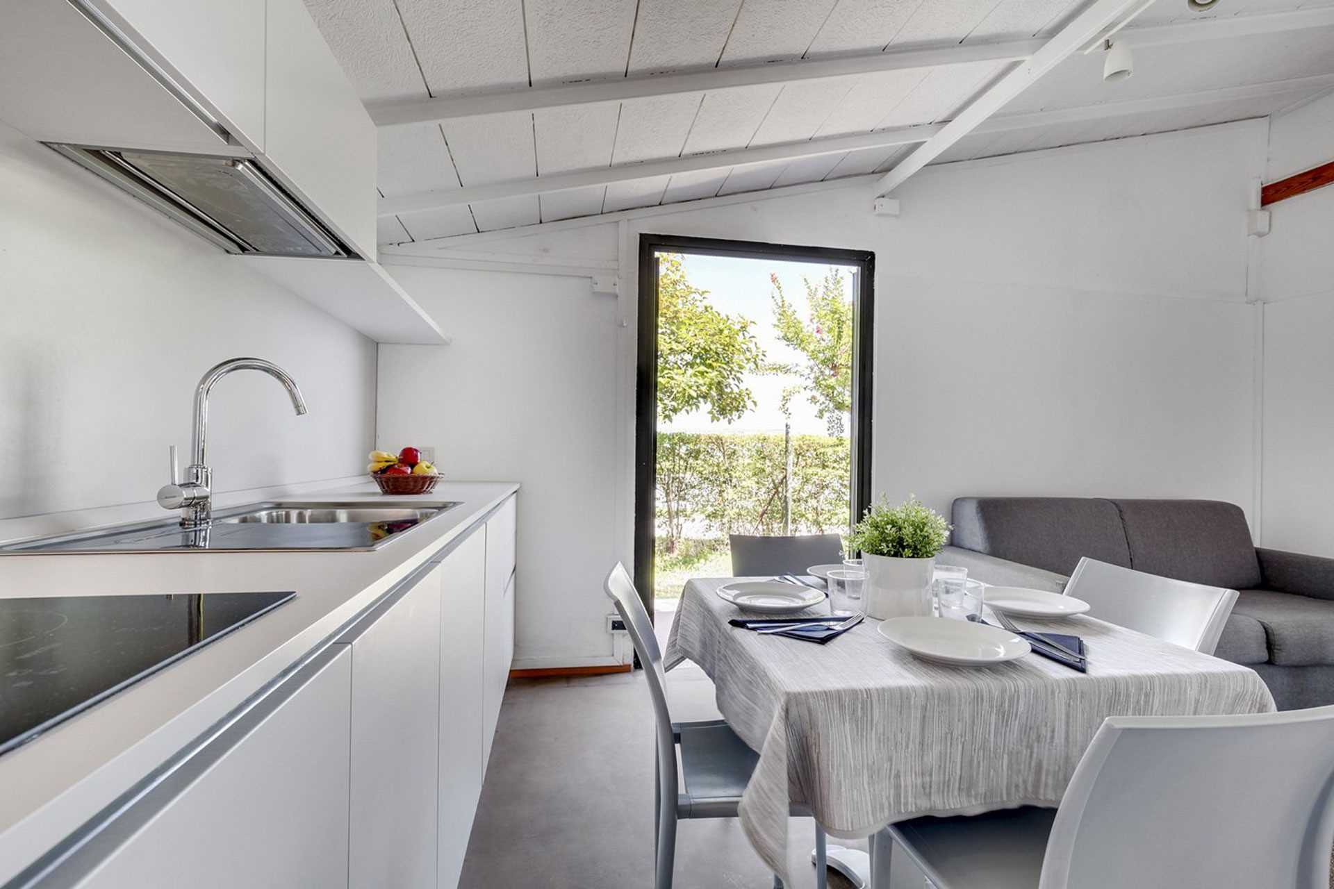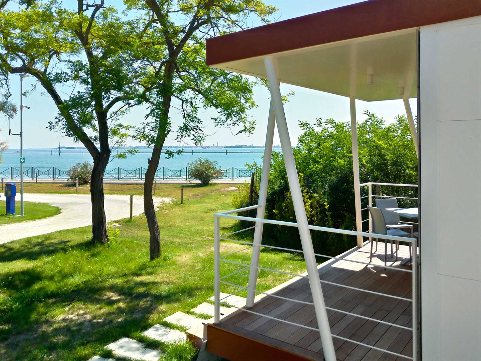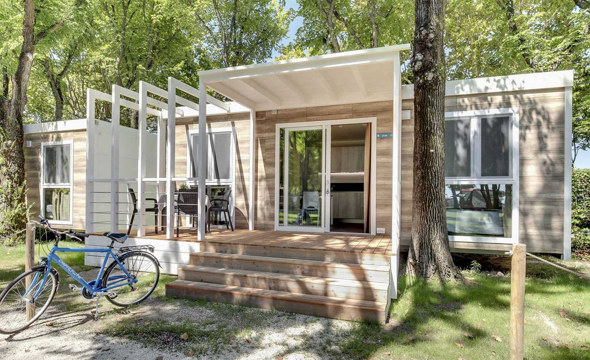 Le Mobile Home “TAMERICI DESIGN LODGE” uniscono l’elevato standard del design “Made in Italy” ad un alto livello di comfort abitativo e sono l’ideale per soggiorni di media-lunga durata. L’area giorno, tramite l’ampia vetrata di ingresso, si affaccia sulla terrazza esterna immersa nel verde con vista privilegiata sulla Laguna di Venezia. Dispongono di una camera con letto matrimoniale ed una cameracon due letti singoli, divano letto, cucina moderna completamente attrezzata con frigorifero, bagno privato, impianto di condizionamento/riscaldamento autonomo. La soluzione ideale per famiglie alla ricerca di una vacanza rilassante all’aria aperta