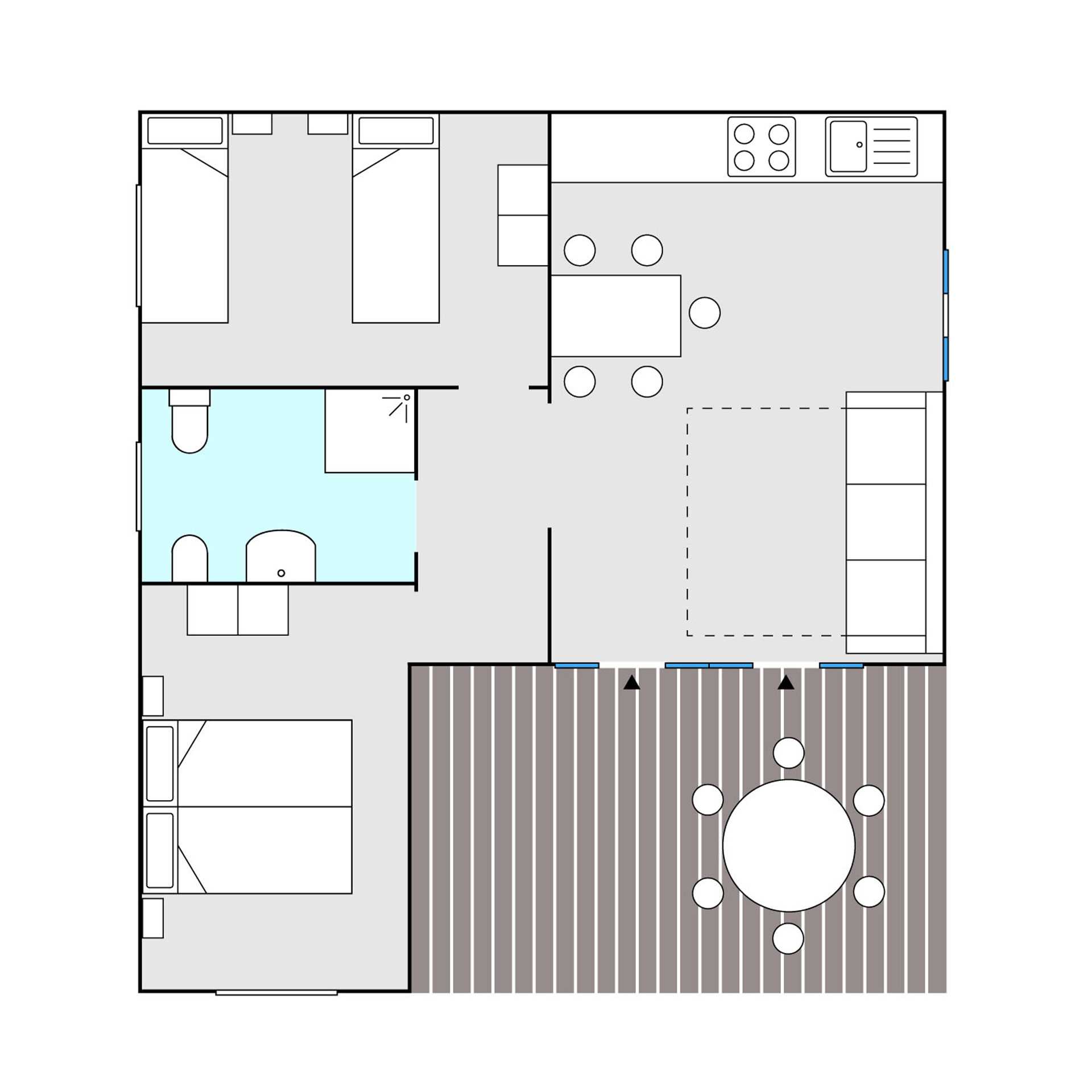 Le Mobile Home “Pini” uniscono l’eleganza, il comfort e la cura dei dettagli all’ampiezza degli spazi.Sono unità abitative adatte anche ai clienti con mobilità ridotta.Dispongono di due camere da letto, ampio soggiorno con cucina attrezzata, bagno privato con doccia a filo pavimento, climatizzazione/riscaldamento.Sono posizionate nella pineta a poca distanza dalla piscina.