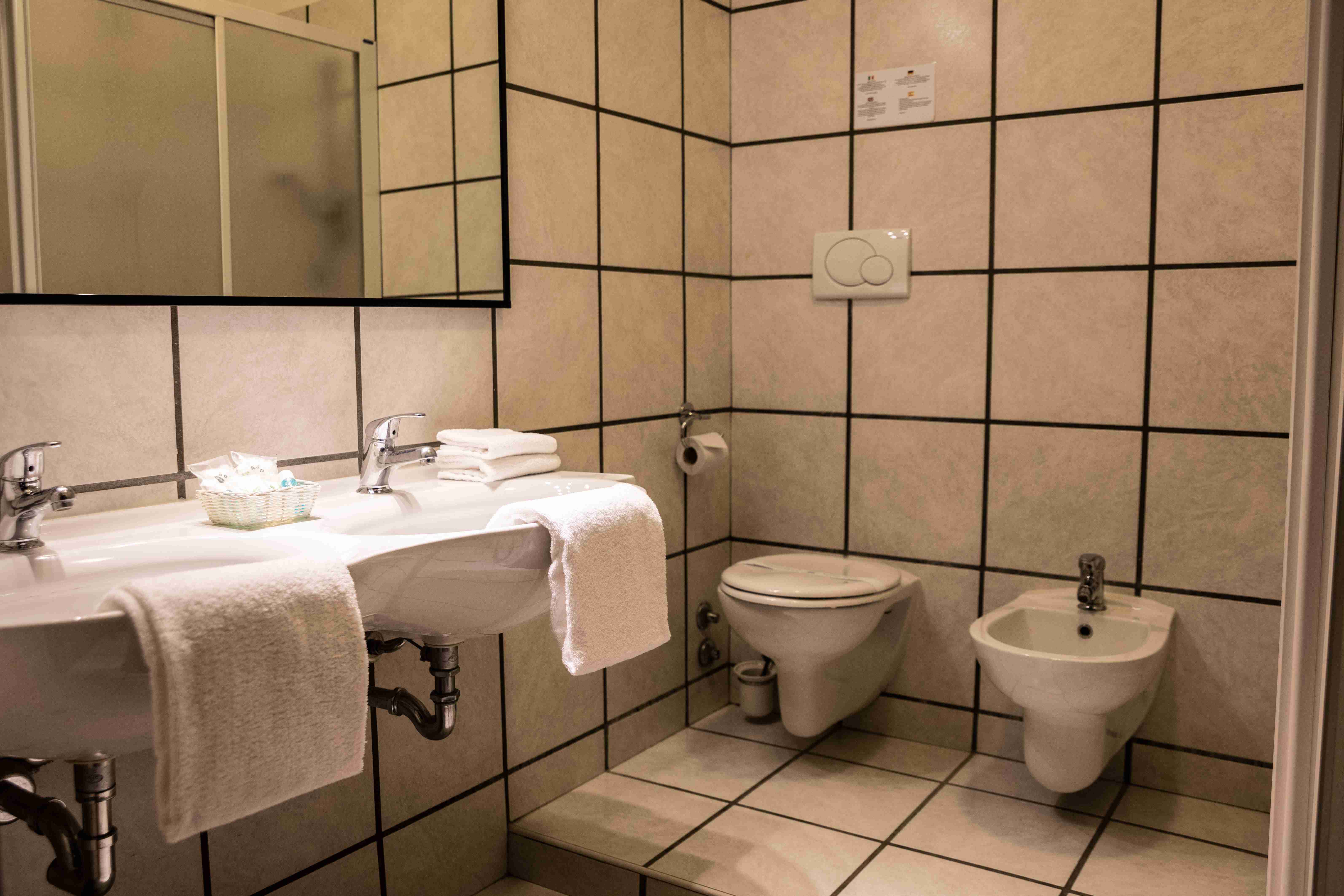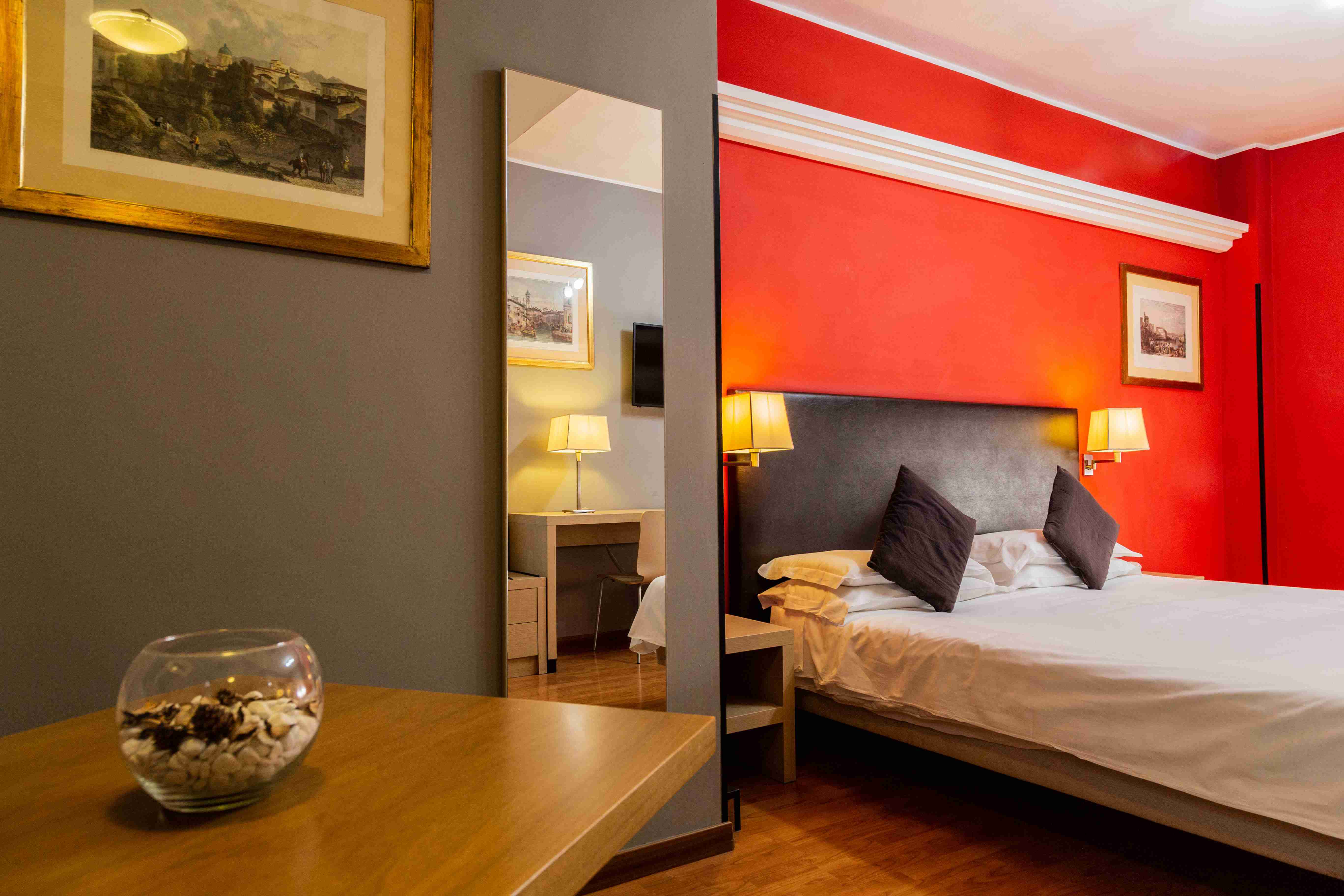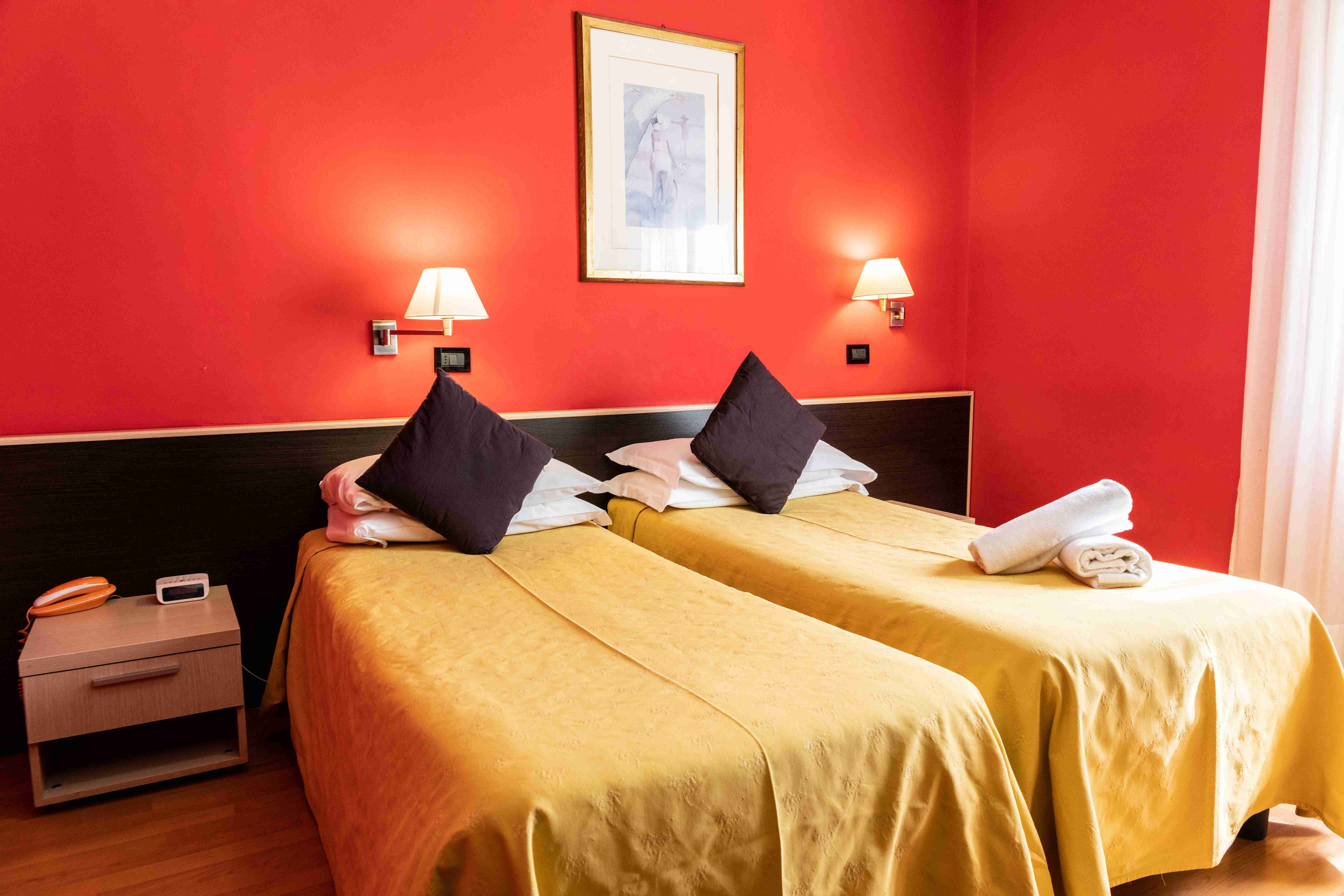 Camera per tre persone con letto matrimoniale più letto singolo, oppure con tre letti singoli. Confortevole e perfetta per piccoli nuclei famigliari o gruppi di lavoro.