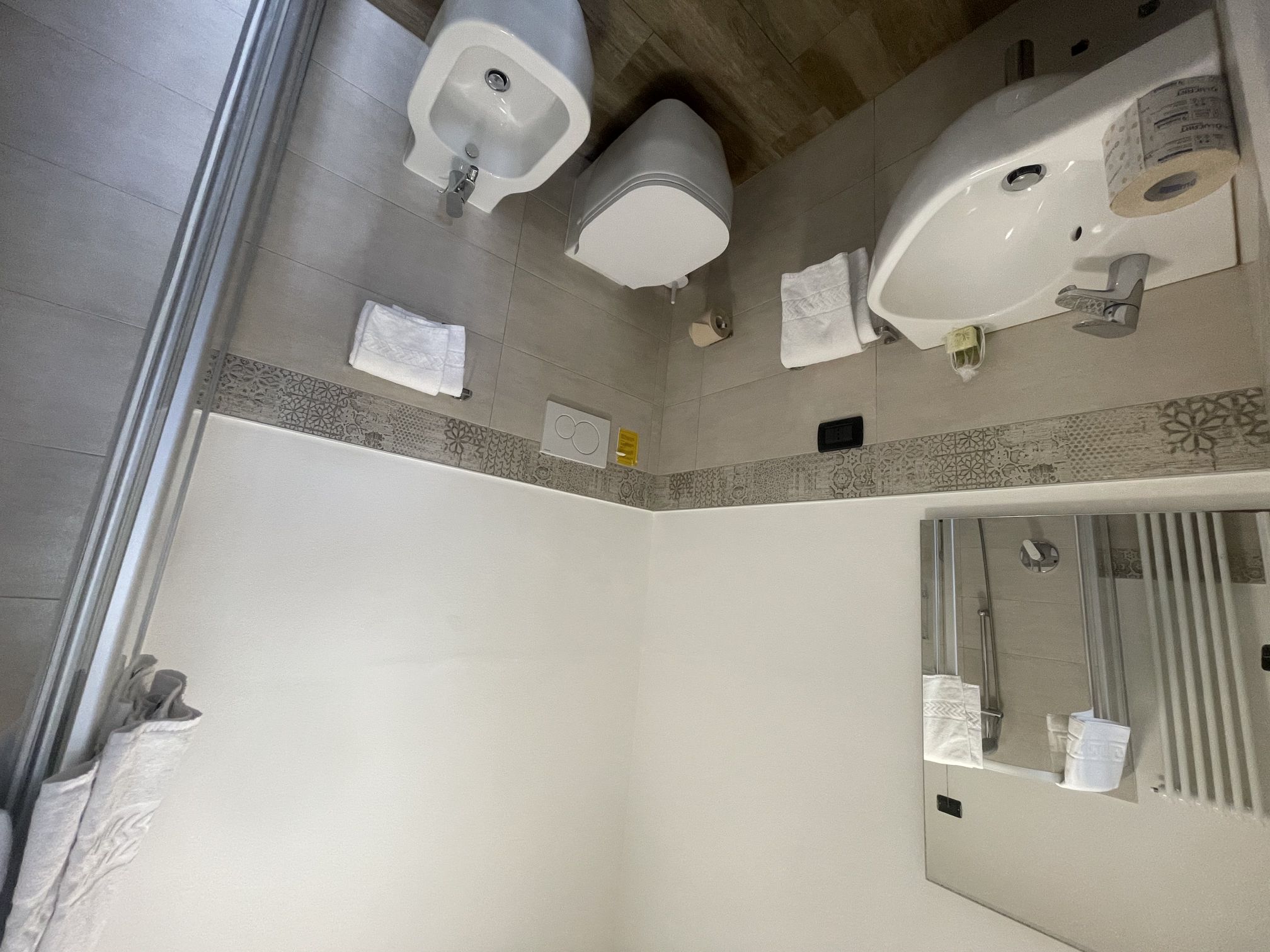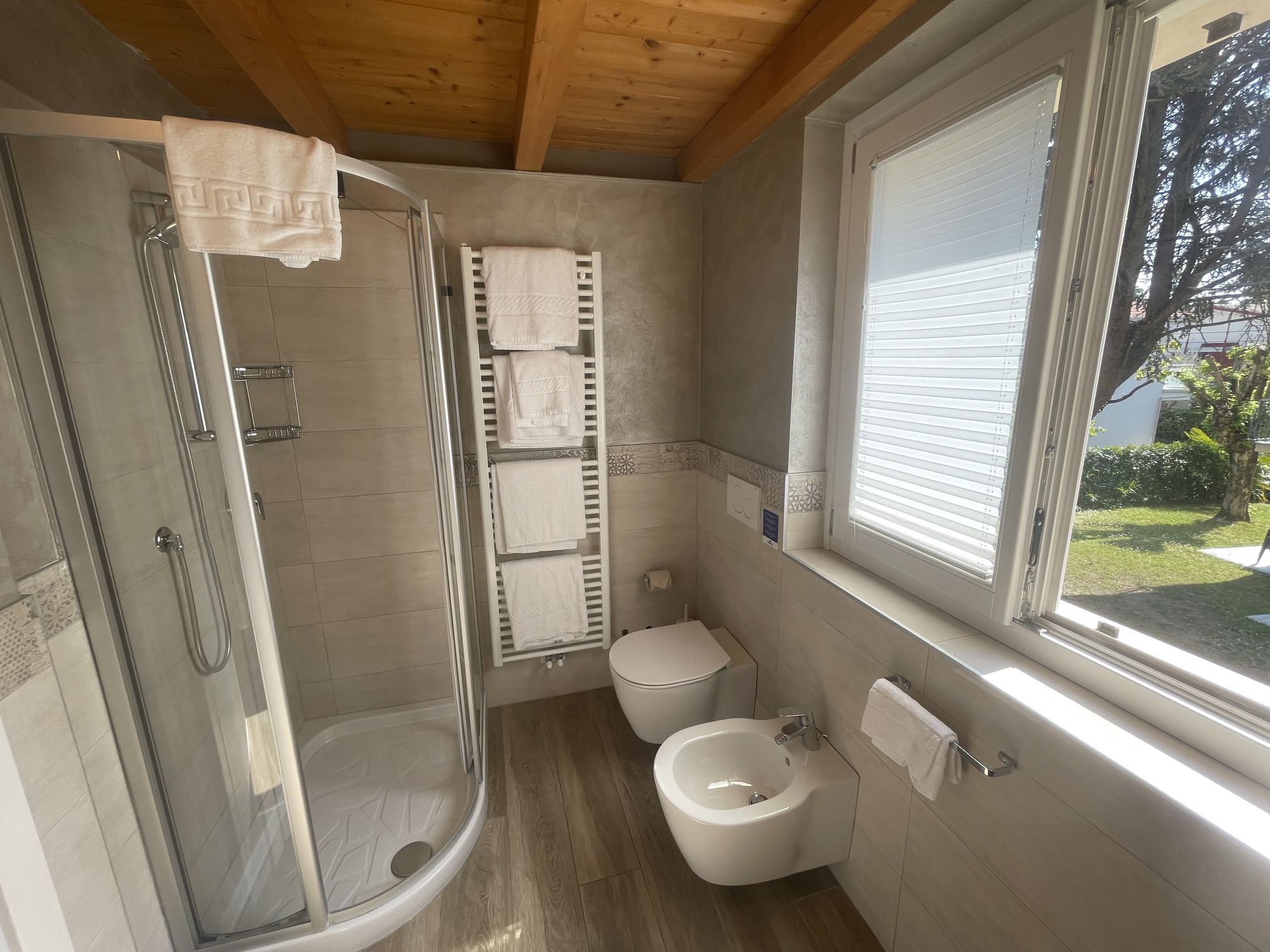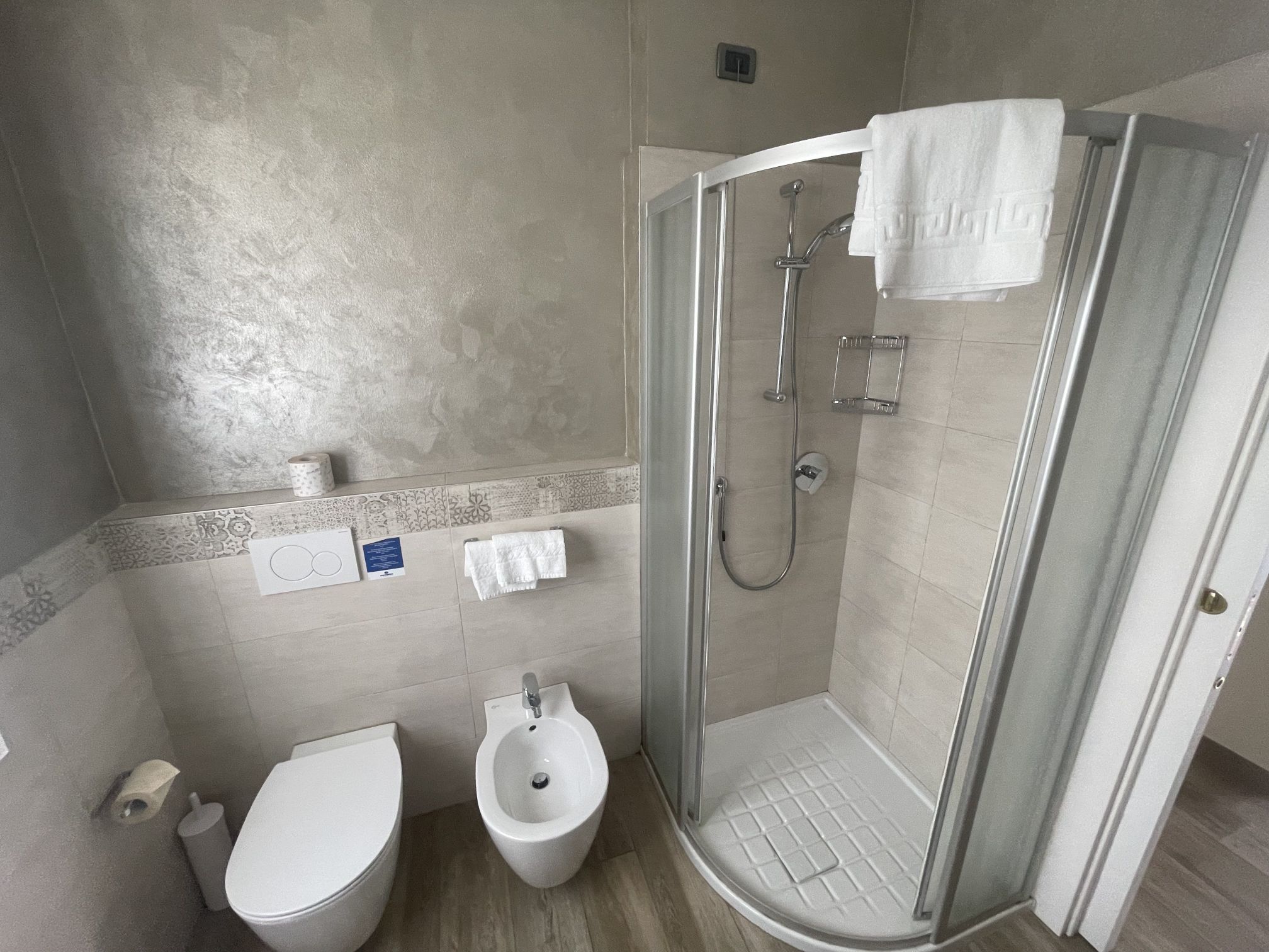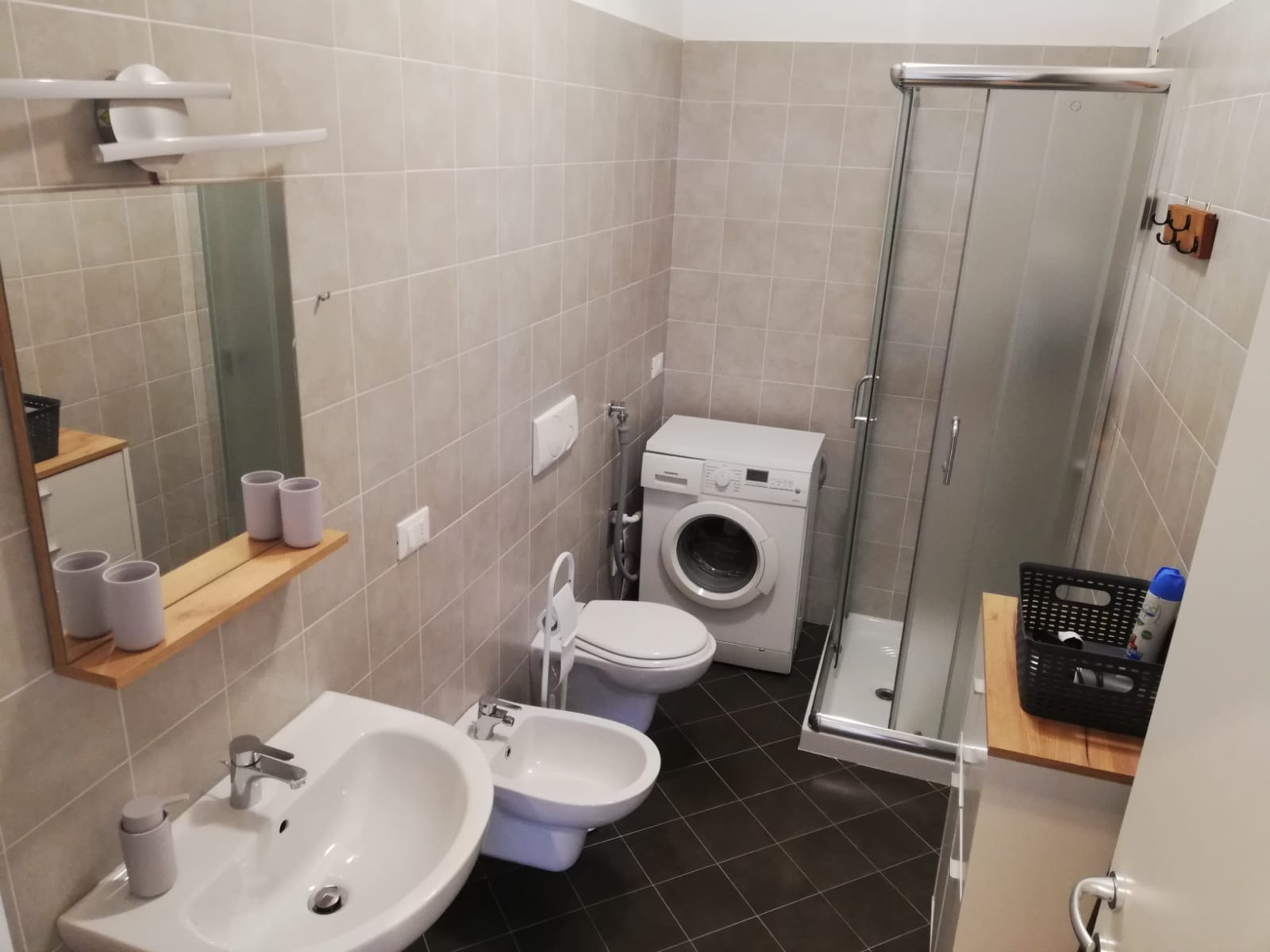 - Bagno moderno con doccia, WC, bidet e lavatrice