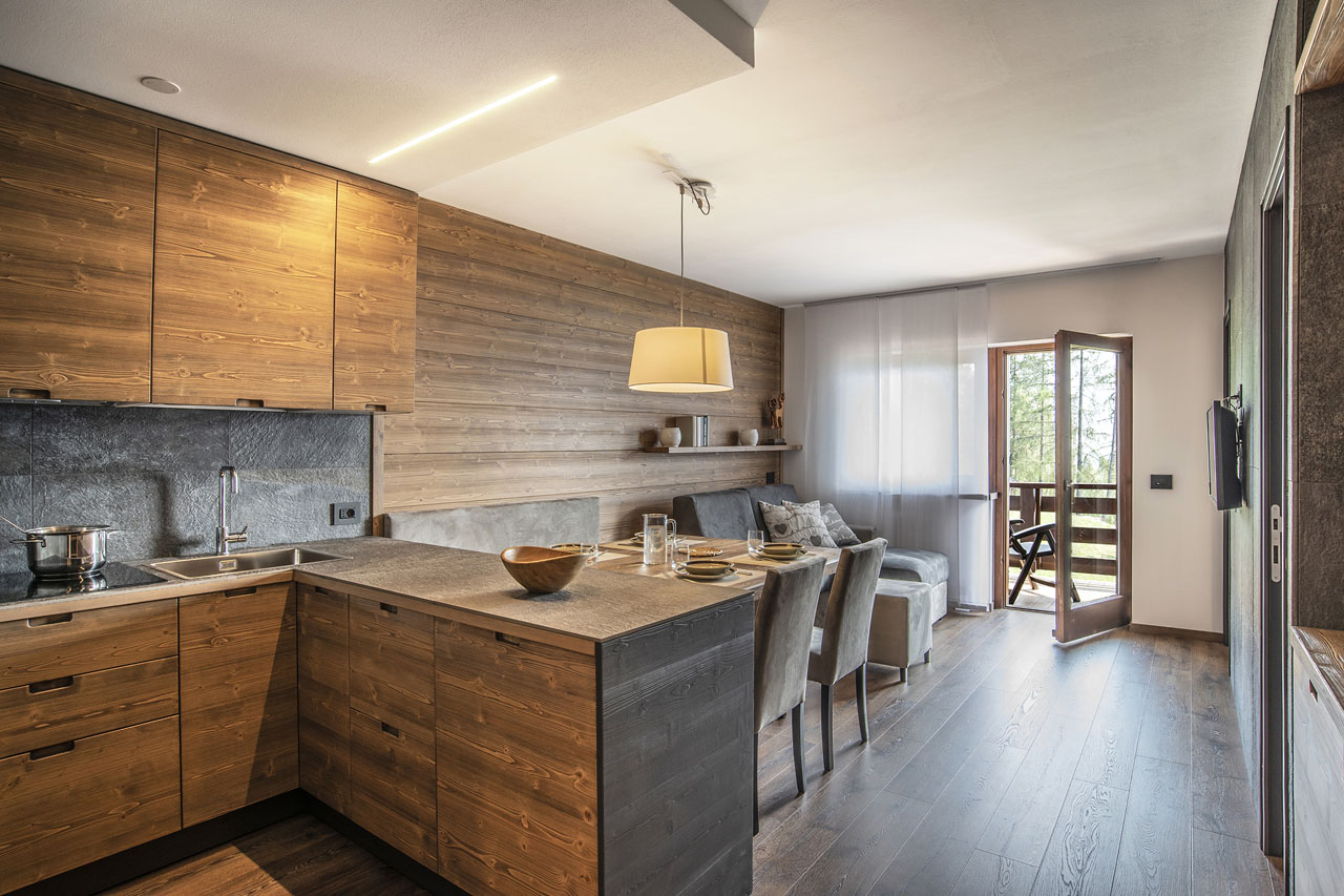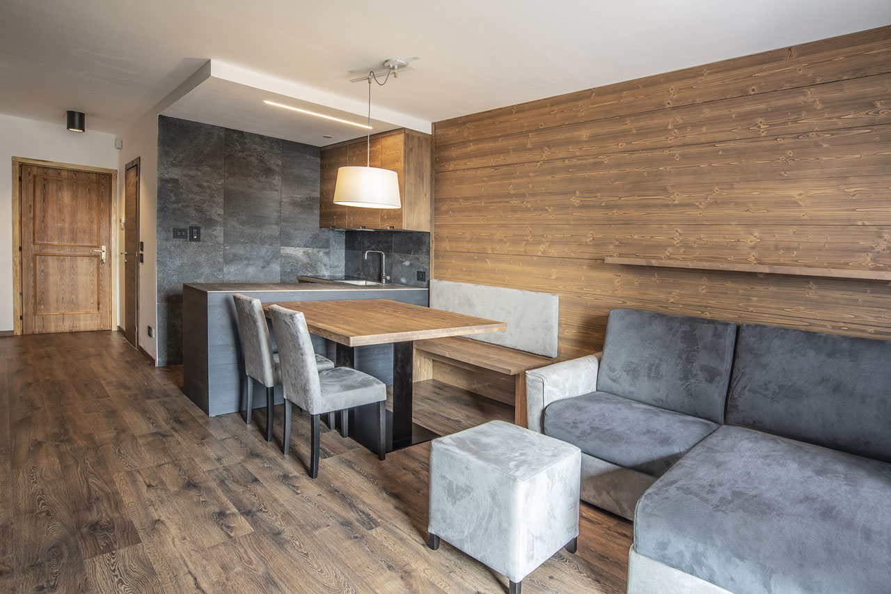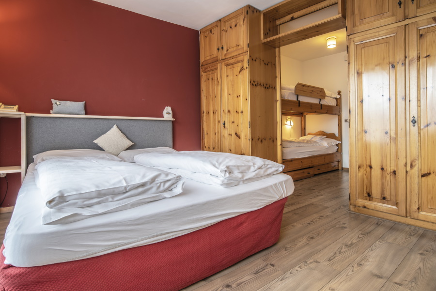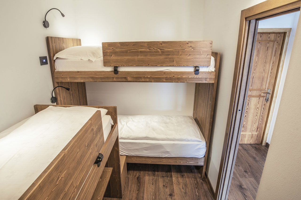 Appartamento ristrutturato e con arredi moderni ma sempre in stile montano. Soggiorno con angolo cottura e balcone, camera matrimoniale, camera con letto a castello e letto singolo, bagno con doccia.