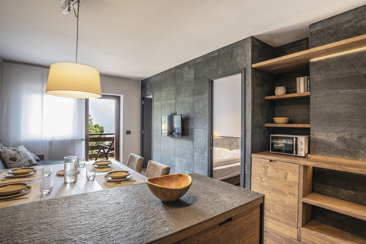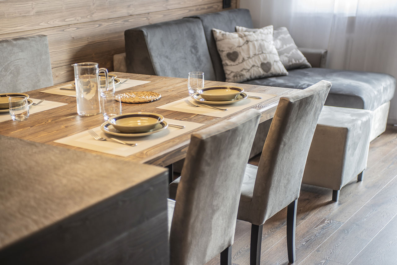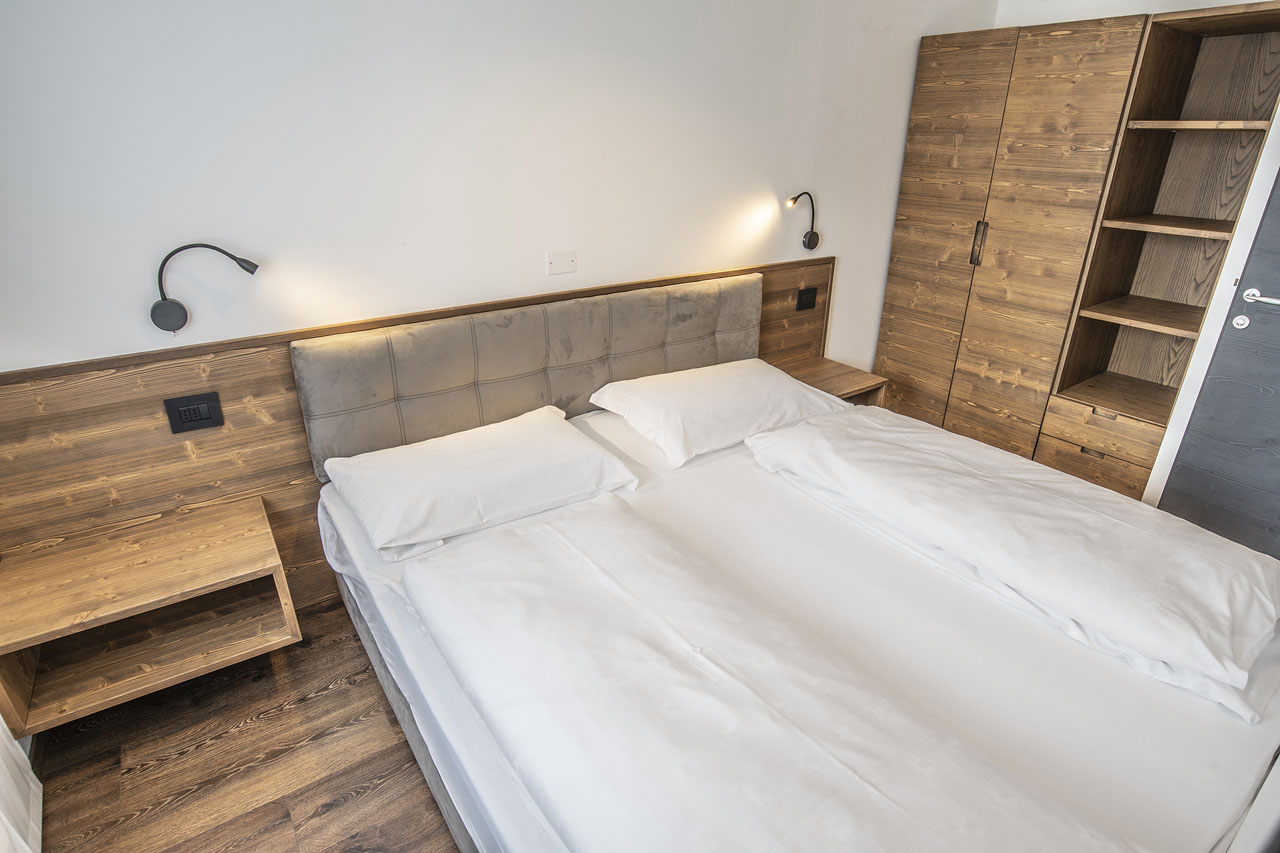 Appartamento ristrutturato e con arredi moderni ma sempre in stile montano. Soggiorno con angolo cottura e balcone, camera matrimoniale, camera con letto a castello e letto singolo, bagno con doccia.