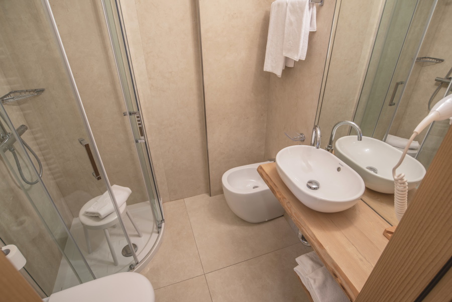 Ambiente moderno e raffinato con letto matrimoniale, possibilità di aggiunta di una culla o letto singolo, bagno con doccia, asciugacapelli, TV satellitare, Balcone. A disposizione morbido accappatoio.