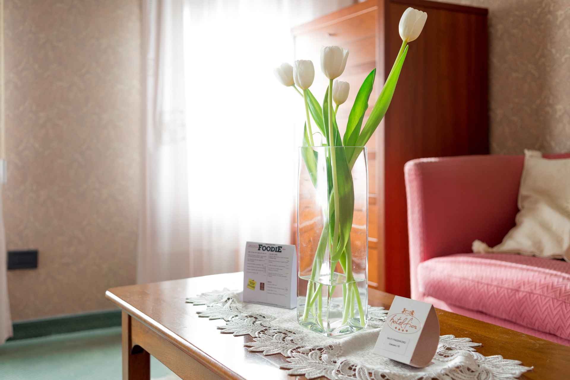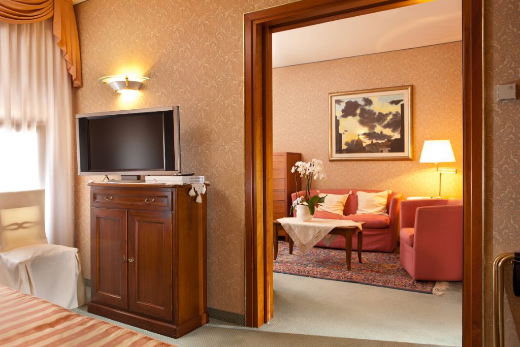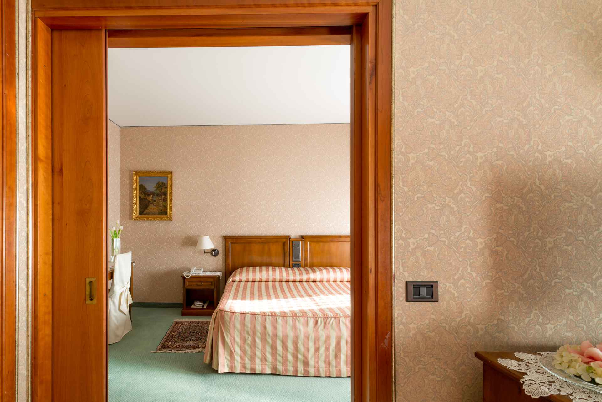Un grazioso salottino dotato di tv precede il vostro accesso in camera. Con vista sul parco la nostra junior suite è un esempio di eleganza e classicità.