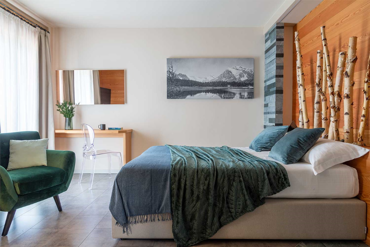 Quadruple Superior, ricche di dettagli selezionati con cura, ristrutturate con l'utilizzo di materiali naturali per garantire un eccellente comfort, caratterizzate da un'atmosfera calda ed accogliente data da rivestimenti in legno e pietra, impreziositi da dettagli che lasciano un' impronta di stile e dotate di balconi o terrazzo con vista verso le montagne e la valle o il giardino.