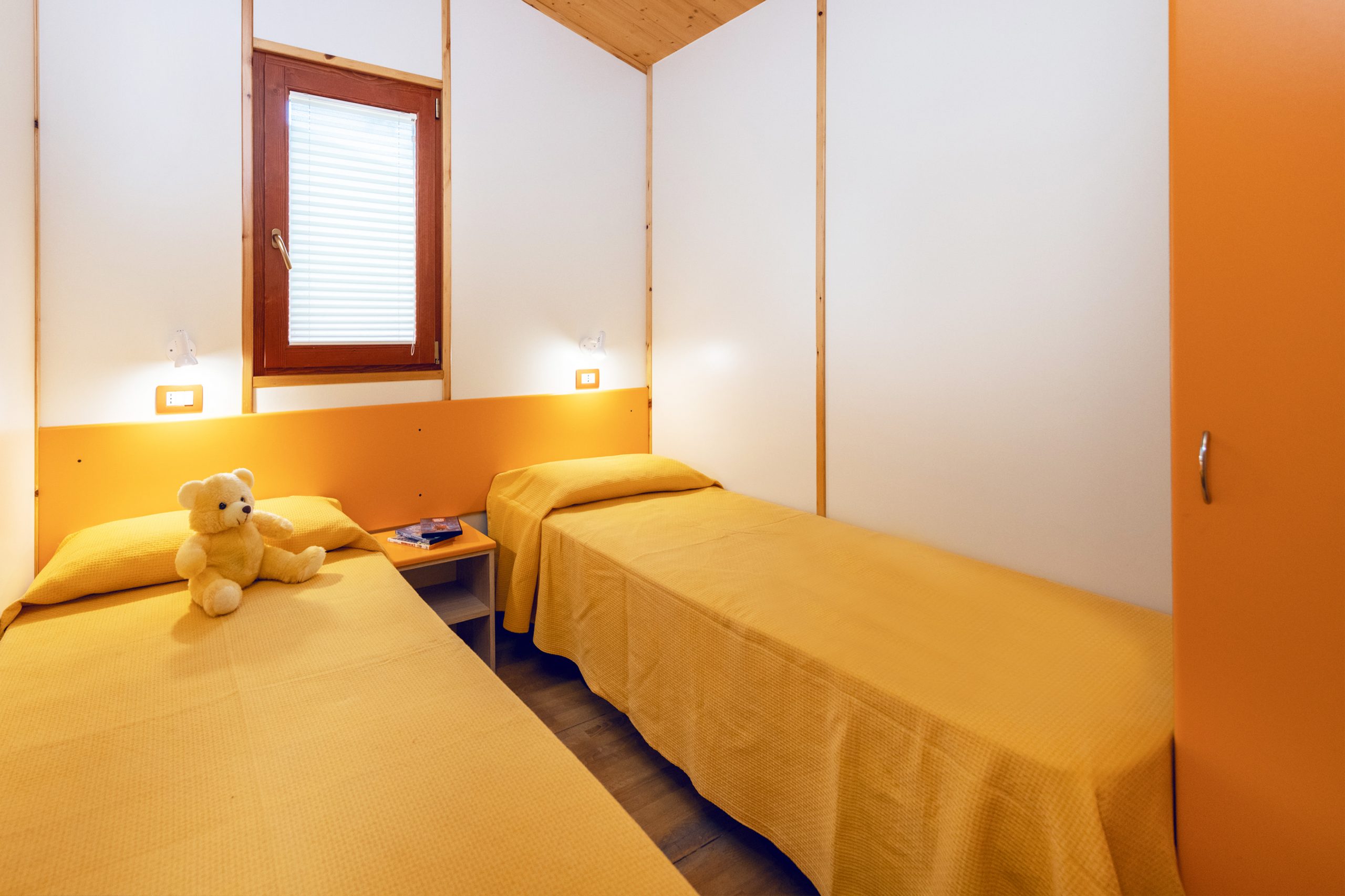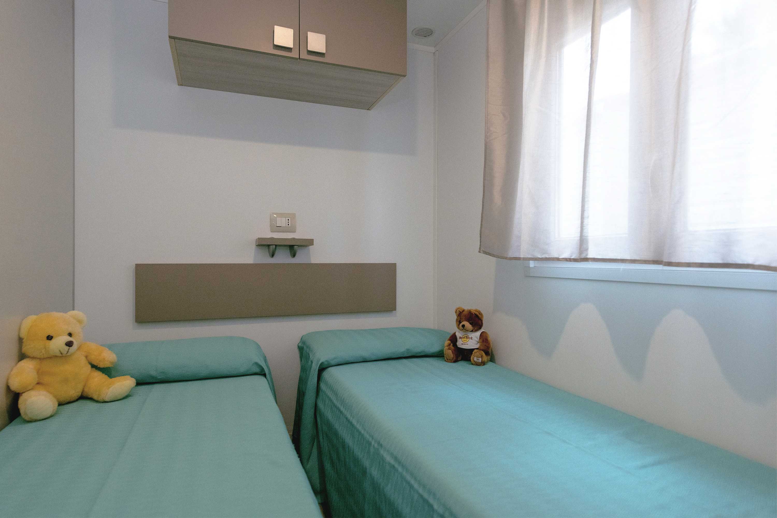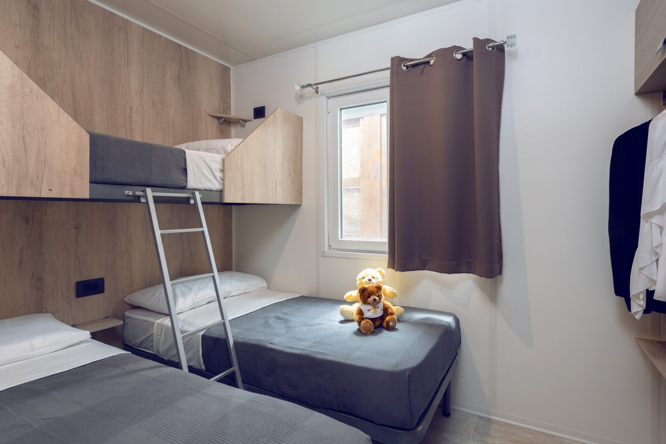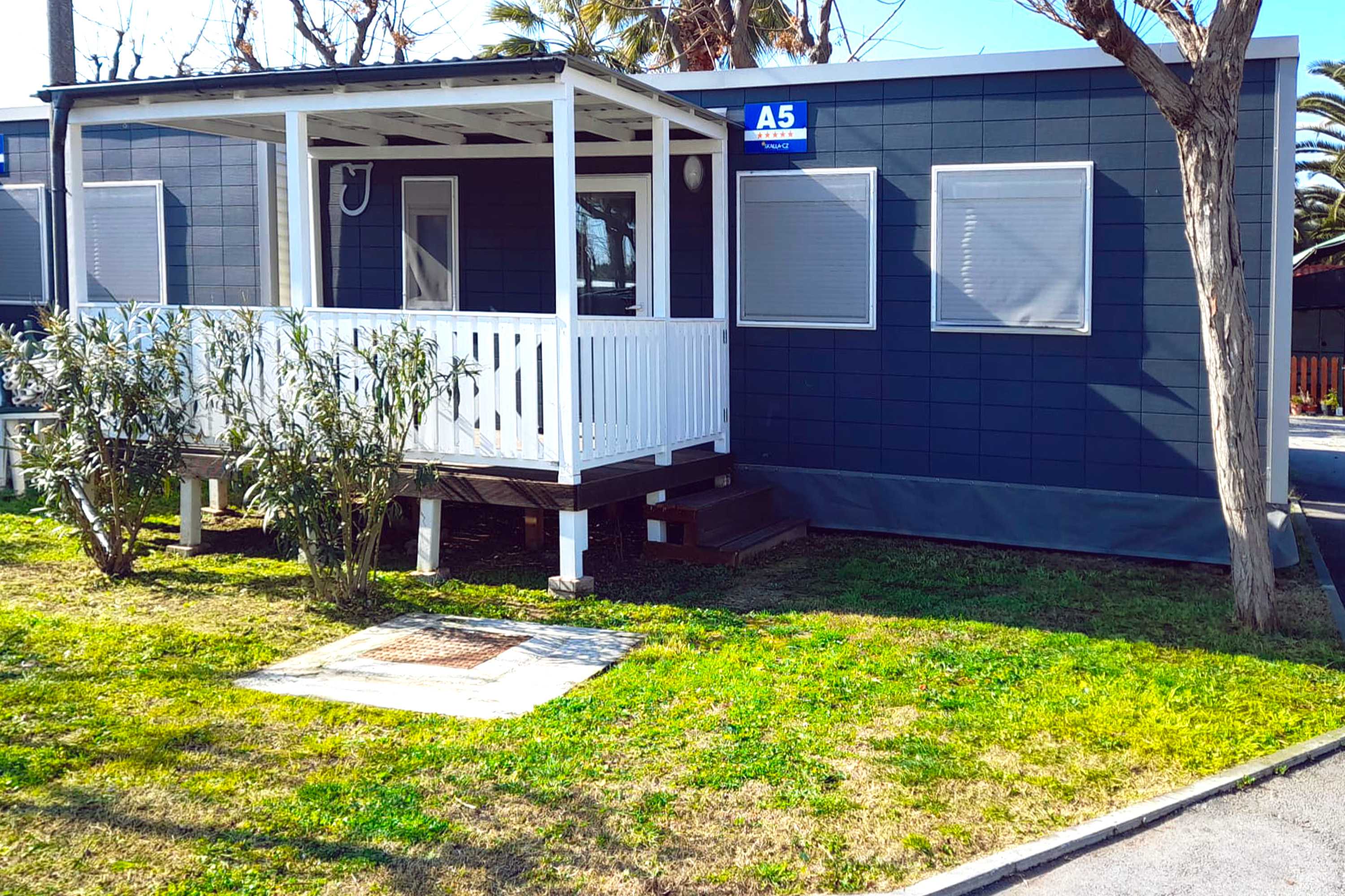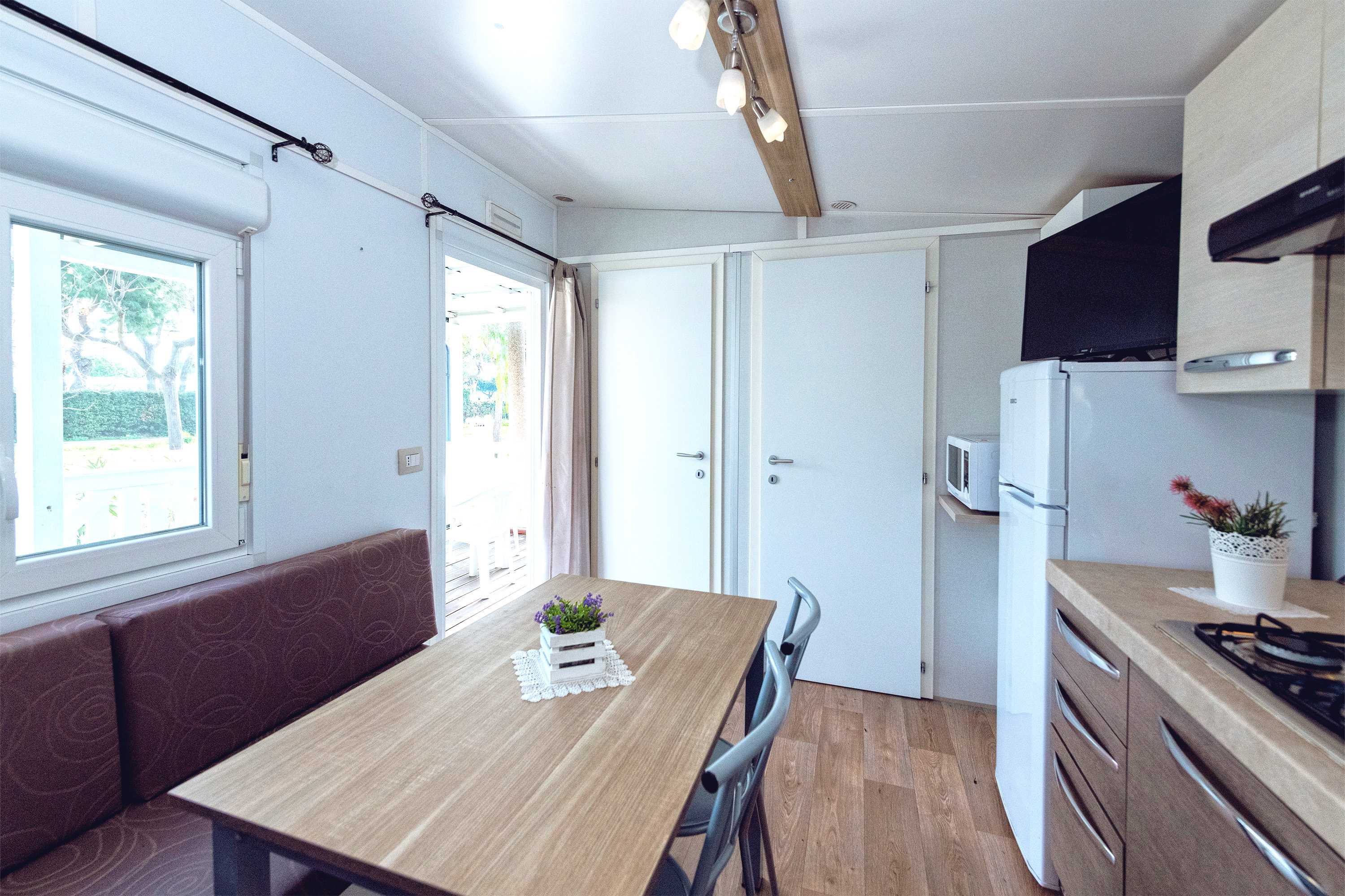 Casamobile trilocale in legno con veranda e giardino, angolo cottura,stoviglie, bicchieri, tazze e pentole, forno a micro onde, lavastoviglie, bagno, doccia, acqua calda, TV. Dispone di 1 posto letto matrimoniale, 2 posti letto singoli + 1 posto letto singolo a castello, 1 divano letto singolo in soggiorno . Parcheggio auto interno. Servizio spiaggia con un ombrellone, un lettino, una sdraio, connessione Wifi, Animazione e Miniclub, climatizzazione e ingresso in piscina.