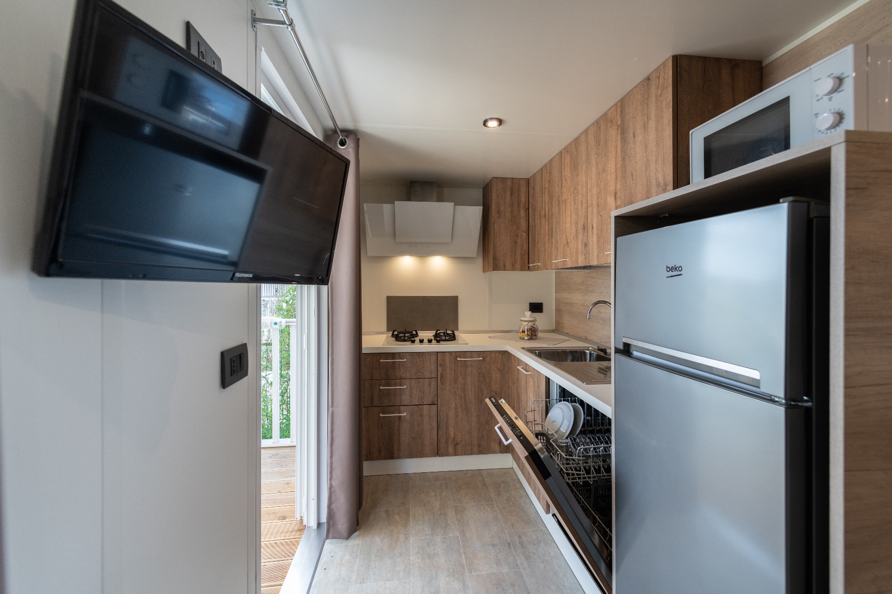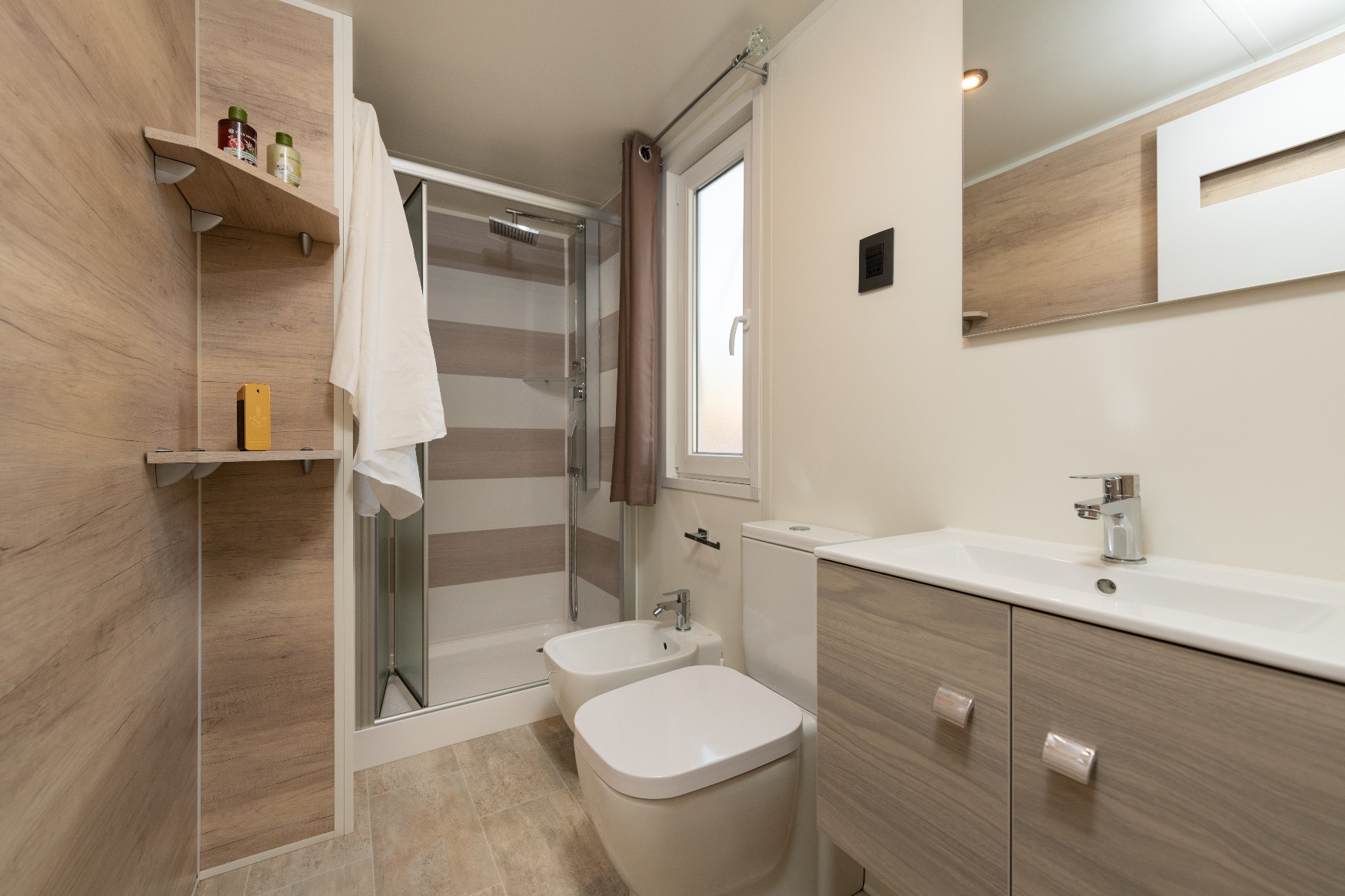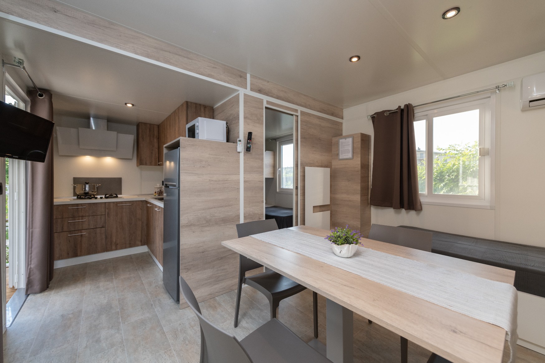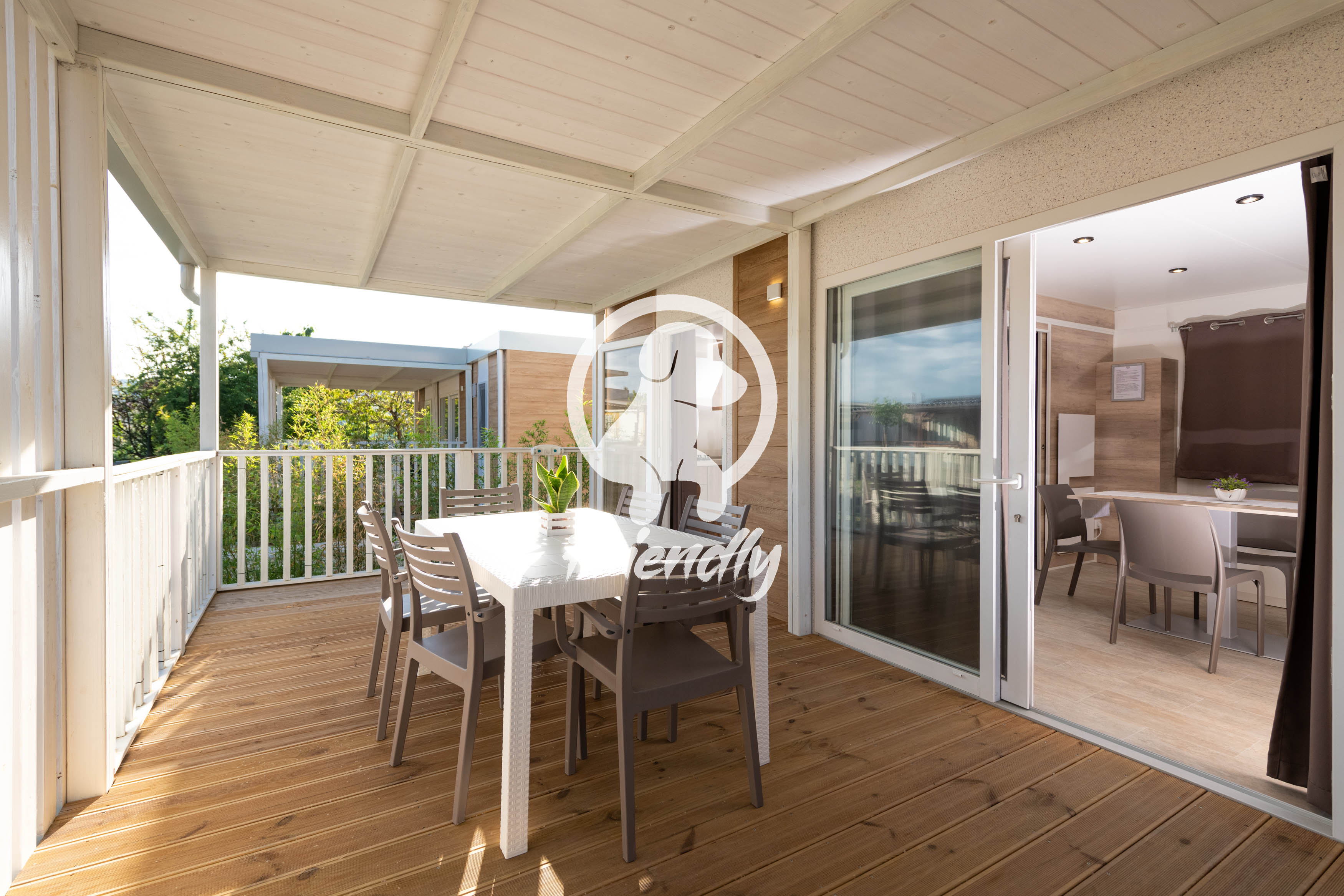 Casamobile trilocale in legno con veranda e giardino, angolo cottura,stoviglie, bicchieri, tazze e pentole, forno a micro onde, lavastoviglie, bagno, doccia, acqua calda, TV. Dispone di 1 posto letto matrimoniale, 2 posti letto singoli + 1 posto letto singolo a castello, 1 divano letto singolo in soggiorno . Parcheggio auto interno. Servizio spiaggia con un ombrellone, un lettino, una sdraio, connessione Wifi, Animazione e Miniclub, climatizzazione e ingresso in piscina.