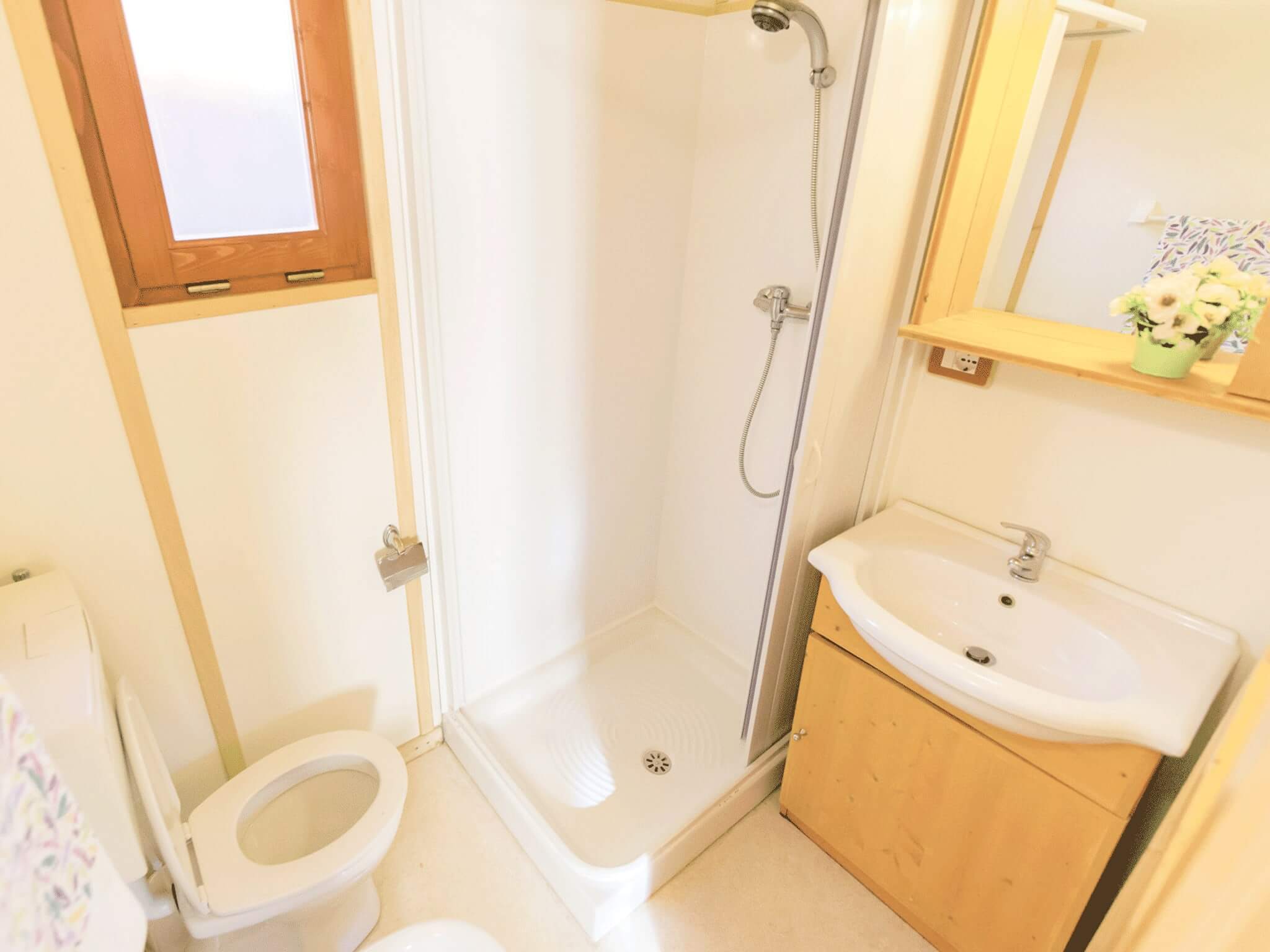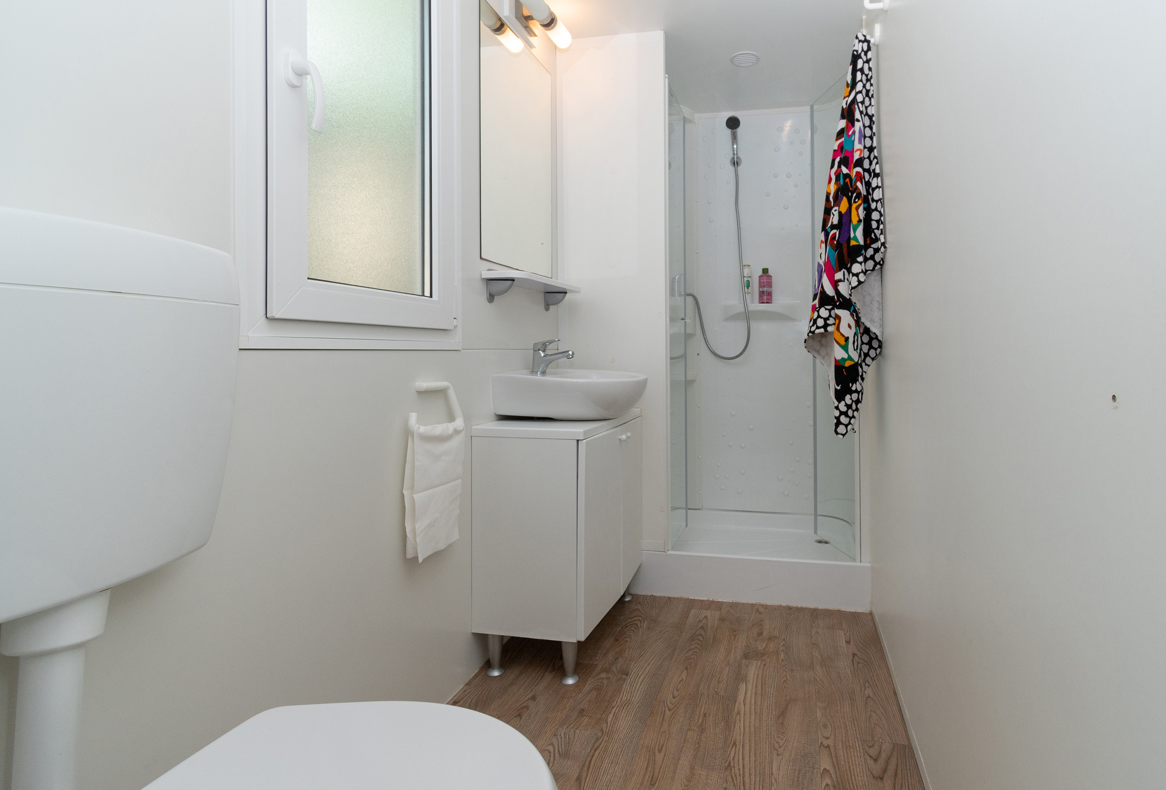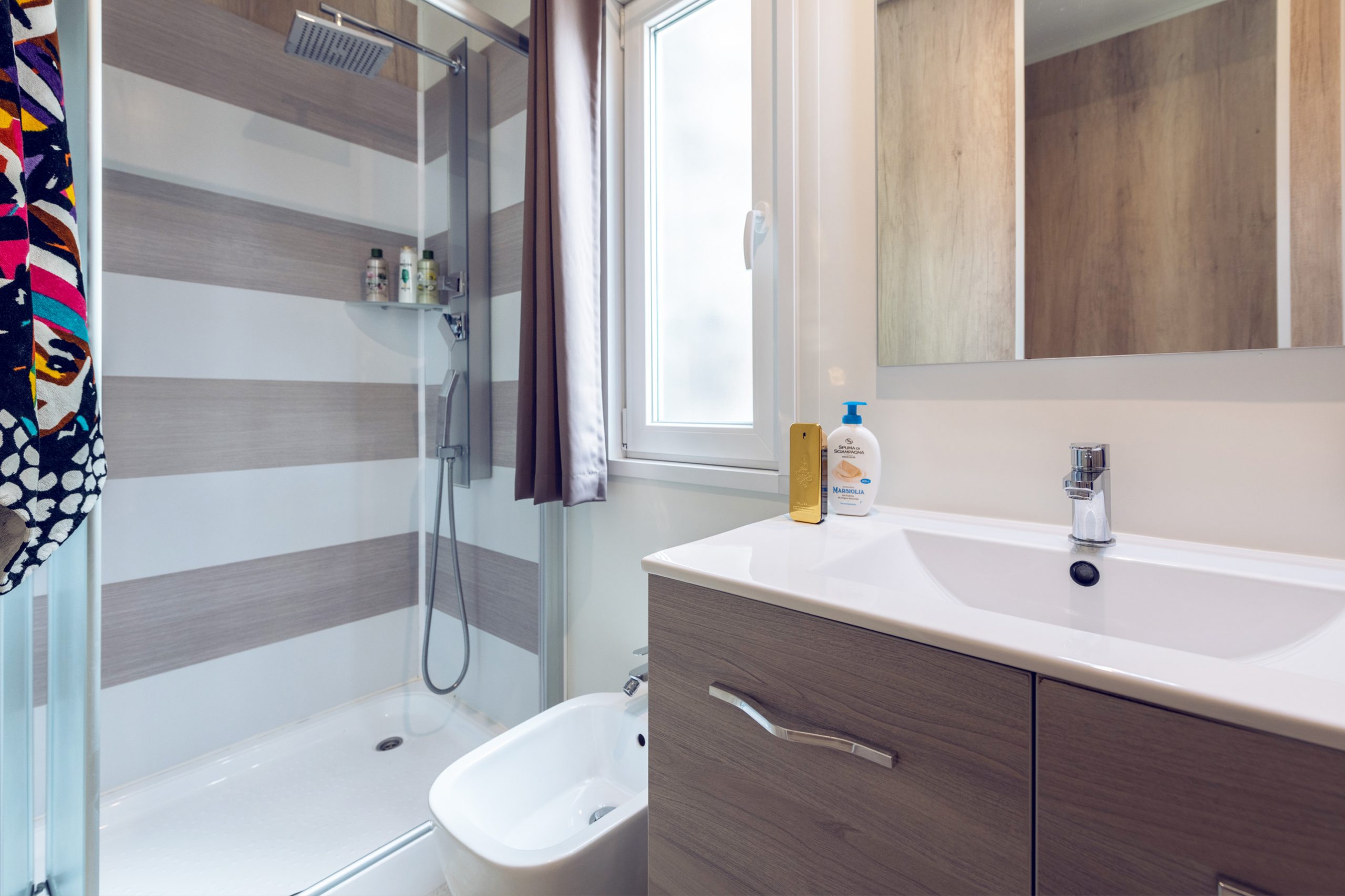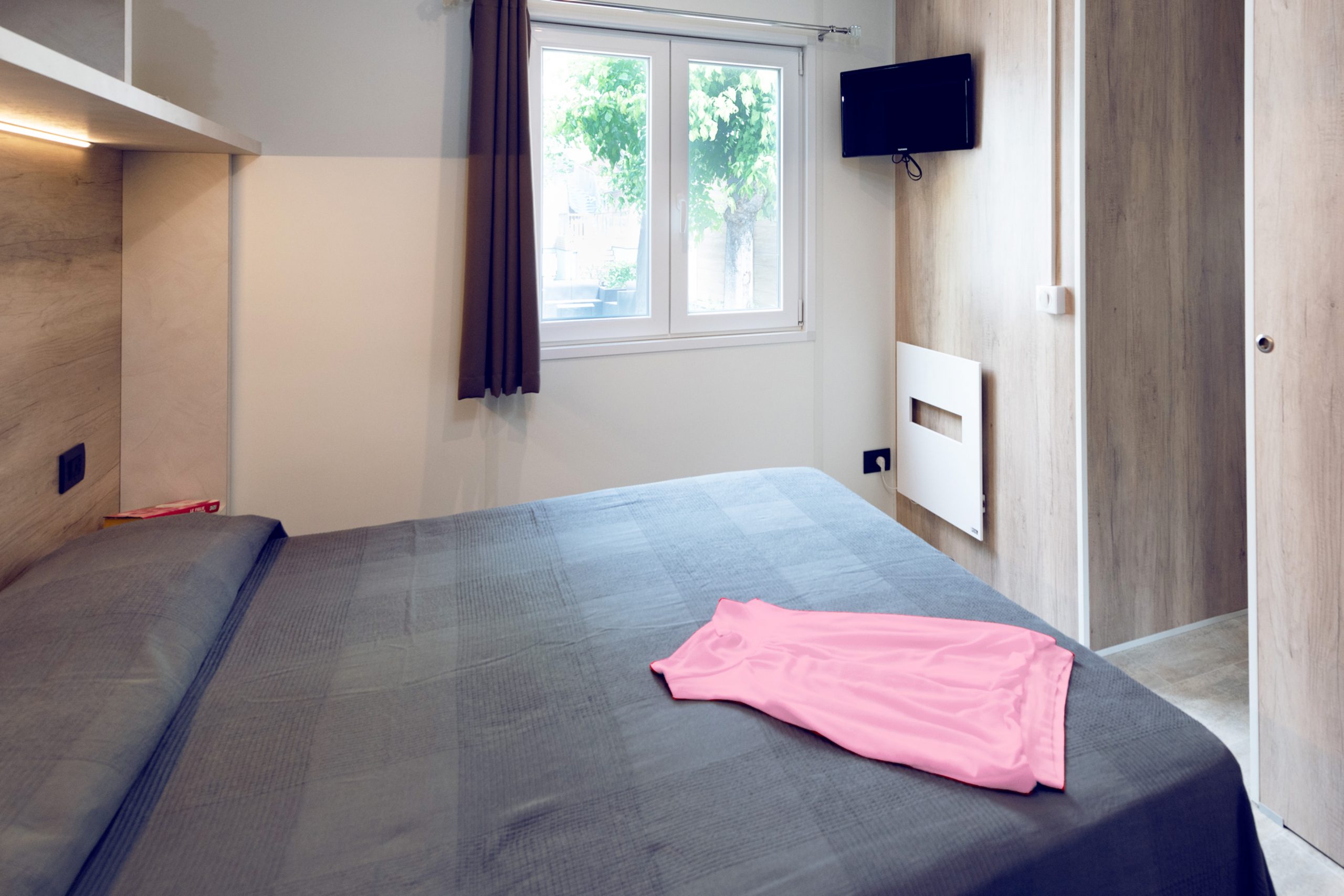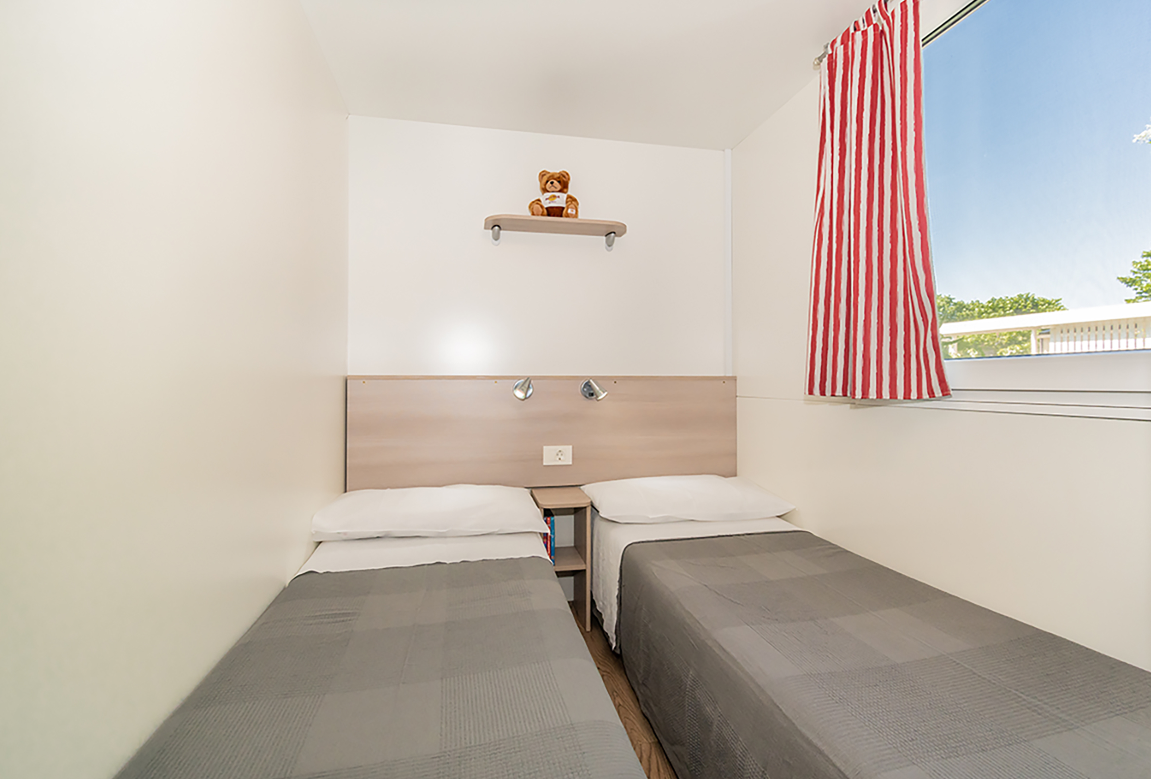 Casamobile trilocale in legno con veranda e giardino, angolo cottura,stoviglie, bicchieri, tazze e pentole, forno a micro onde, lavastoviglie, bagno, doccia, acqua calda, TV. Dispone di 1 posto letto matrimoniale, 2 posti letto singoli + 1 posto letto singolo a castello, 1 divano letto singolo in soggiorno . Parcheggio auto interno. Servizio spiaggia con un ombrellone, un lettino, una sdraio, connessione Wifi, Animazione e Miniclub, climatizzazione e ingresso in piscina.