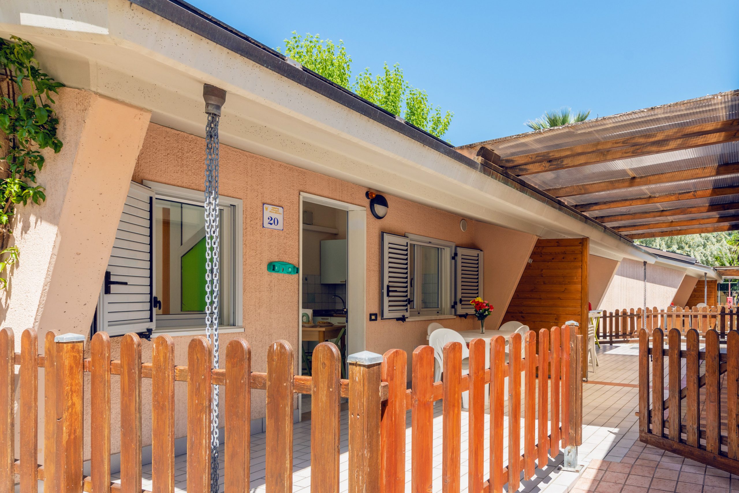 Bungalow bilocale in muratura con veranda accessibile, angolo cottura,stoviglie, bicchieri, tazze e pentole, bagno, doccia, acqua calda, TV. Dispone di 1 posto letto matrimoniale e 2 poltrone letto singole in soggiorno. Parcheggio auto interno. Servizio spiaggia con un ombrellone, un lettino, una sdraio, connessione Wifi, Animazione e Miniclub, climatizzazione e ingresso in piscina.