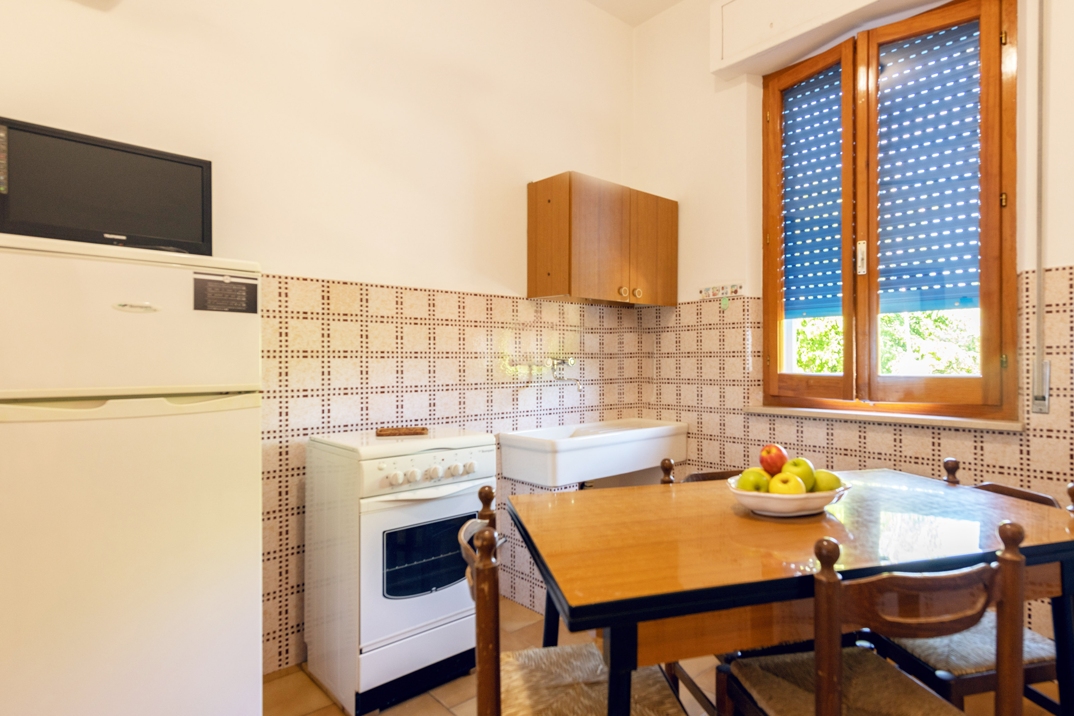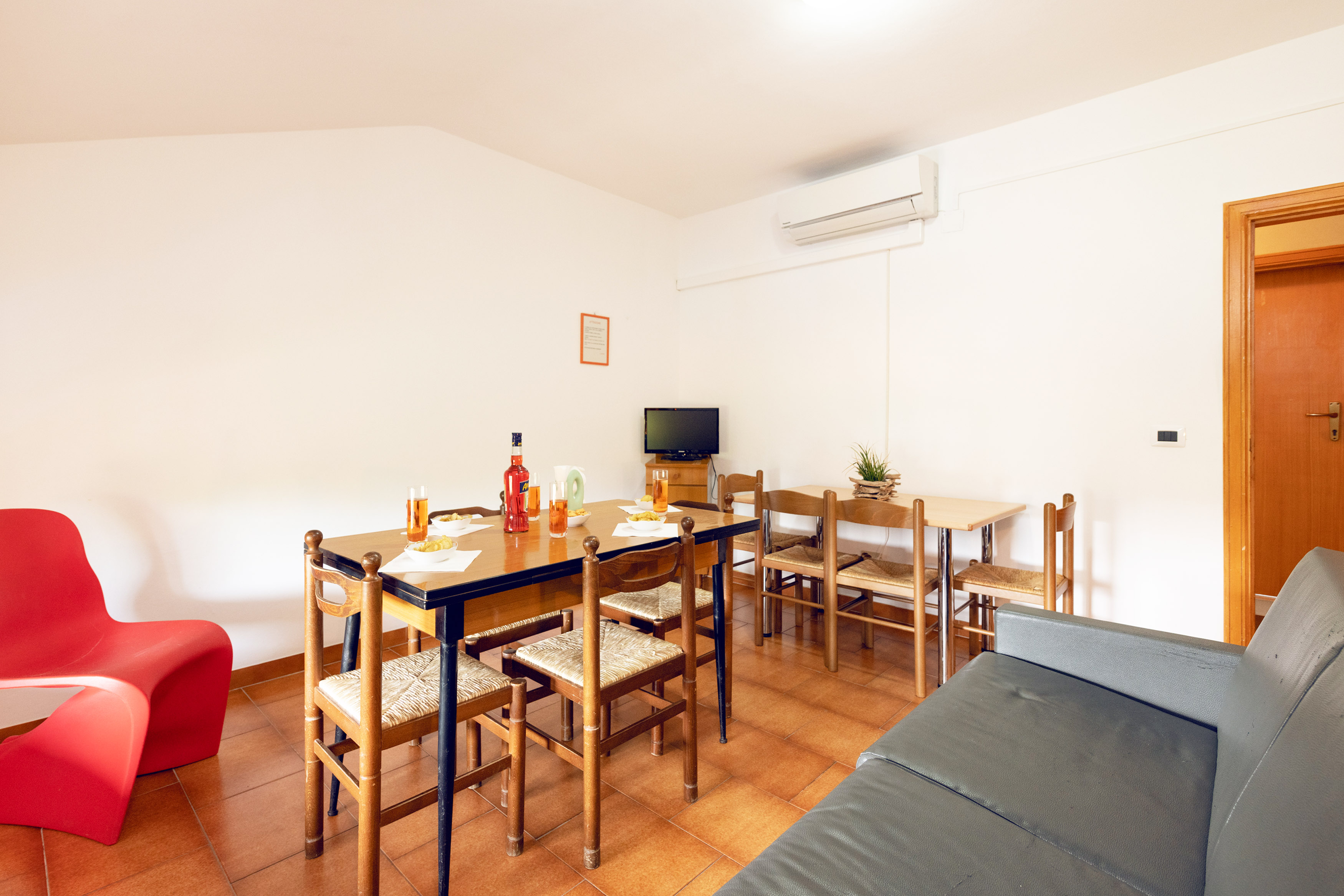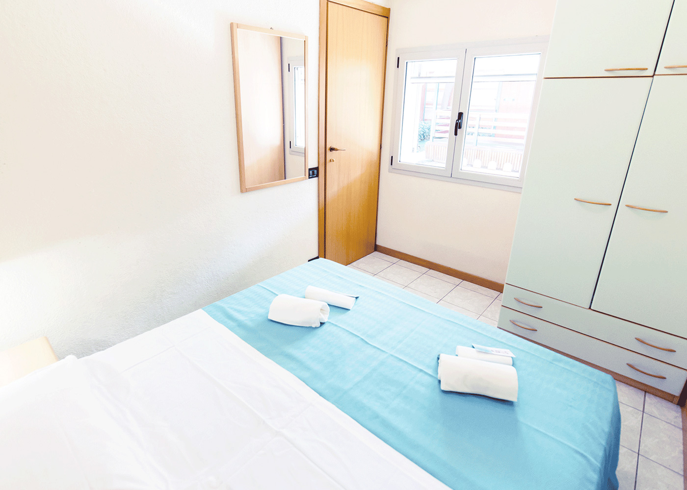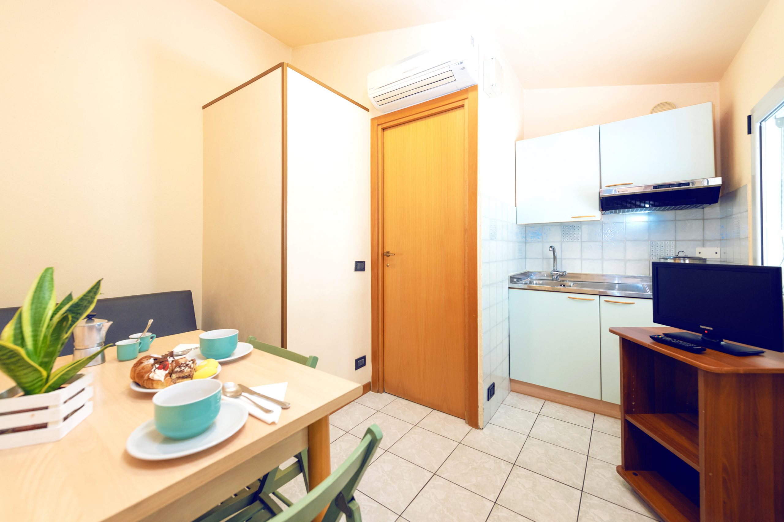 Appartamento bilocale (al primo piano) con angolo cottura,stoviglie, bicchieri, tazze e pentole, bagno privato (ma separato da corridoio comune) con doccia, WC, acqua calda, TV. Dispone di 1 posto letto matrimoniale e 2 posti letto in letto a castello. Parcheggio auto interno. Servizio spiaggia con un ombrellone, un lettino, una sdraio, connessione Wifi, Animazione e Miniclub, climatizzazione e ingresso in piscina.