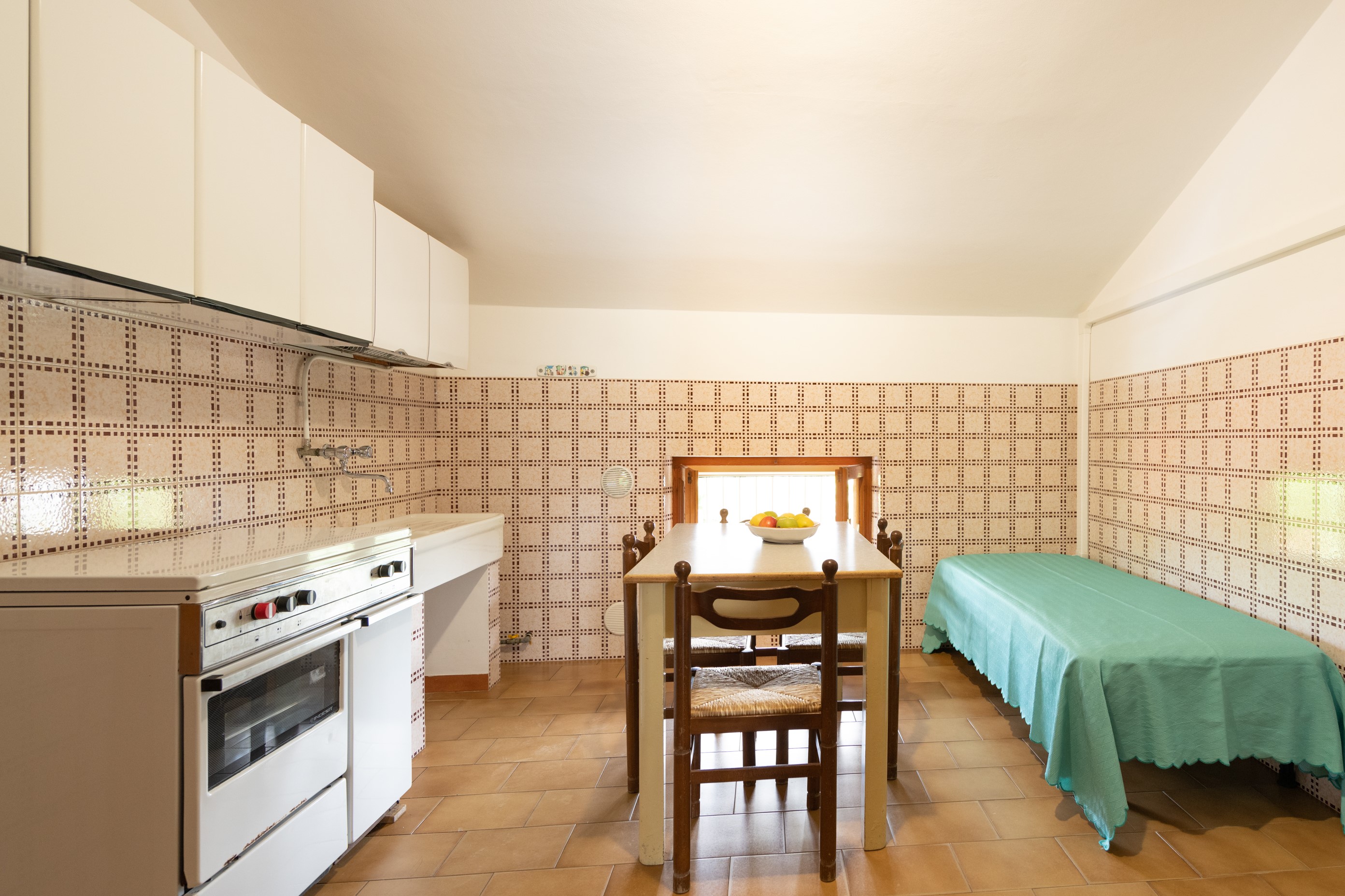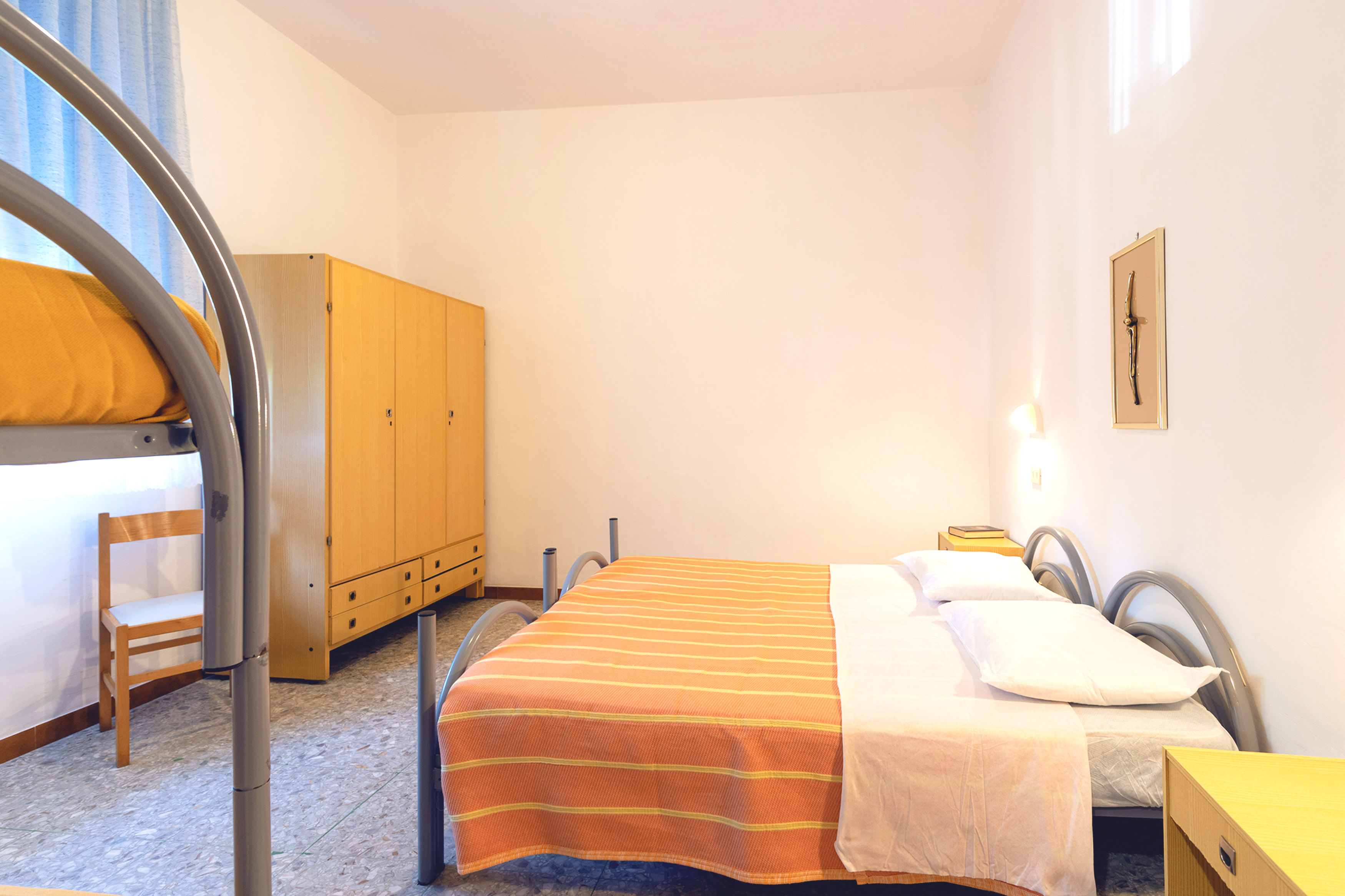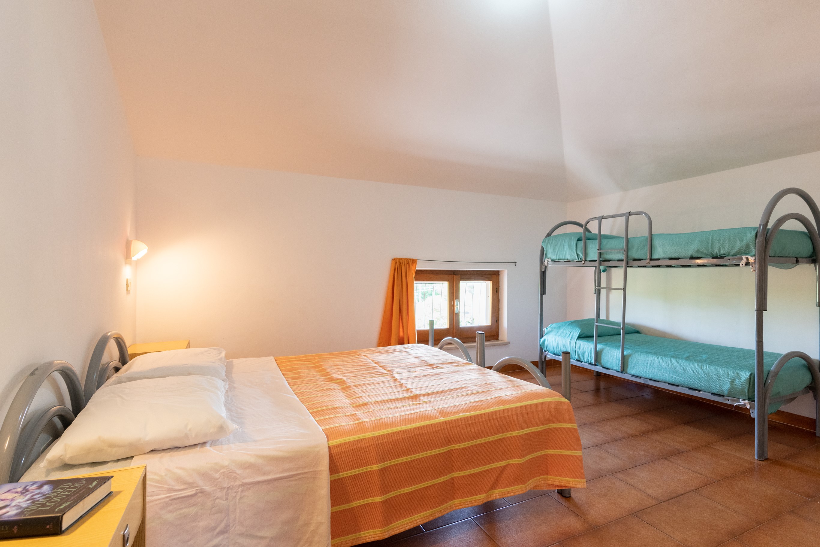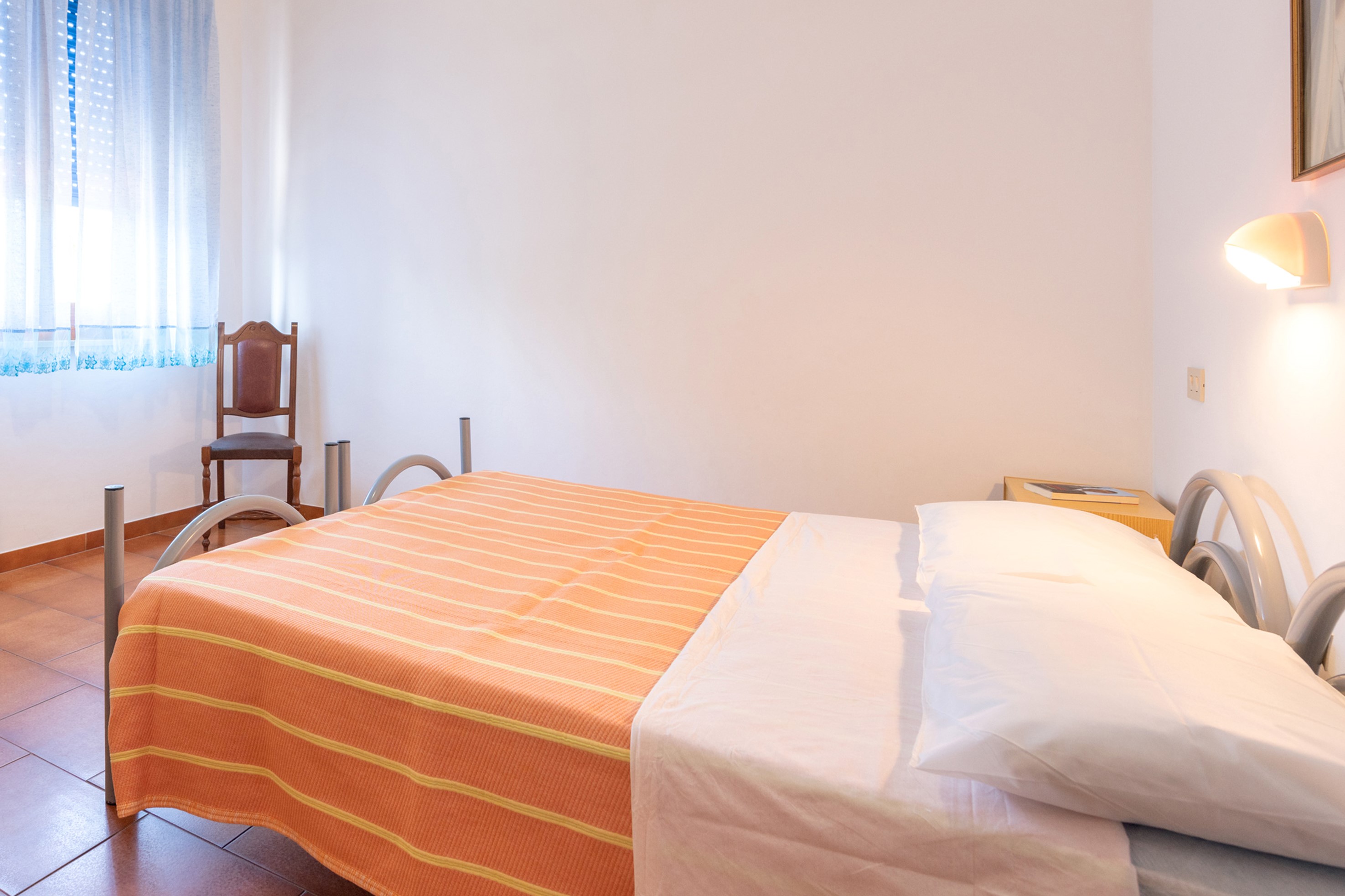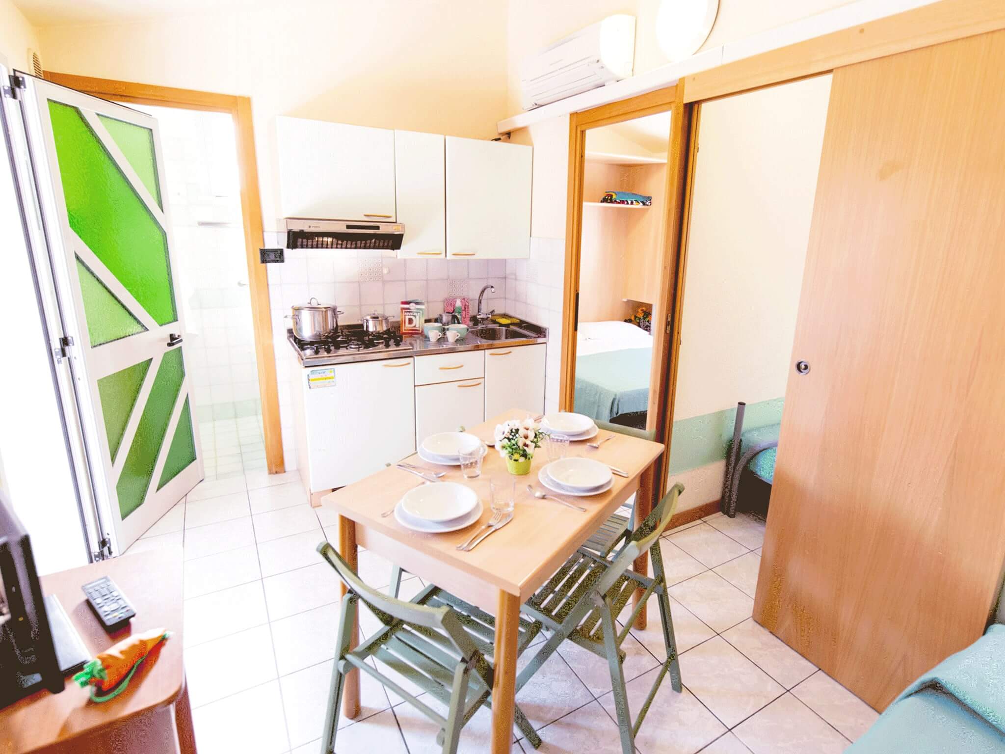 Appartamento bilocale (al primo piano) con angolo cottura,stoviglie, bicchieri, tazze e pentole, bagno privato (ma separato da corridoio comune) con doccia, WC, acqua calda, TV. Dispone di 1 posto letto matrimoniale e 2 posti letto in letto a castello. Parcheggio auto interno. Servizio spiaggia con un ombrellone, un lettino, una sdraio, connessione Wifi, Animazione e Miniclub, climatizzazione e ingresso in piscina.