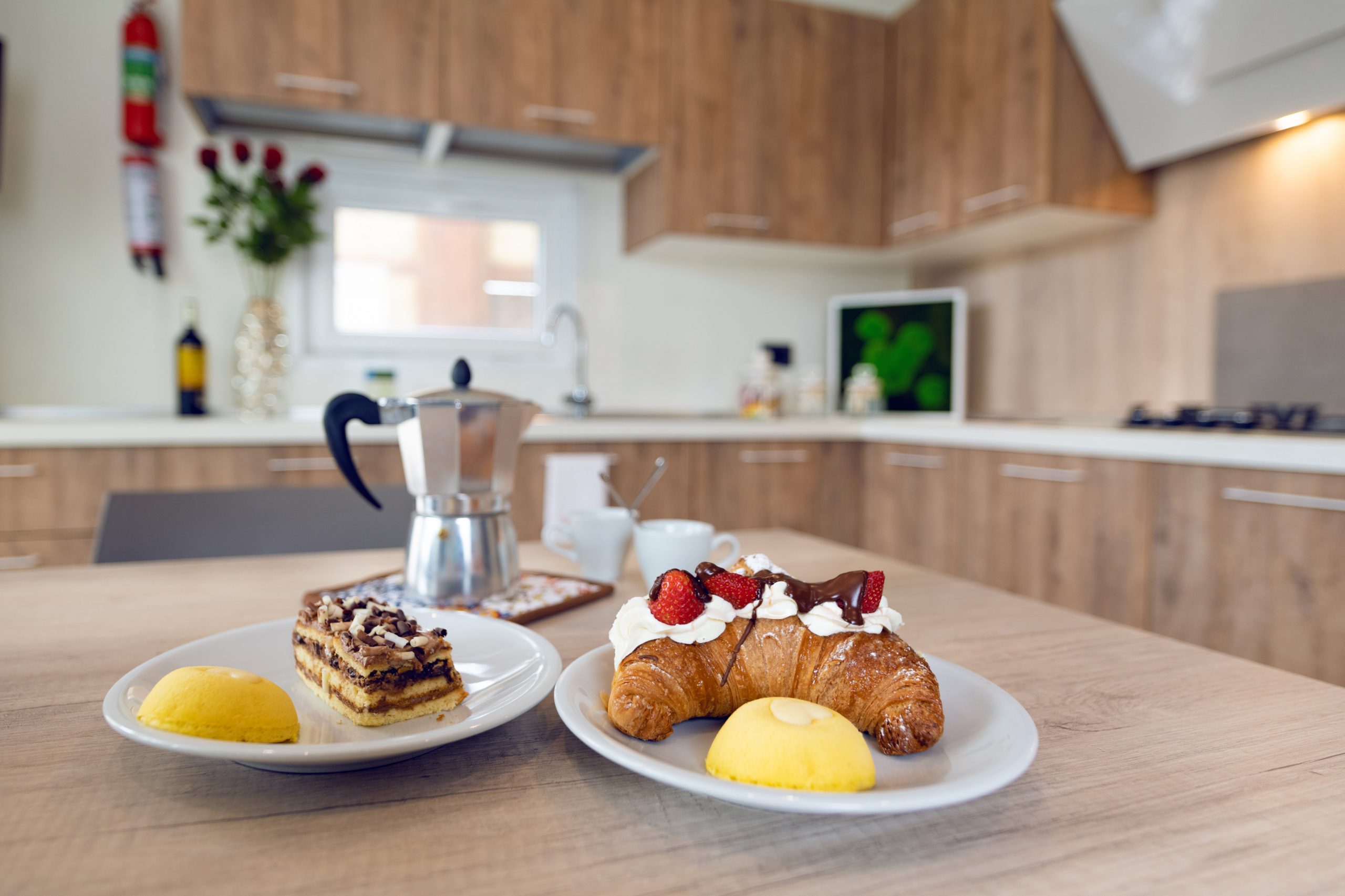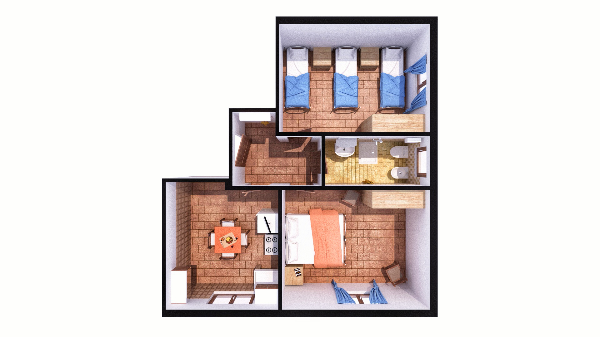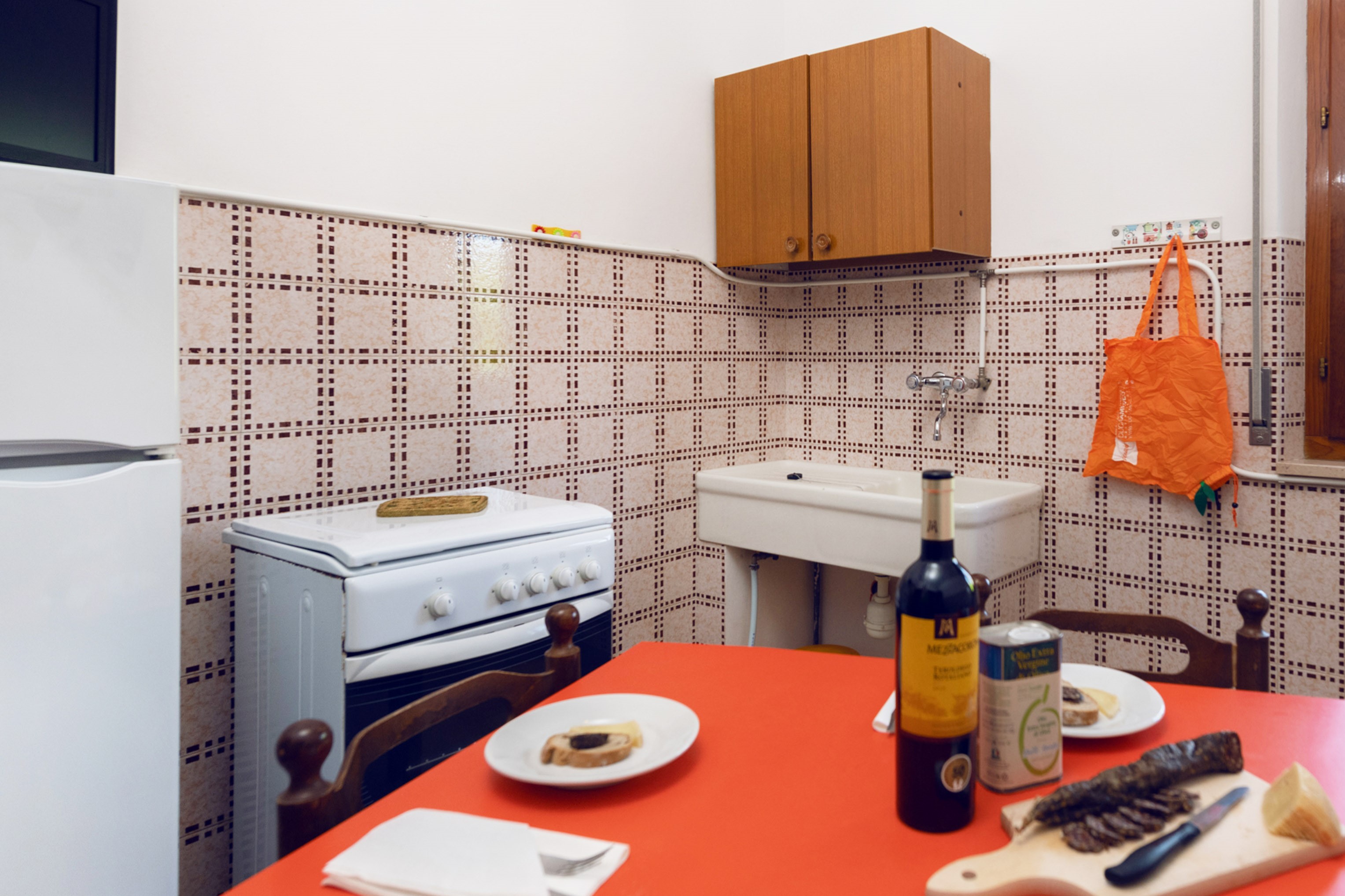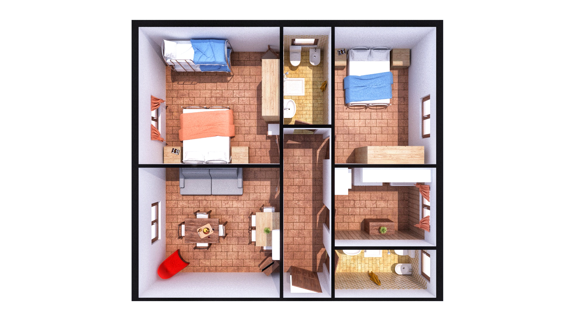 Appartamento bilocale (al primo piano) con angolo cottura,stoviglie, bicchieri, tazze e pentole, bagno privato (ma separato da corridoio comune) con doccia, WC, acqua calda, TV. Dispone di 1 posto letto matrimoniale e 2 posti letto in letto a castello. Parcheggio auto interno. Servizio spiaggia con un ombrellone, un lettino, una sdraio, connessione Wifi, Animazione e Miniclub, climatizzazione e ingresso in piscina.