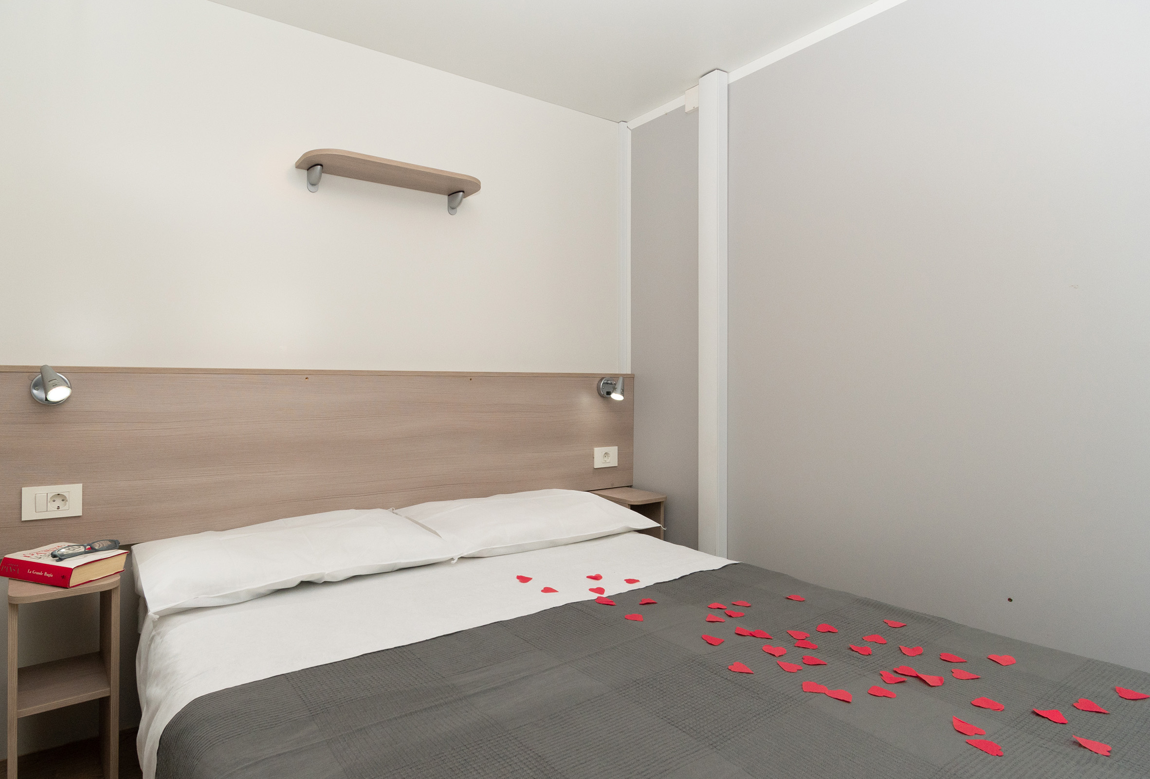 Casamobile bilocale in legno con veranda e giardino, angolo cottura,stoviglie, bicchieri, tazze e pentole, bagno, doccia, acqua calda, TV. Dispone di 1 posto letto matrimoniale e 1 divanoletto in soggiorno. Parcheggio auto interno. Servizio spiaggia con un ombrellone, un lettino, una sdraio, connessione Wifi, Animazione e Miniclub, climatizzazione e ingresso in piscina.