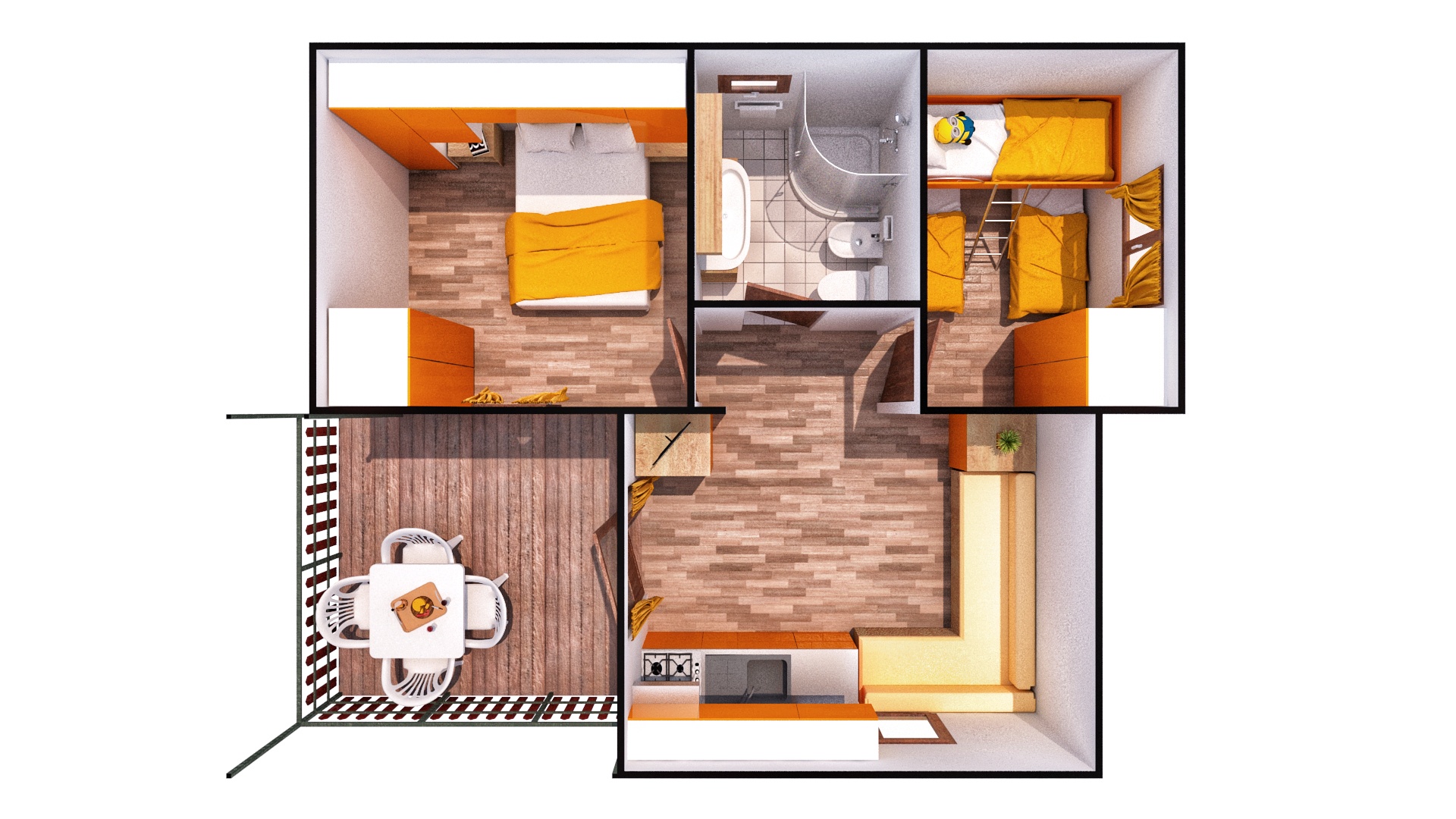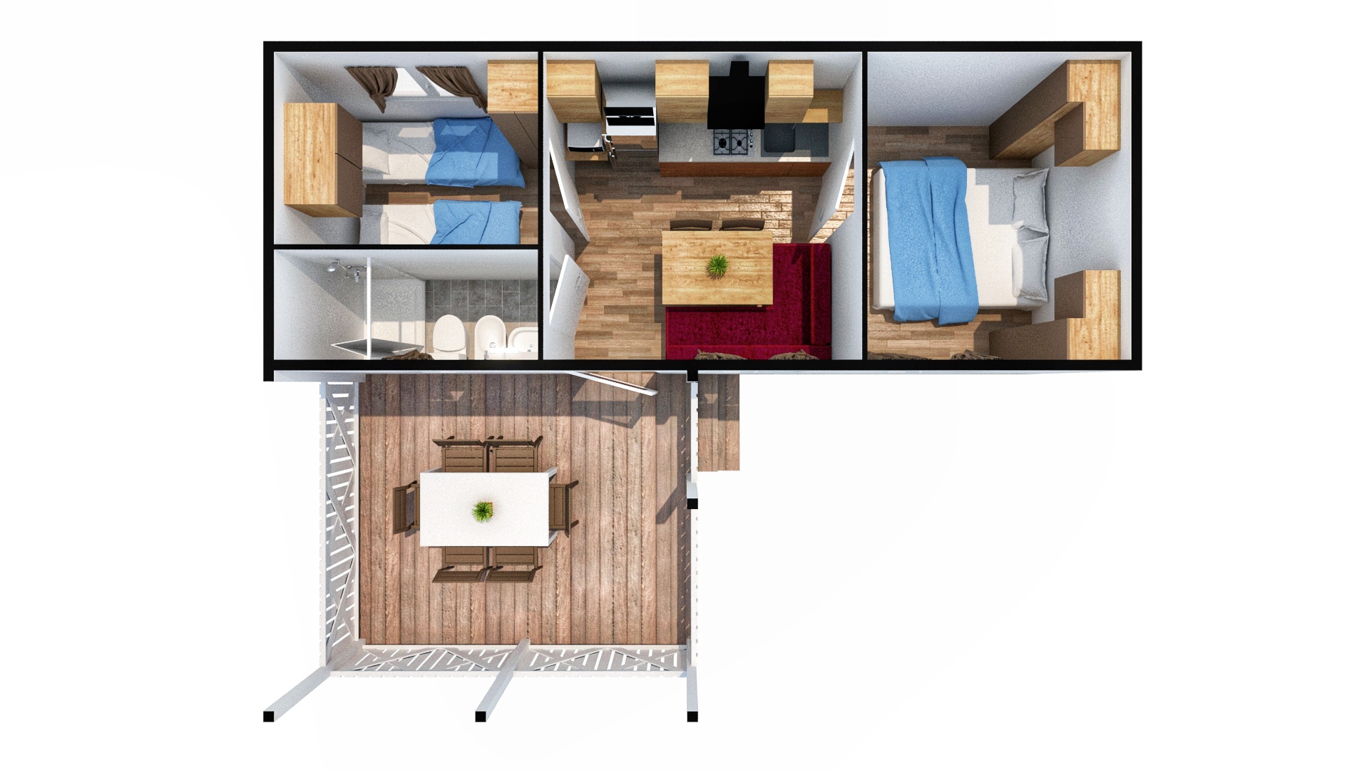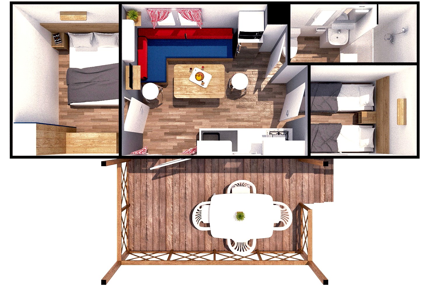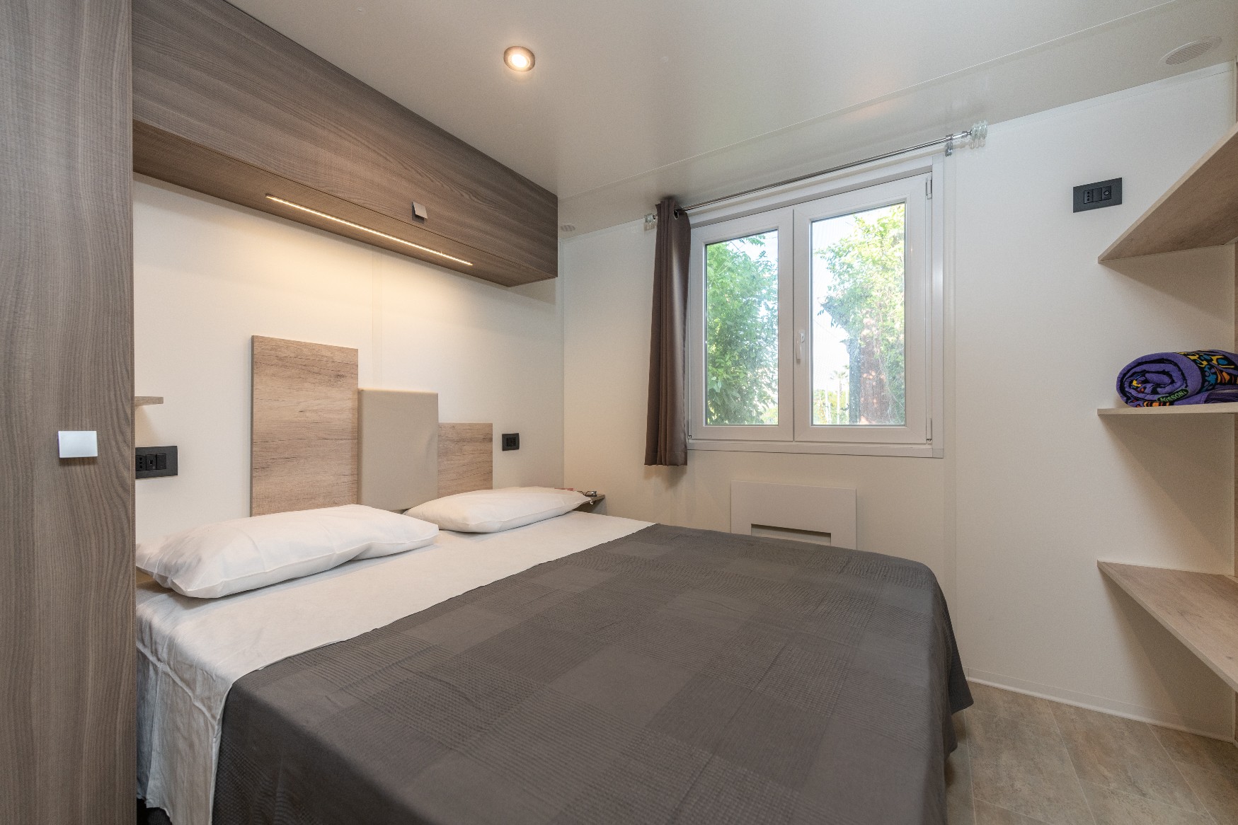 Casamobile trilocale in legno con veranda e giardino, angolo cottura,stoviglie, bicchieri, tazze e pentole, bagno, doccia, acqua calda, TV. Dispone di 1 posto letto matrimoniale, 2 posti letto singoli e 1 divano letto in soggiorno. Parcheggio auto interno. Servizio spiaggia con un ombrellone, un lettino, una sdraio, connessione Wifi, Animazione e Miniclub, climatizzazione e ingresso in piscina.