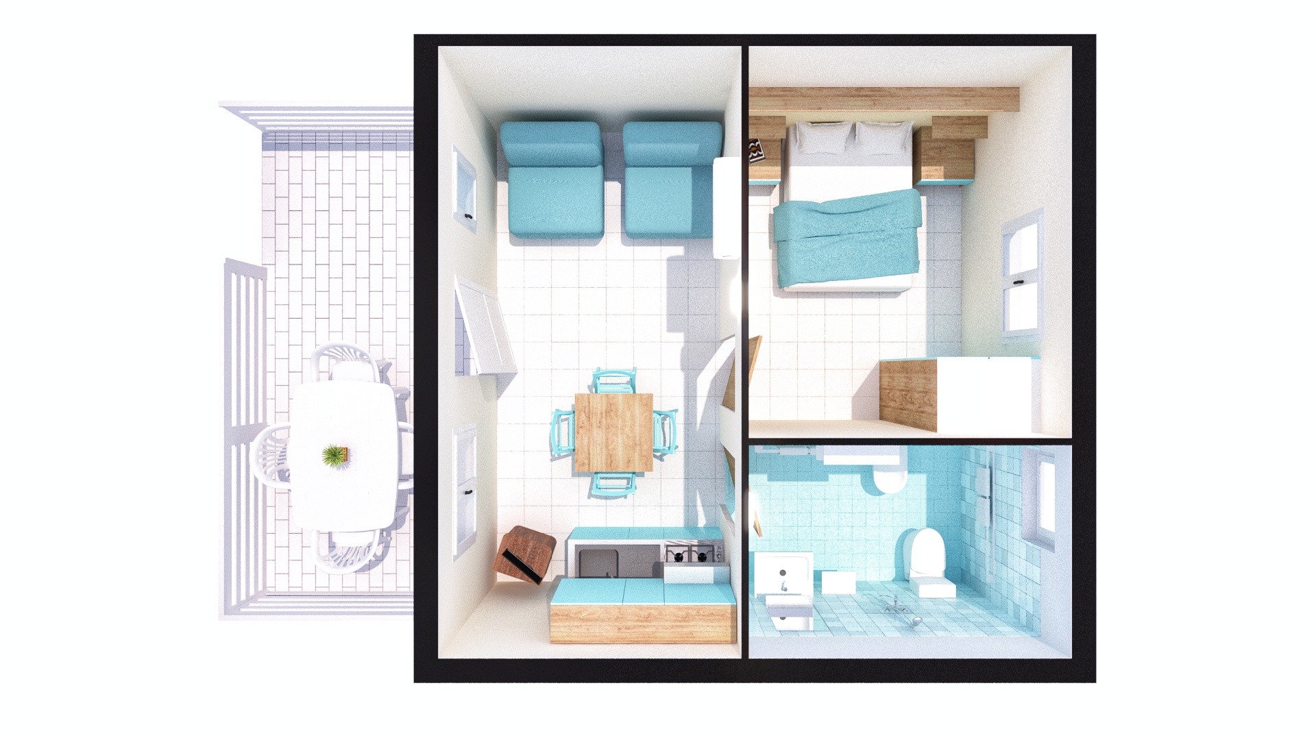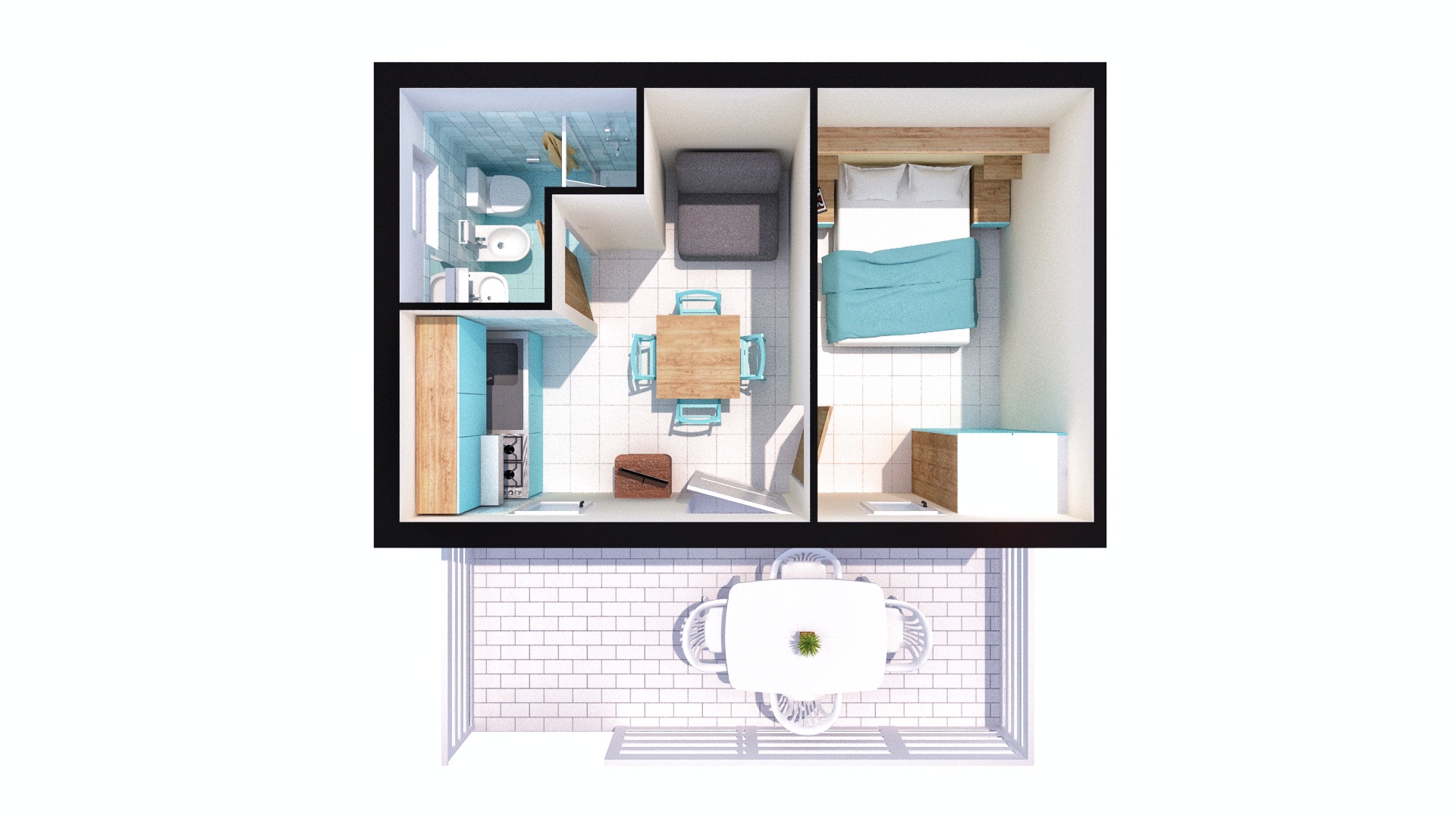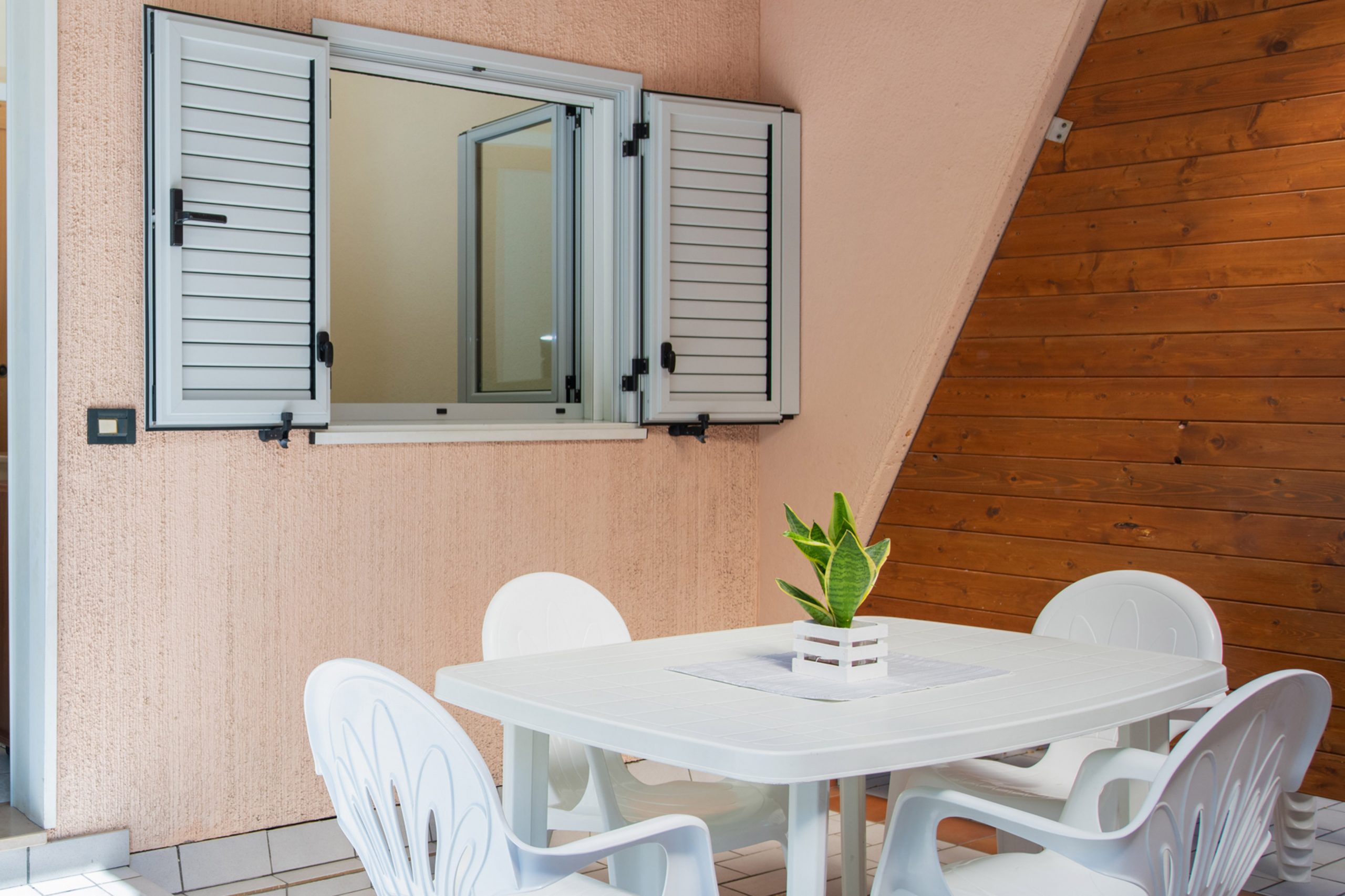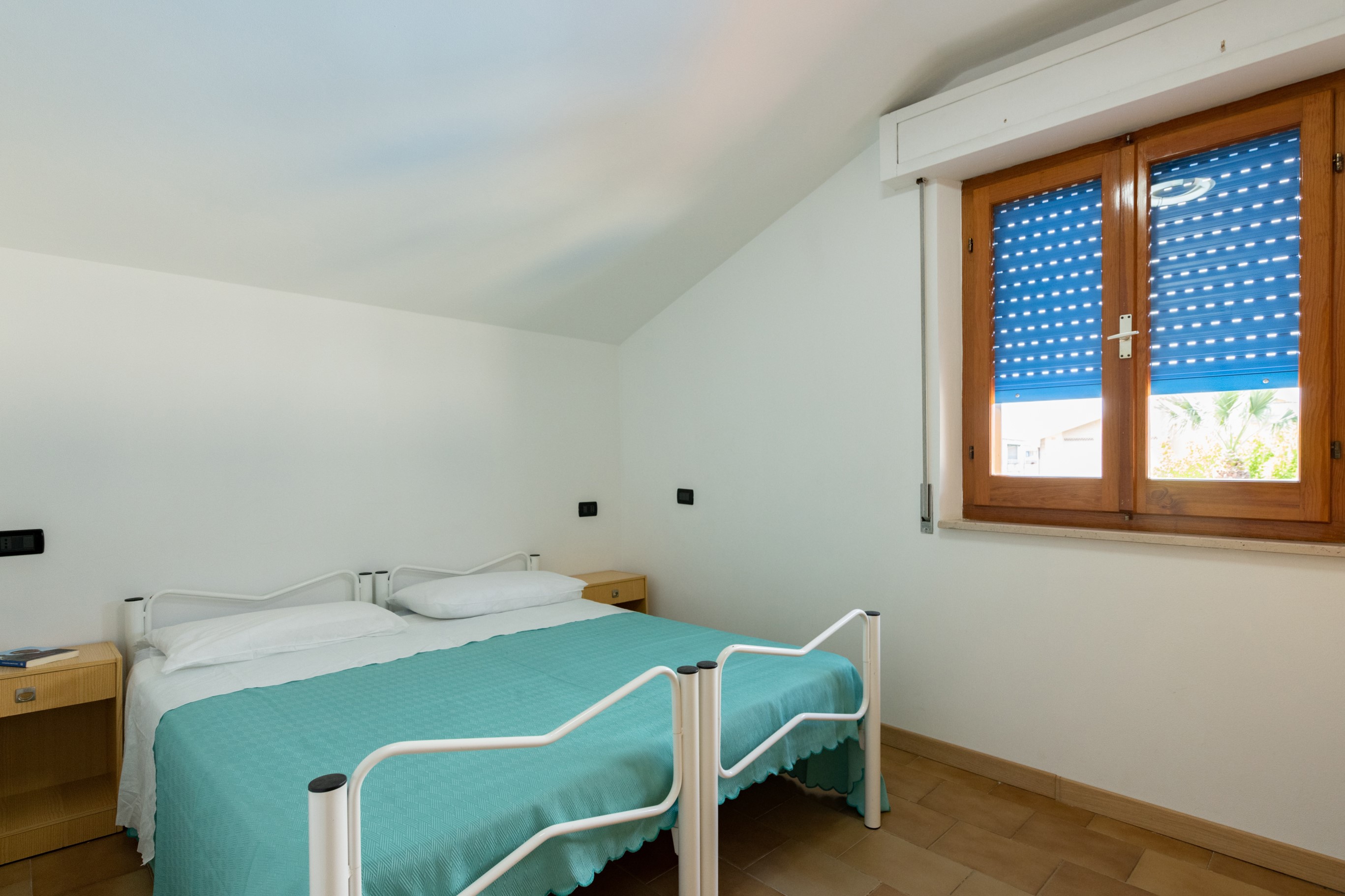 Appartamento bilocale (al secondo piano, NO ASCENSORE) con angolo cottura,stoviglie, bicchieri, tazze e pentole, bagno con doccia, WC, acqua calda, TV. Dispone di 1 posto letto matrimoniale e 1 posto letto singolo, 1 posto letto singolo in soggiorno. Parcheggio auto interno. Servizio spiaggia con un ombrellone, un lettino, una sdraio, connessione Wifi, Animazione e Miniclub, climatizzazione e ingresso in piscina.