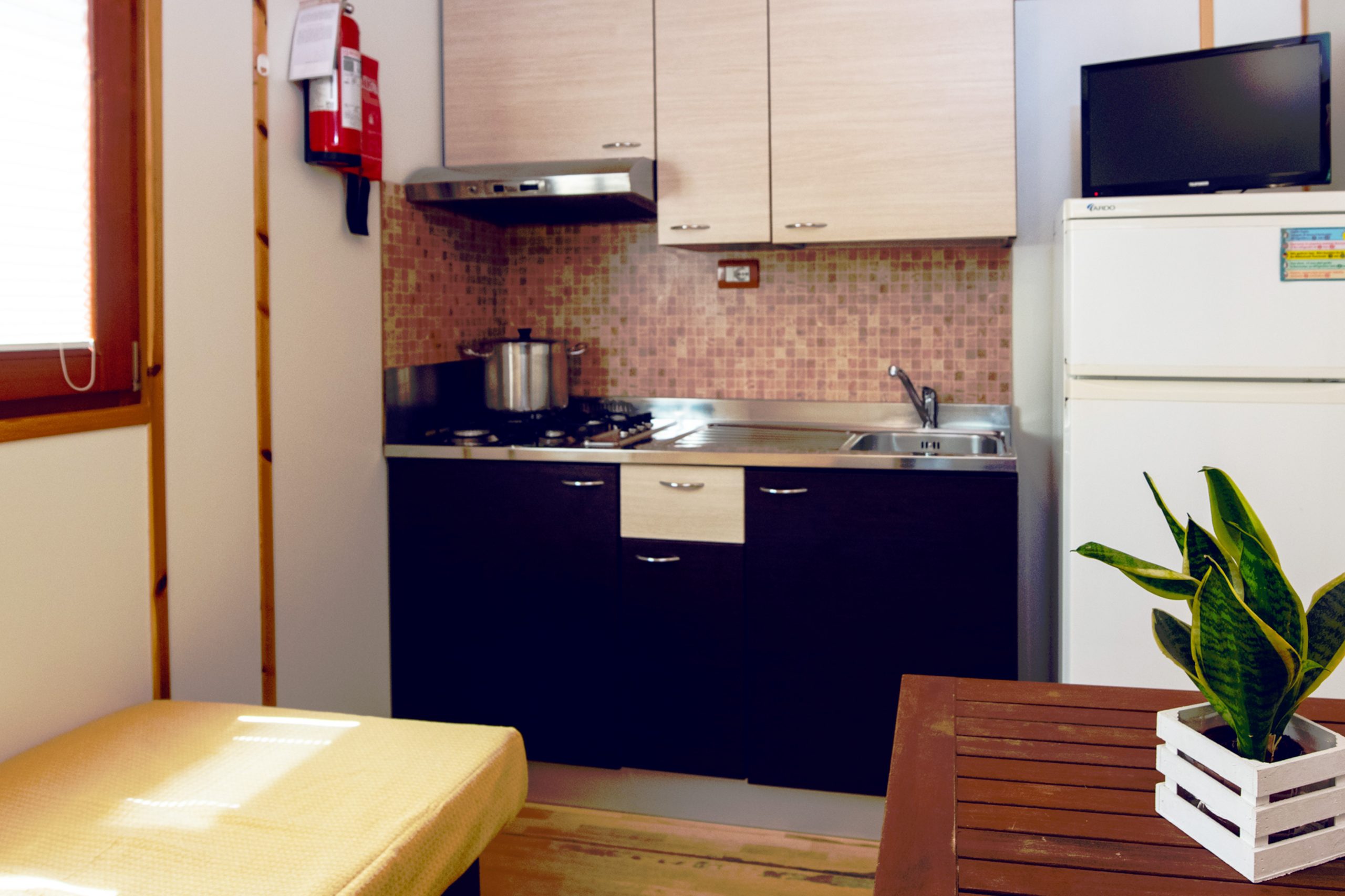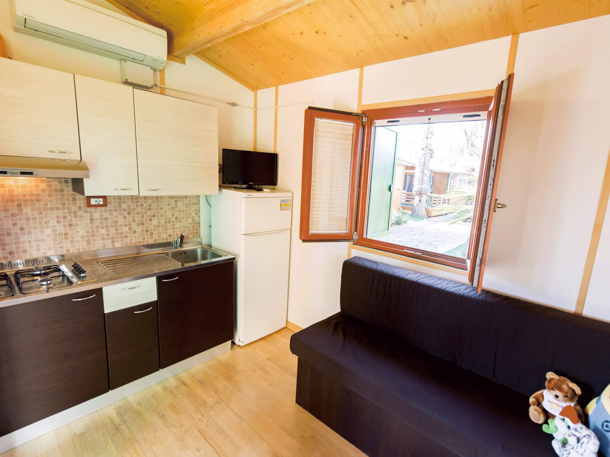Casamobile bilocale in legno con veranda e giardino, angolo cottura,stoviglie, bicchieri, tazze e pentole, bagno, doccia, acqua calda, TV. Dispone di 1 posto letto matrimoniale e 1 poltronaletto in soggiorno. Parcheggio auto interno. Servizio spiaggia con un ombrellone, un lettino, una sdraio, connessione Wifi, Animazione e Miniclub, climatizzazione e ingresso in piscina.
