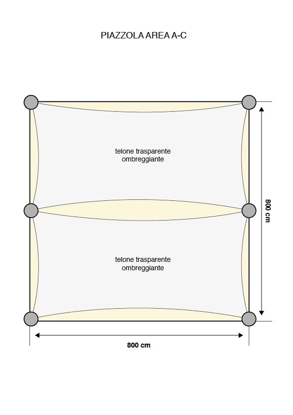 La piazzola standard in AREA A per camper, tenda o roulotte ombreggiata da telone ombreggiante traspirante è dotata di presa per l'energia elettrica a norma CEE (5 VA circa) e di presa TV. I servizi igienici sono dotati di acqua calda, docce, lavabi, lavatoi per panni, lavelli per stoviglie, fasciatoi. Disponibilità di servizi idonei per accogliere i diversamente abili e, su richiesta, di 9 servizi privati a pagamento. Possibilità di utilizzo dell'area camper service e dei vuotatoi chimici. Disponibilità del servizio lavanderia con lavatrice a gettoni. Zona con frizer pubblico.