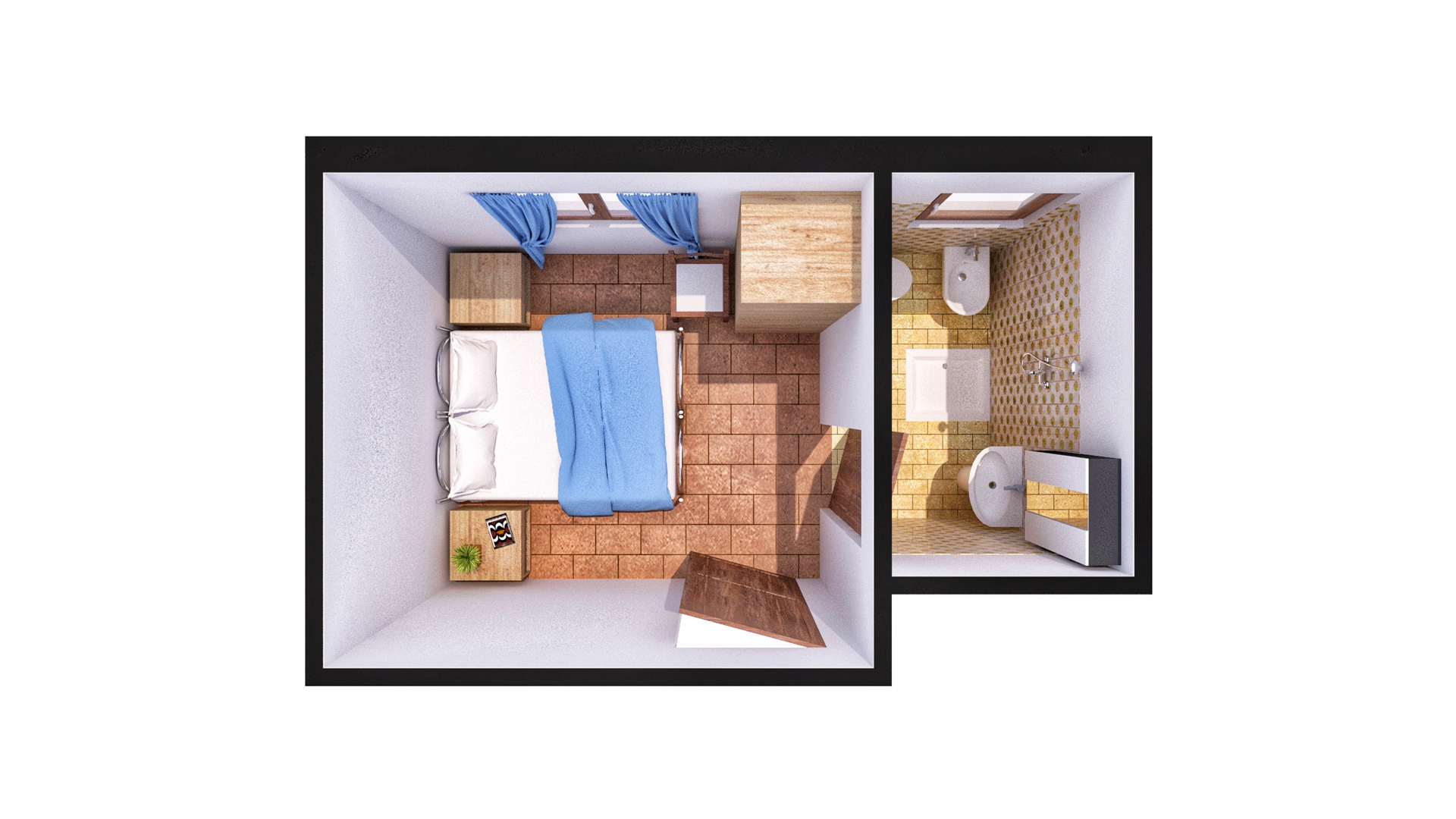 Camera matrimoniale, bagno con doccia, WC, acqua calda. Dispone di 1 posto letto matrimoniale . Parcheggio auto interno. Servizio spiaggia con un ombrellone, un lettino, una sdraio, connessione Wifi, Animazione e Miniclub, climatizzazione e ingresso in piscina.