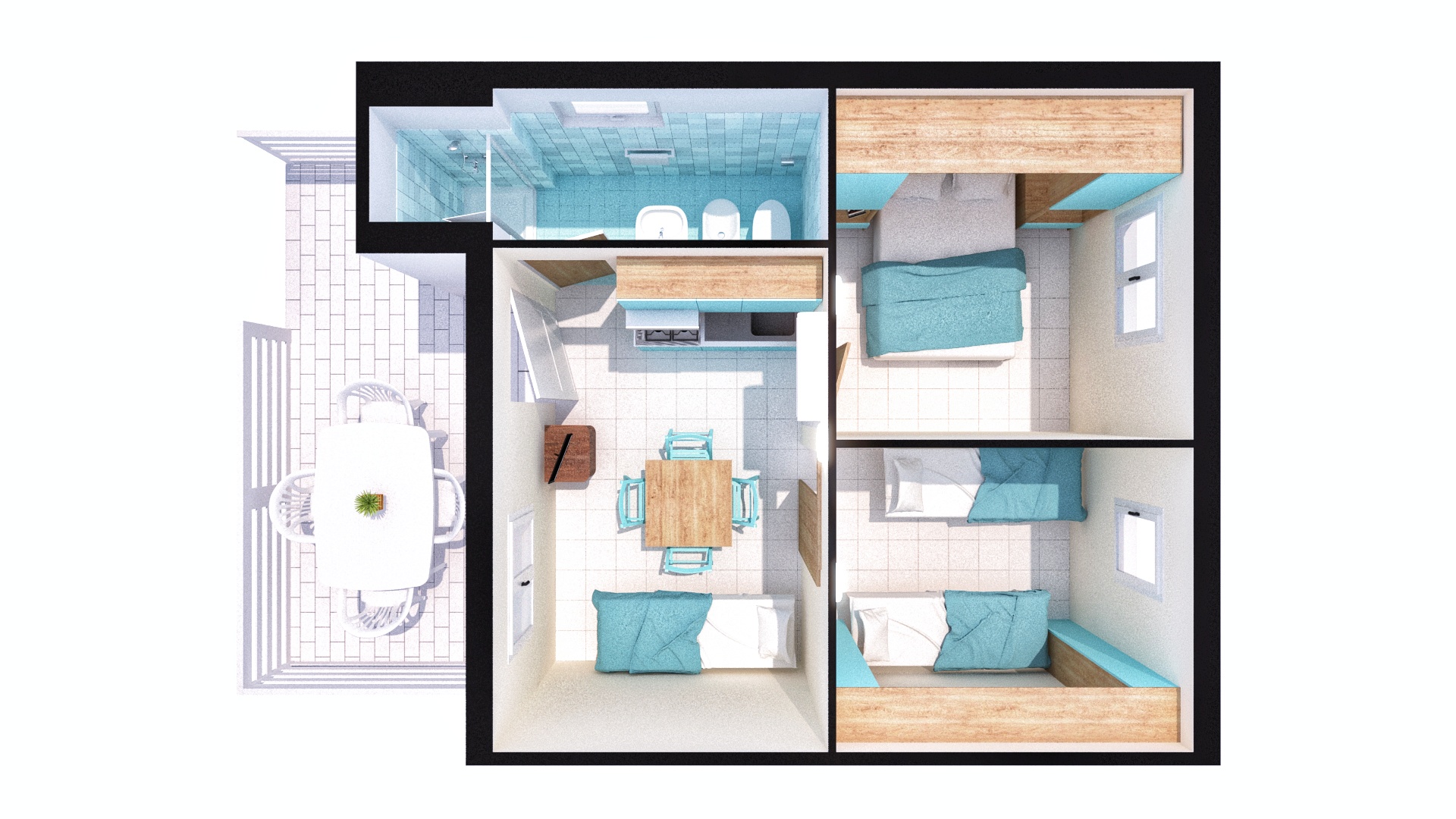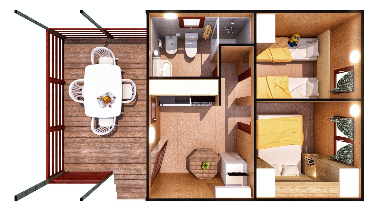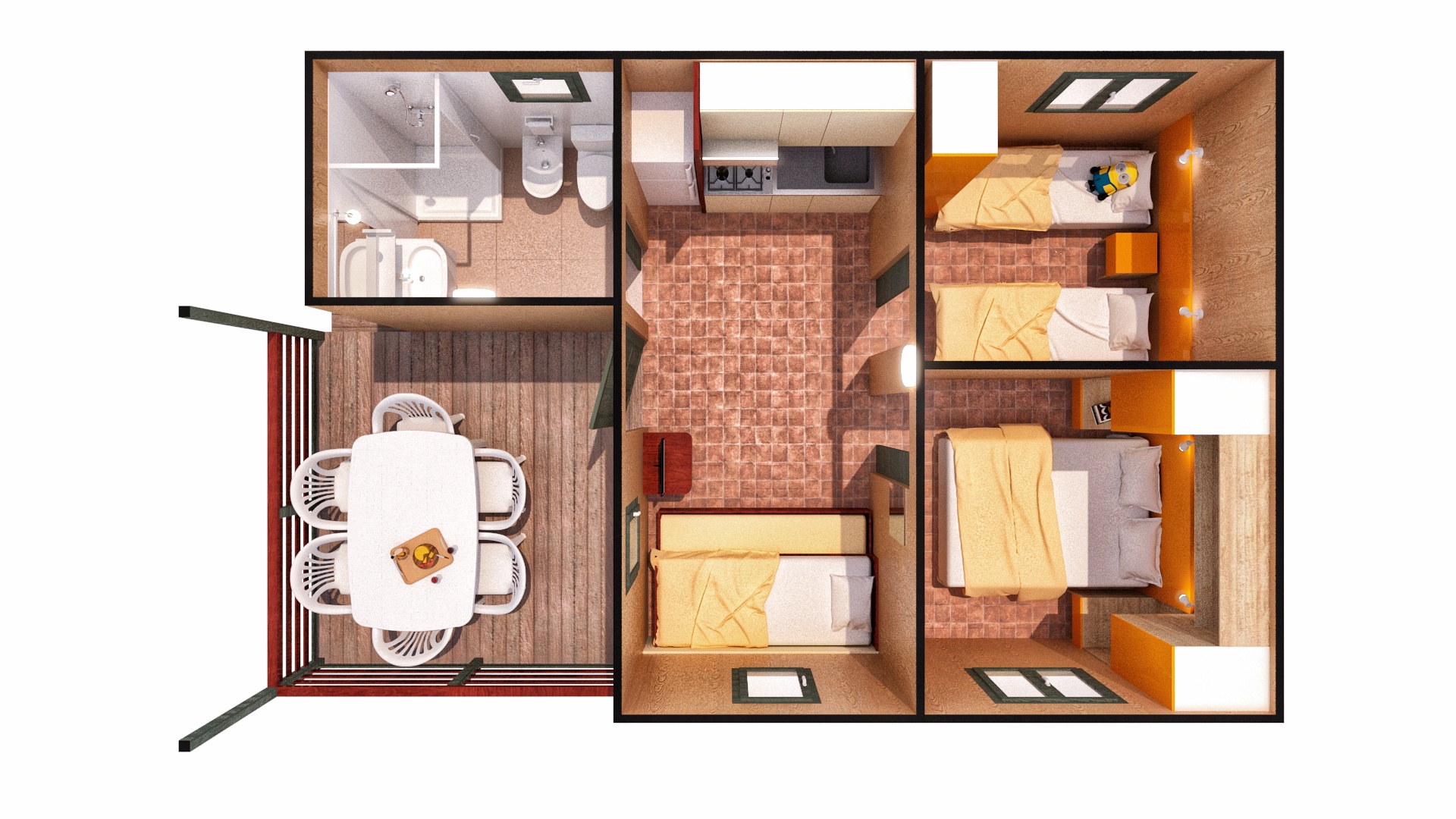 Casamobile trilocale in legno con veranda e giardino, angolo cottura,stoviglie, bicchieri, tazze e pentole, bagno, doccia, acqua calda, TV. Dispone di 1 posto letto matrimoniale, 2 posti letto singoli. Parcheggio auto interno. Servizio spiaggia con un ombrellone, un lettino, una sdraio, connessione Wifi, Animazione e Miniclub, climatizzazione e ingresso in piscina.