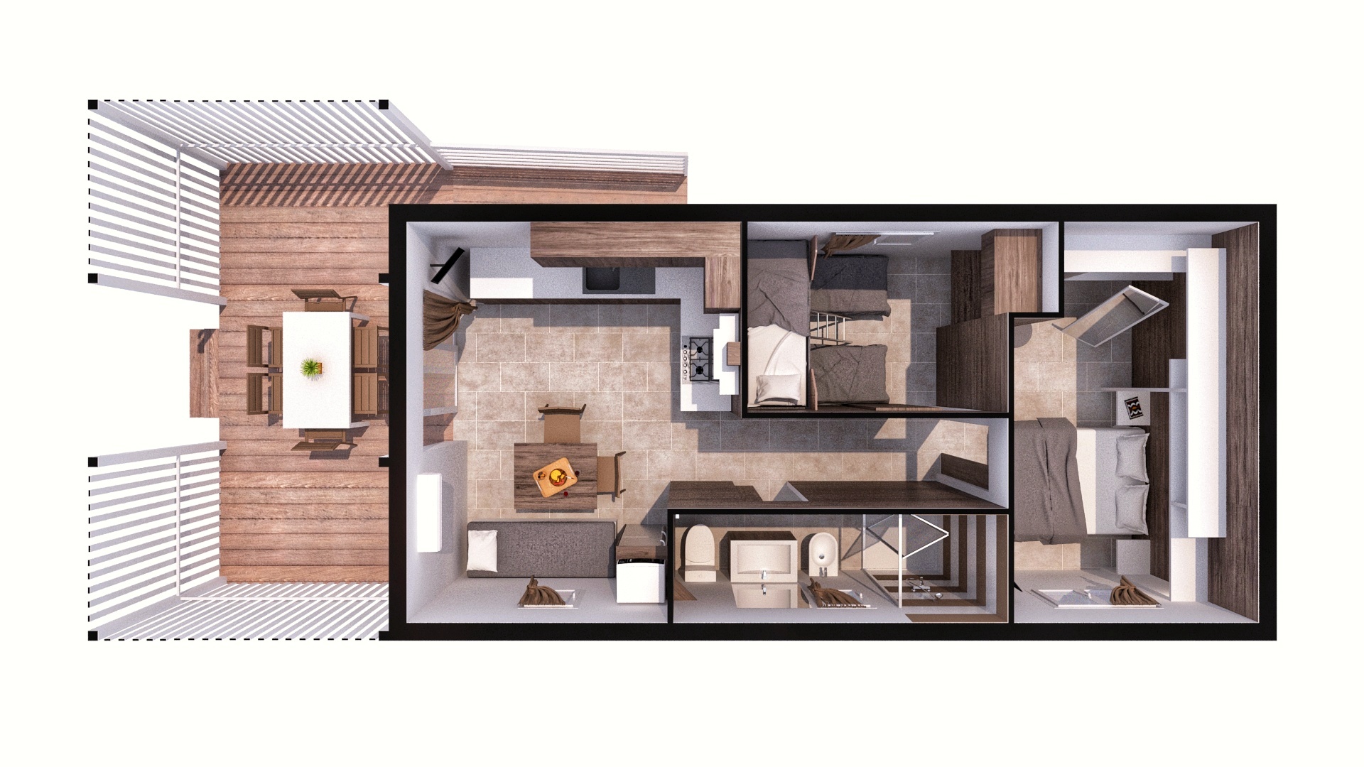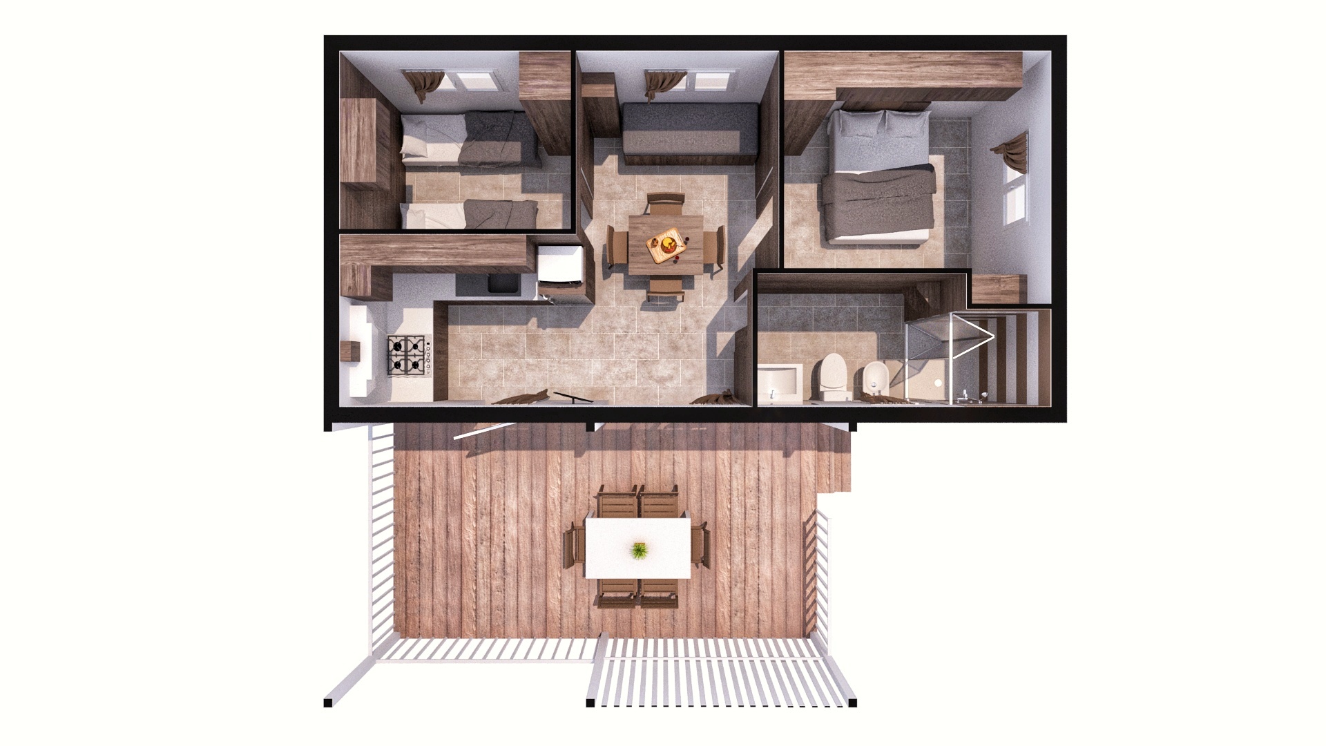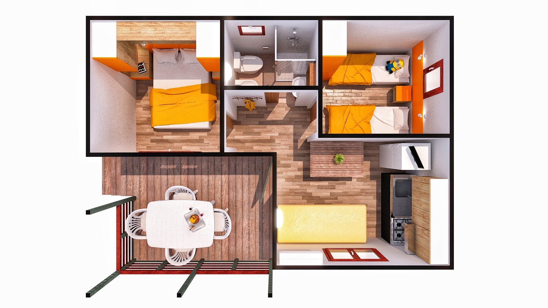 Casamobile trilocale in legno con veranda e giardino, angolo cottura,stoviglie, bicchieri, tazze e pentole, bagno, doccia, acqua calda, TV. Dispone di 1 posto letto matrimoniale, 2 posti letto singoli. Parcheggio auto interno. Servizio spiaggia con un ombrellone, un lettino, una sdraio, connessione Wifi, Animazione e Miniclub, climatizzazione e ingresso in piscina.