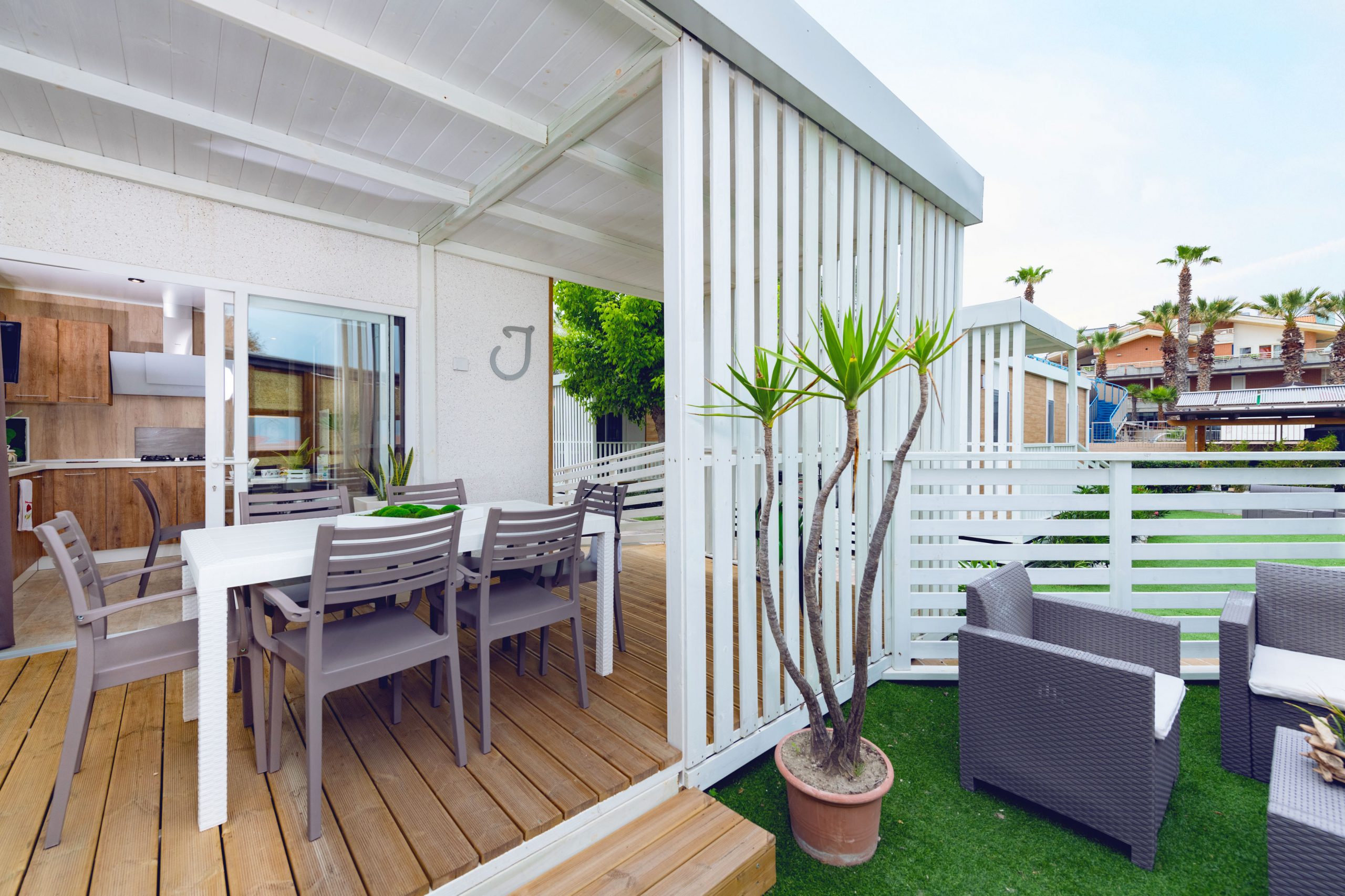 Casamobile trilocale in legno con veranda e giardino, angolo cottura,stoviglie, bicchieri, tazze e pentole, bagno, doccia, acqua calda, TV. Dispone di 1 posto letto matrimoniale, 2 posti letto singoli e 1 doppio letto a scomparsa in soggiorno. Parcheggio auto interno. Servizio spiaggia con un ombrellone, un lettino, una sdraio, connessione Wifi, Animazione e Miniclub, climatizzazione e ingresso in piscina.