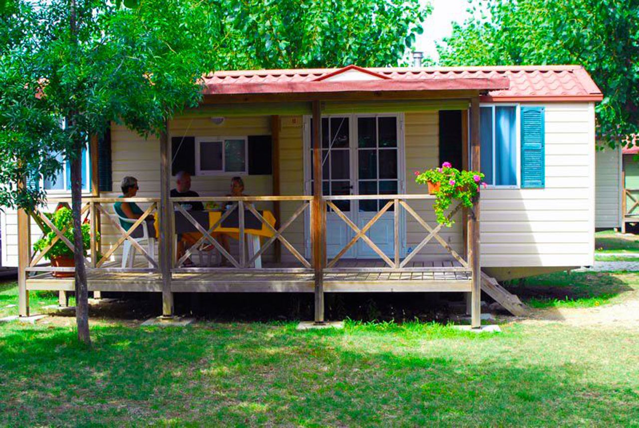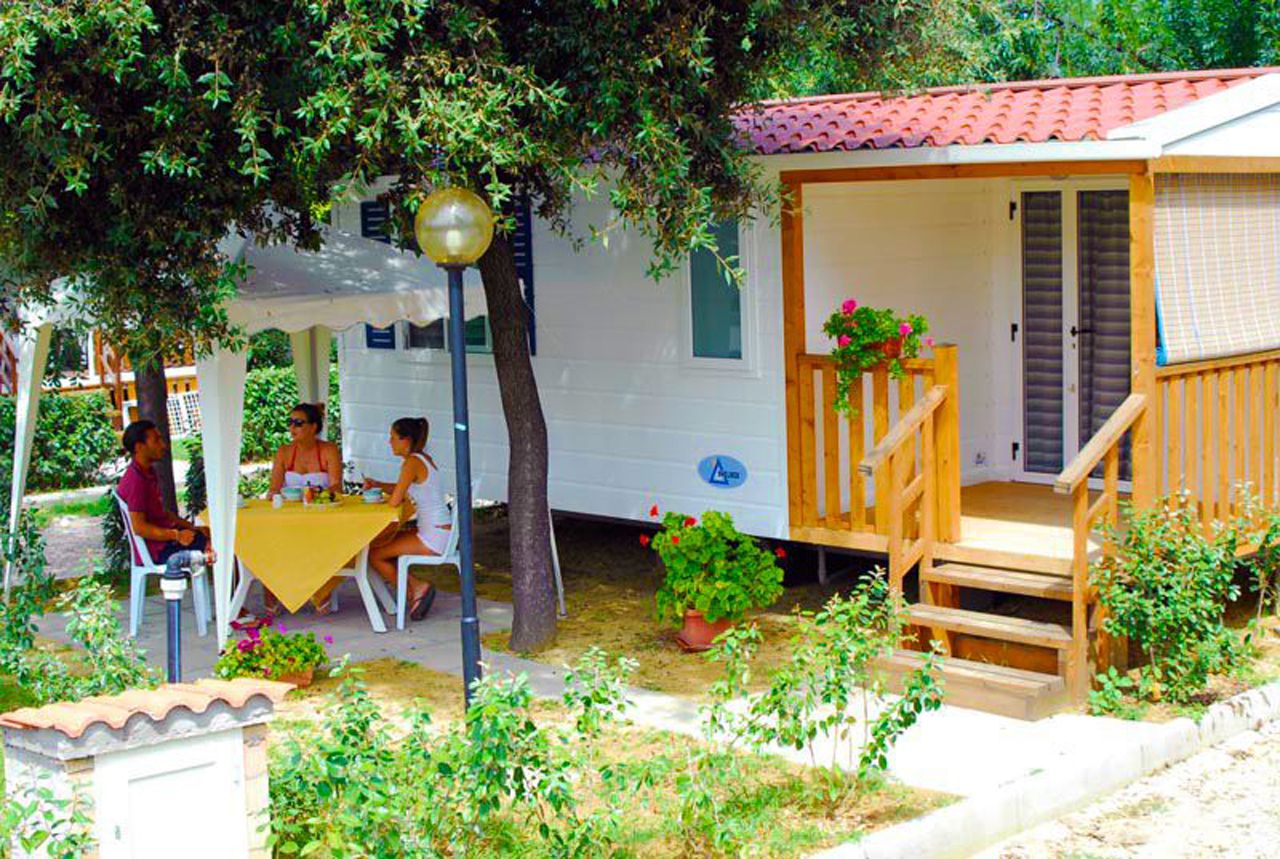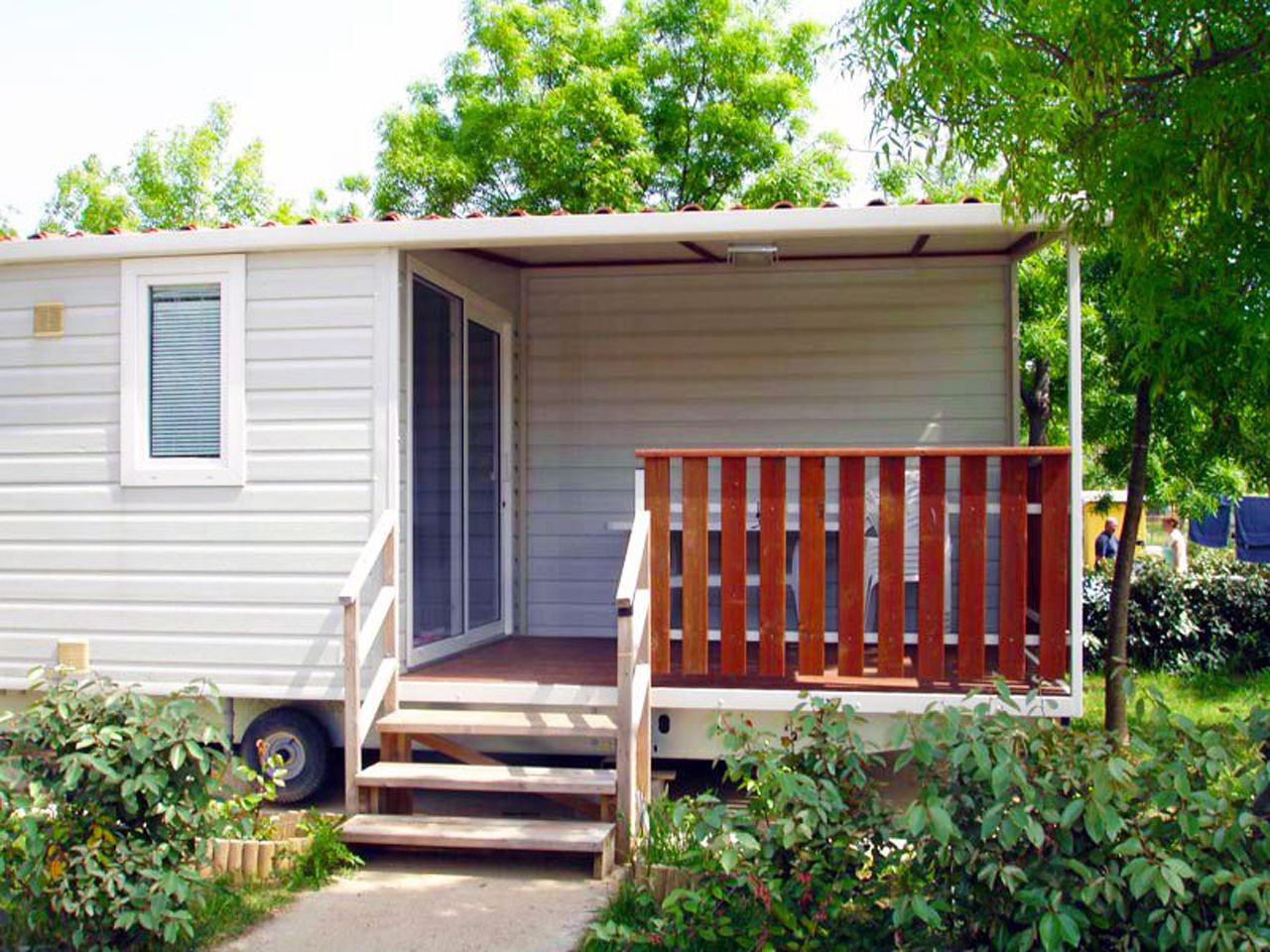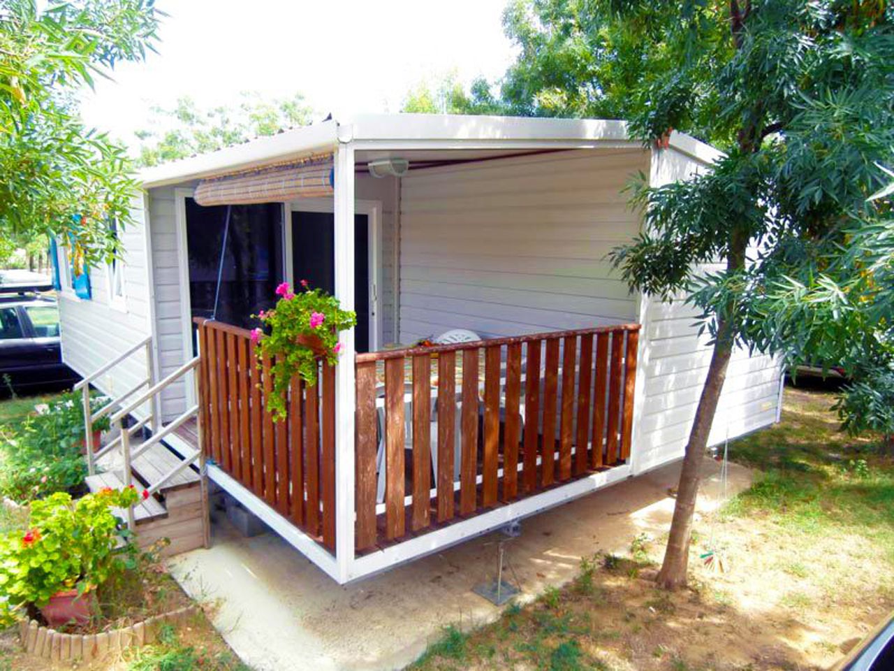 Casa Mobile composta da 1 camera matrimoniale con armadio; 1 camera con 2 letti e armadio, soggiorno con angolo cottura, bagno con tutti i servizi (no bidet), doccia, acqua calda, veranda in legno coperta attrezzata con tavoli e sedie.