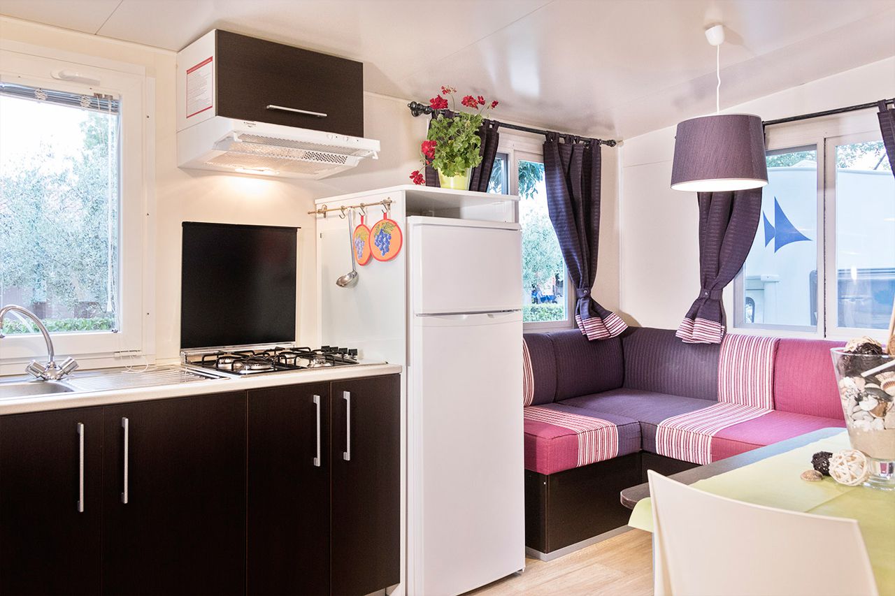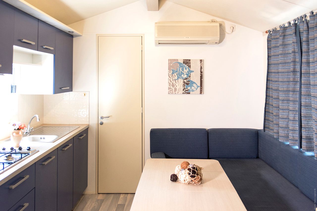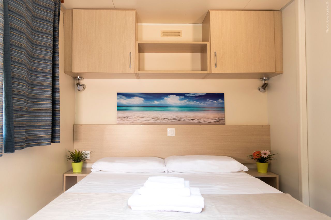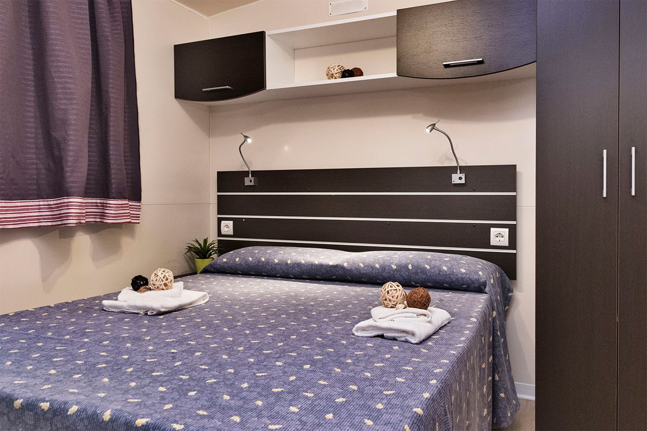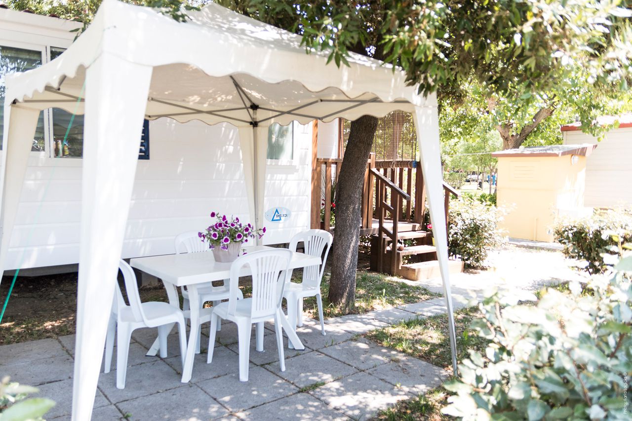 Casa Mobile composta da 1 camera matrimoniale con armadio; 1 camera con 2 letti e armadio, soggiorno con angolo cottura, bagno con tutti i servizi (no bidet), doccia, acqua calda, veranda in legno coperta attrezzata con tavoli e sedie.