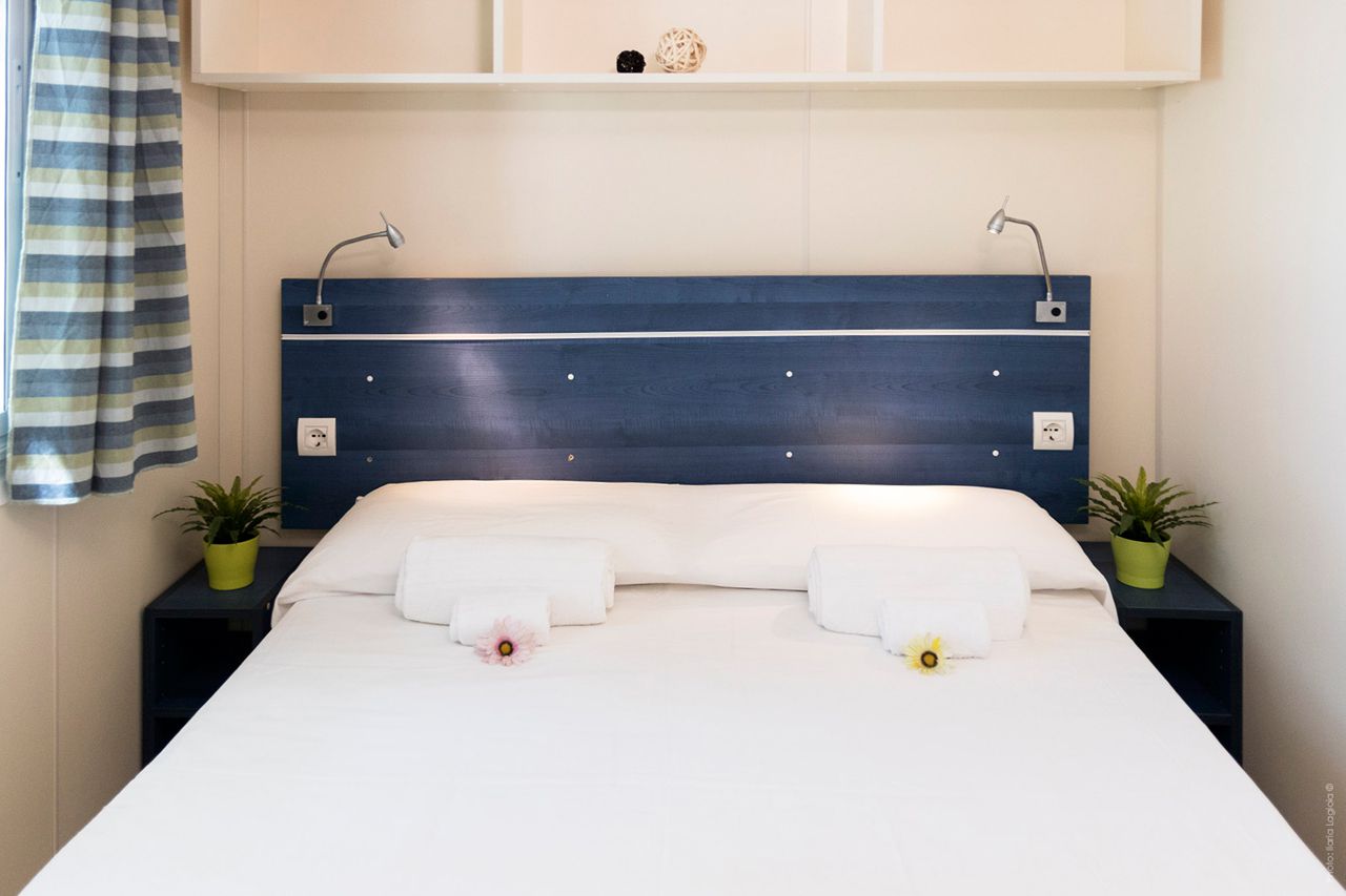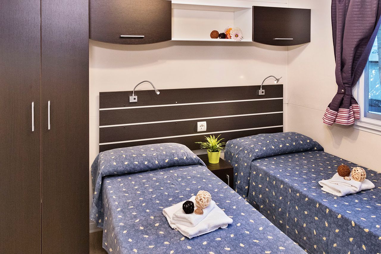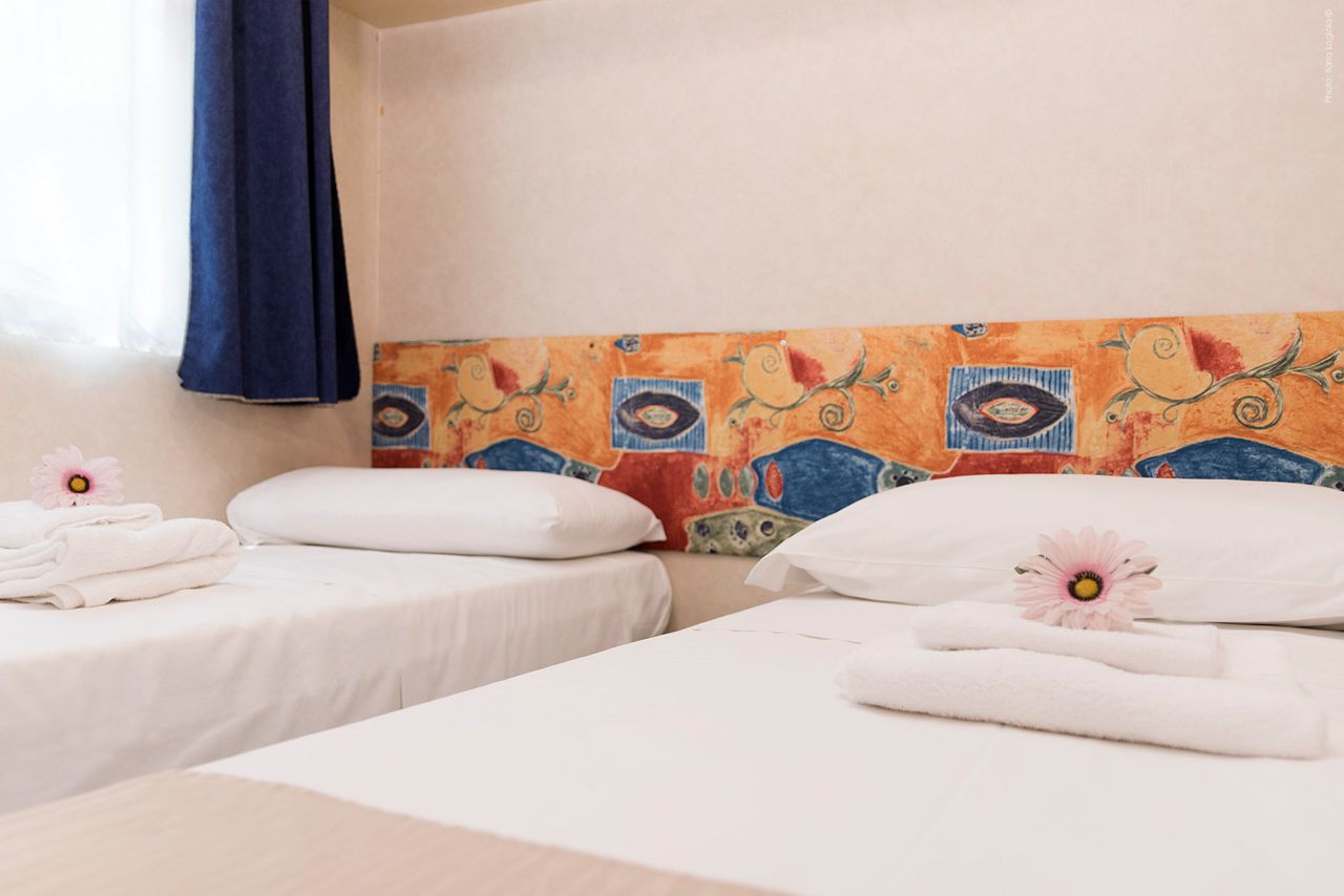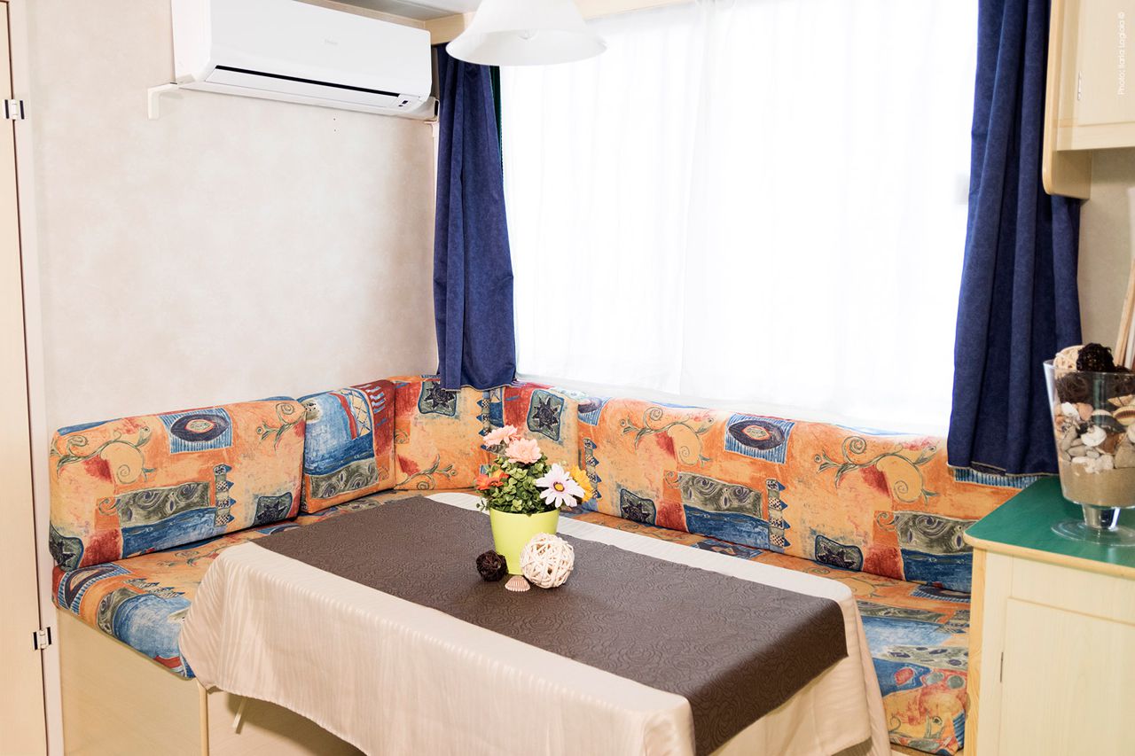 Casa Mobile composta da 1 camera matrimoniale con armadio; 1 camera con 2 letti e armadio, soggiorno con angolo cottura, bagno con tutti i servizi (no bidet), doccia, acqua calda, veranda in legno coperta attrezzata con tavoli e sedie.