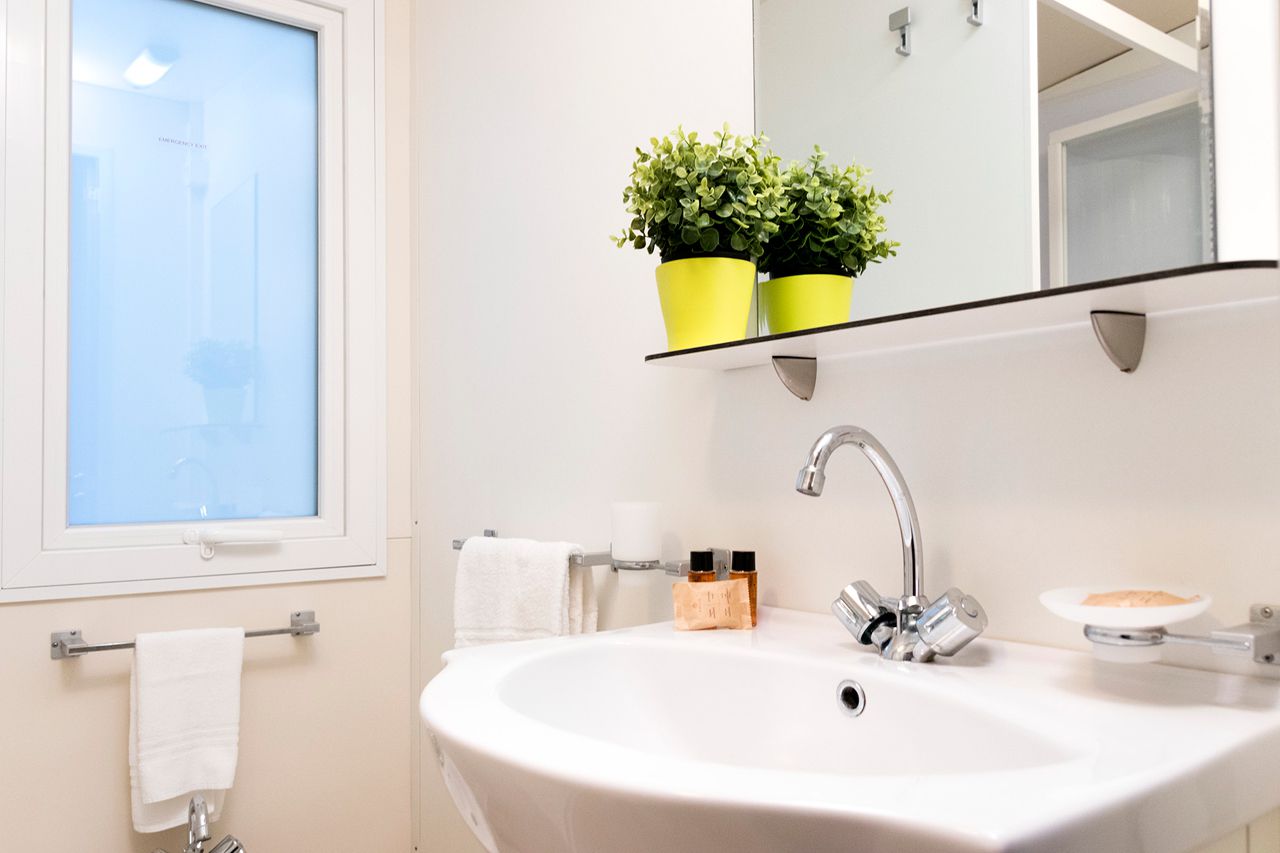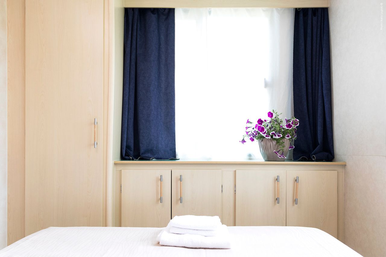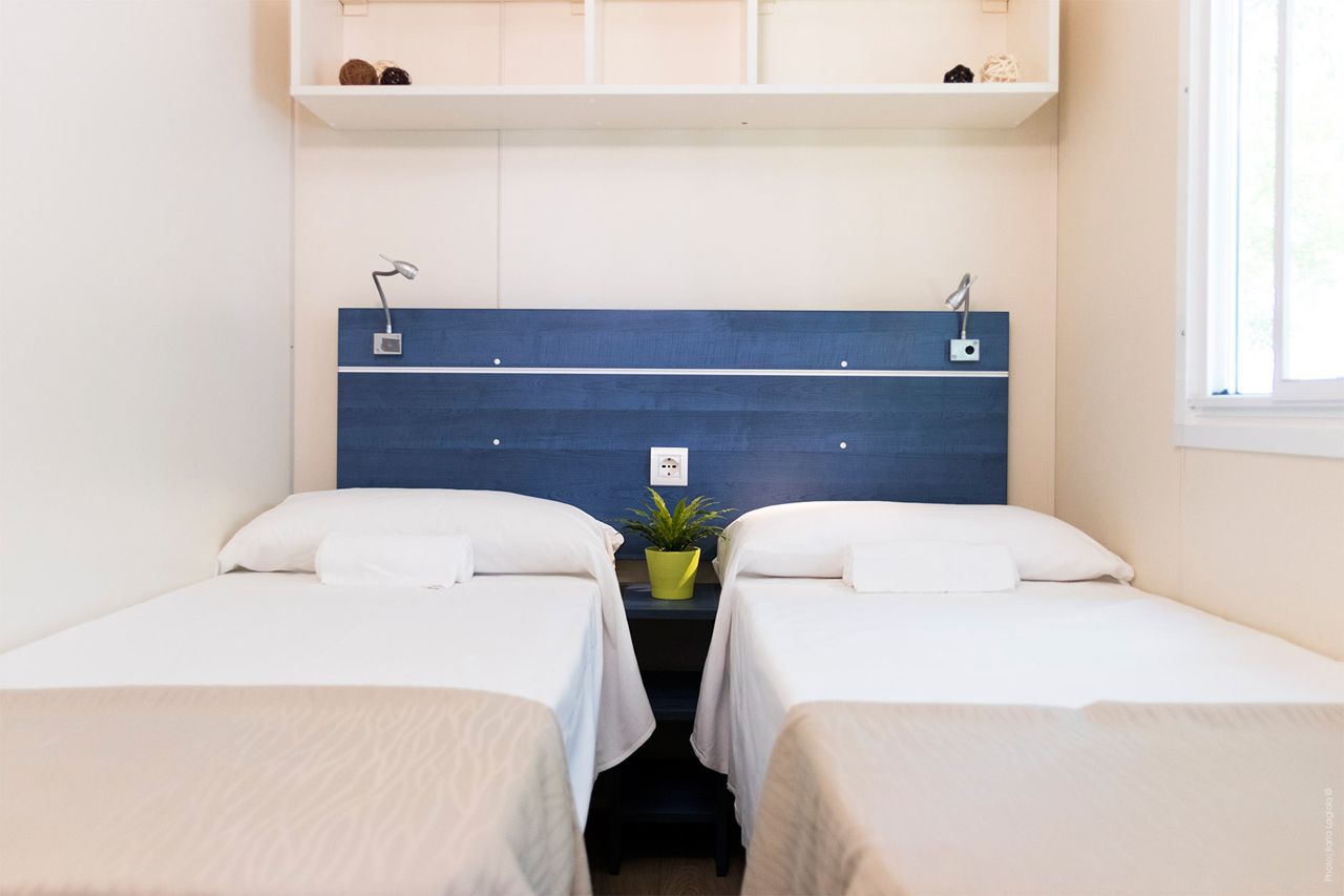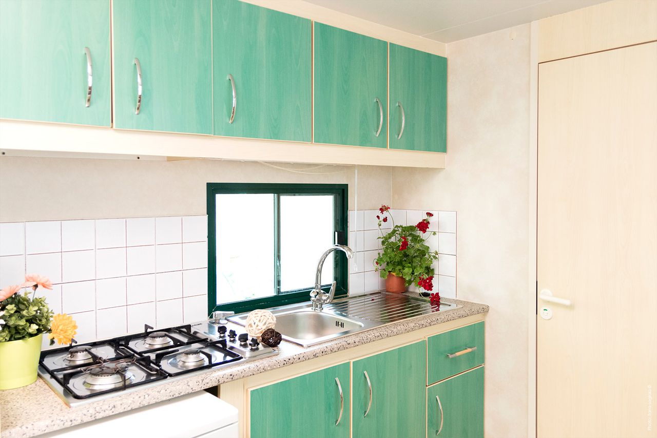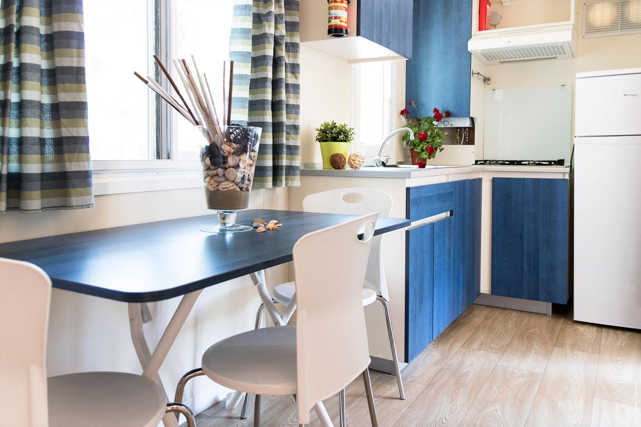 Casa Mobile composta da 1 camera matrimoniale con armadio; 1 camera con 2 letti e armadio, soggiorno con angolo cottura, bagno con tutti i servizi (no bidet), doccia, acqua calda, veranda in legno coperta attrezzata con tavoli e sedie.