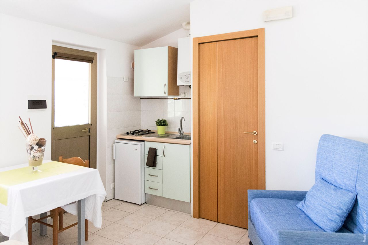 La Struttura, un monolocale 2/3 posti di circa 31 mq; un unico ambiente con letto matrimoniale, armadio a ponte, poltrona letto e angolo cottura, dispone di un bagno completo di tutti i servizi igienici, di una veranda attrezzata con tavolo e sedie e di giardino.