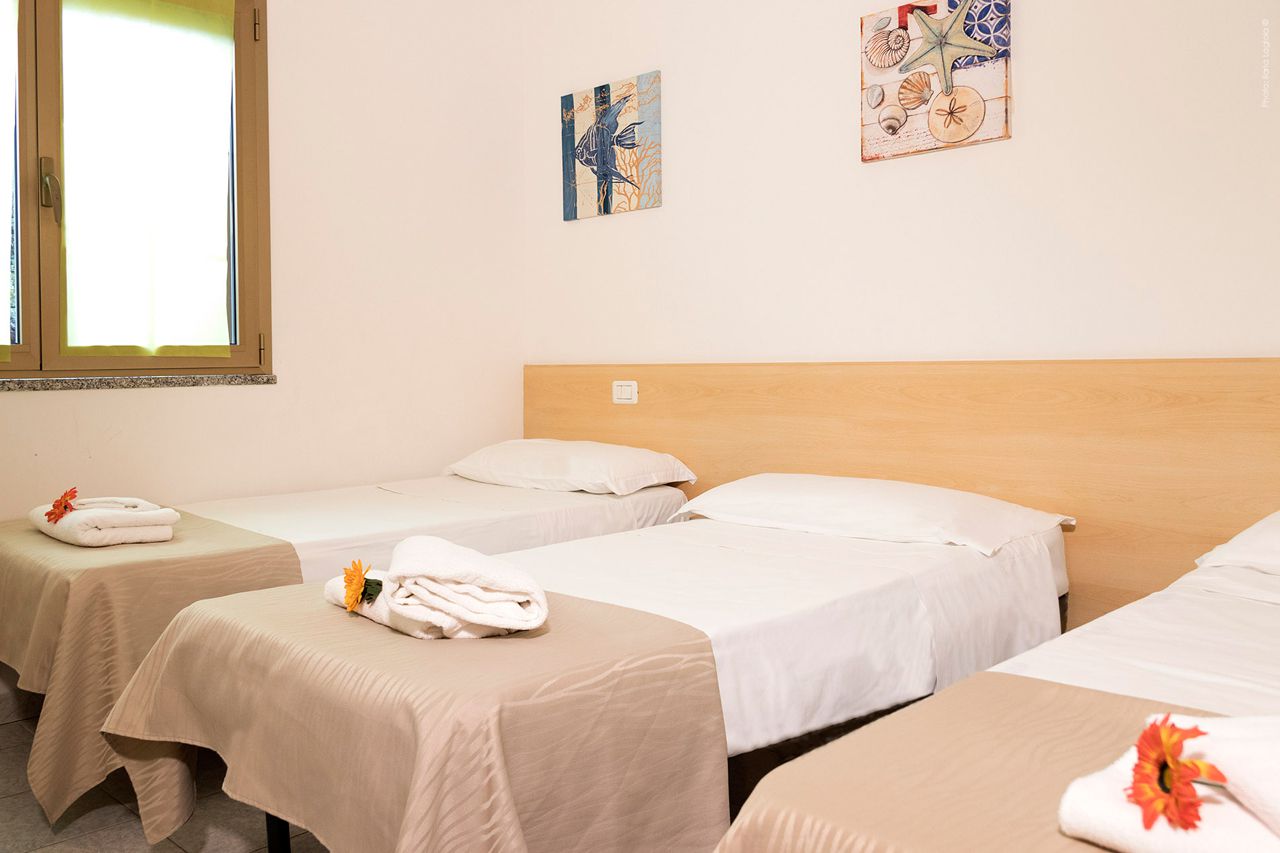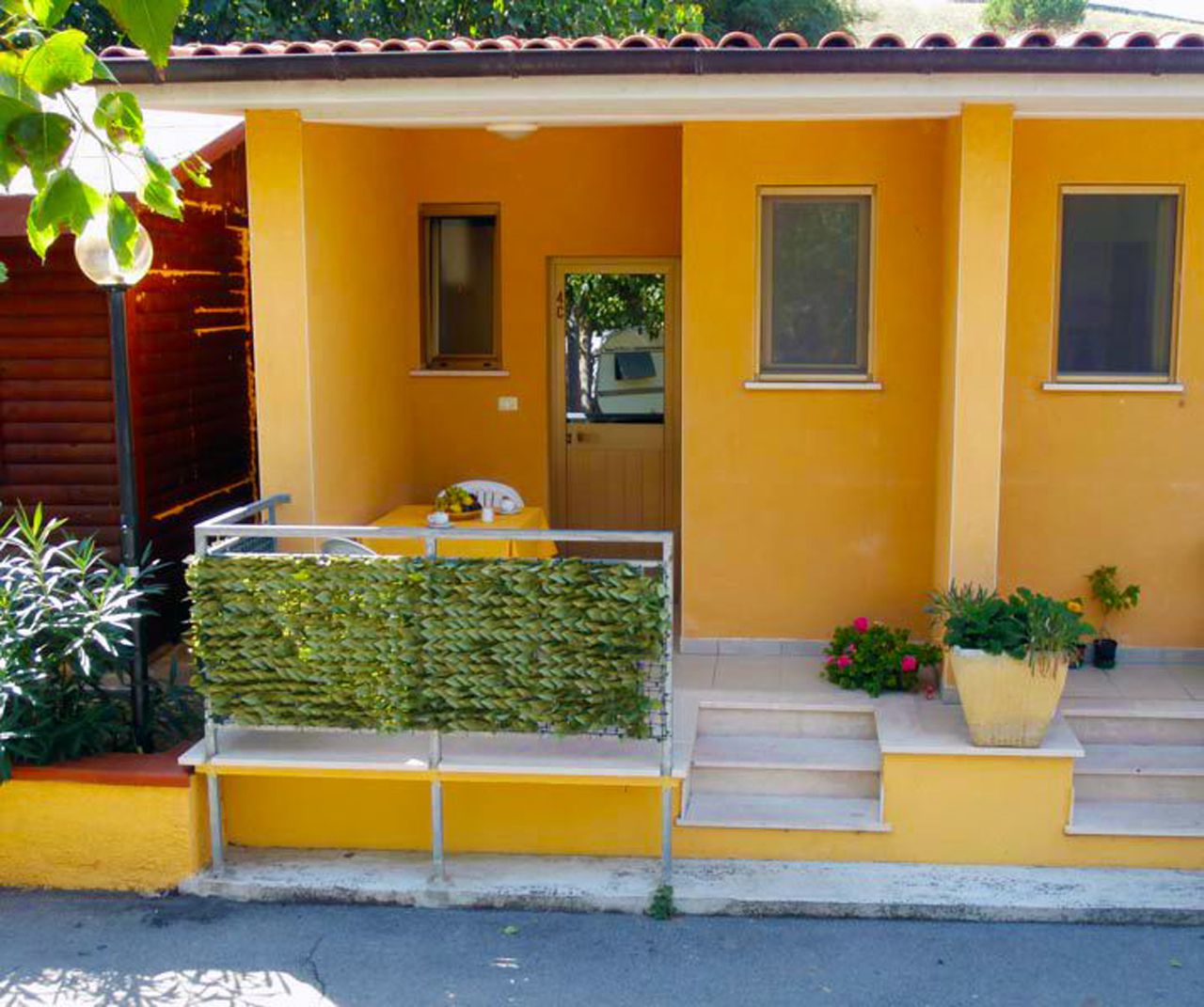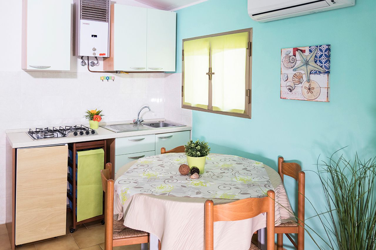 La struttura, un trilocale 4/5 posti di circa 36,00 mq, è composta da 1 camera da letto matrimoniale con armadio; 1 camera da letto con 2 letti singoli e piccolo armadio; zona giorno con angolo cottura e divano letto (1 piazza); inoltre dispone di un bagno completo di tutti i servizi igienici (escluso bidet) e di una veranda attrezzata con tavolo e sedie. L’angolo cottura è già attrezzato con una fornitura di base con stoviglie, piatti , bicchieri e posate (mancano caffettiera e biancheria da cucina) inoltre nella struttura è già predisposta la 1° fornitura di biancheria da letto.
