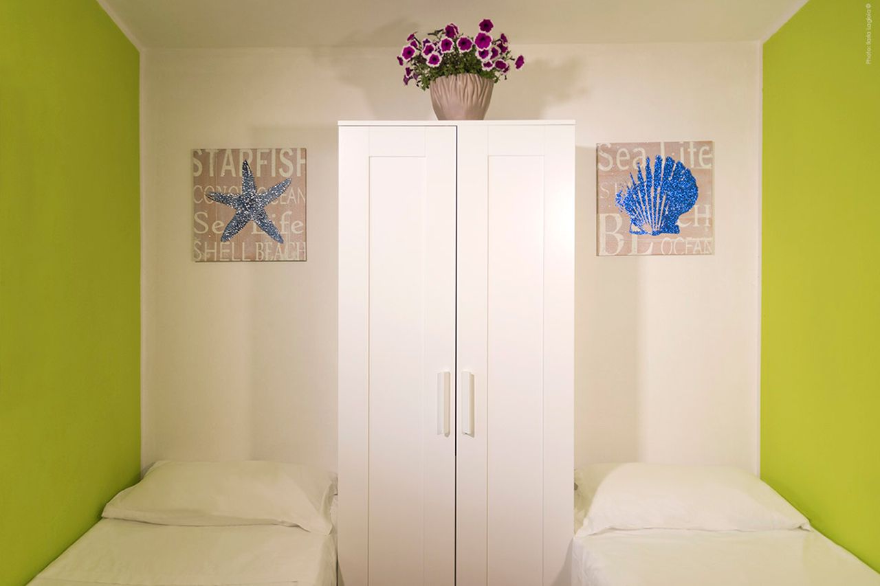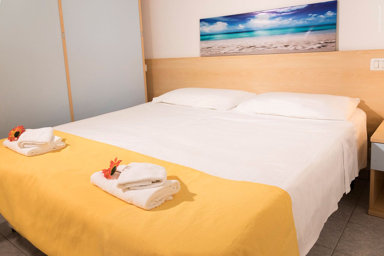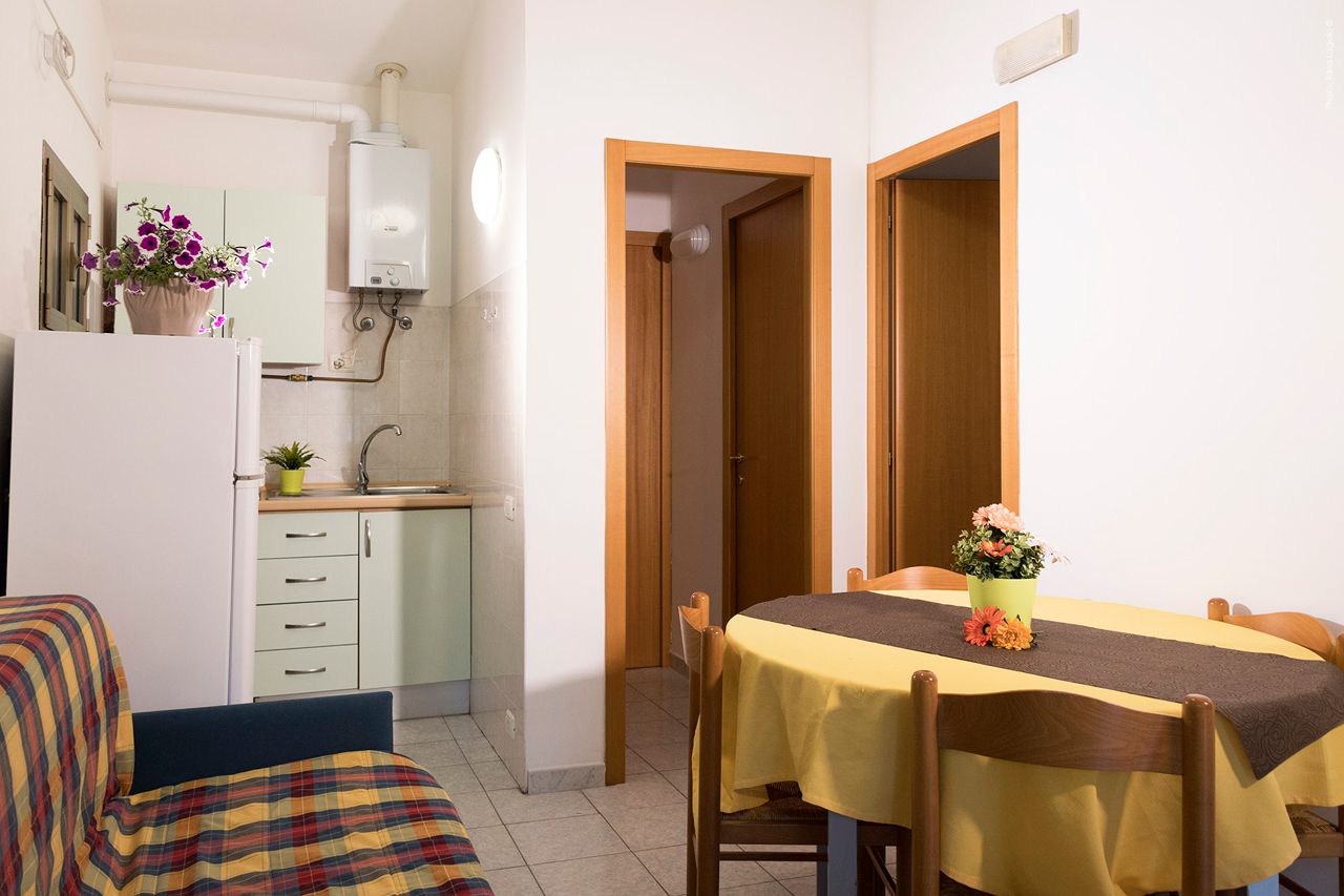 La struttura, un trilocale 4/5 posti di circa 36,00 mq, è composta da 1 camera da letto matrimoniale con armadio; 1 camera da letto con 2 letti singoli e piccolo armadio; zona giorno con angolo cottura e divano letto (1 piazza); inoltre dispone di un bagno completo di tutti i servizi igienici (escluso bidet) e di una veranda attrezzata con tavolo e sedie. L’angolo cottura è già attrezzato con una fornitura di base con stoviglie, piatti , bicchieri e posate (mancano caffettiera e biancheria da cucina) inoltre nella struttura è già predisposta la 1° fornitura di biancheria da letto.