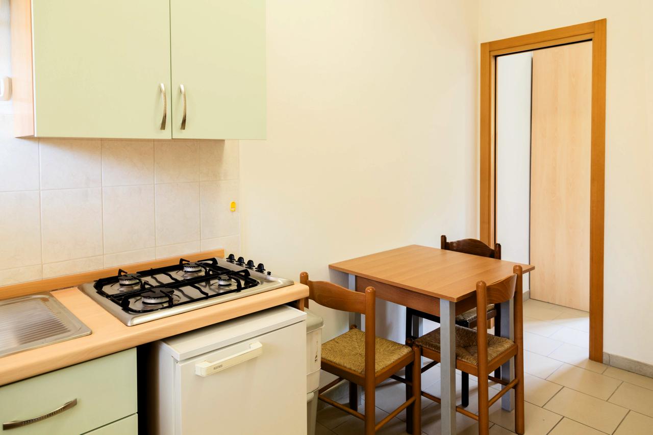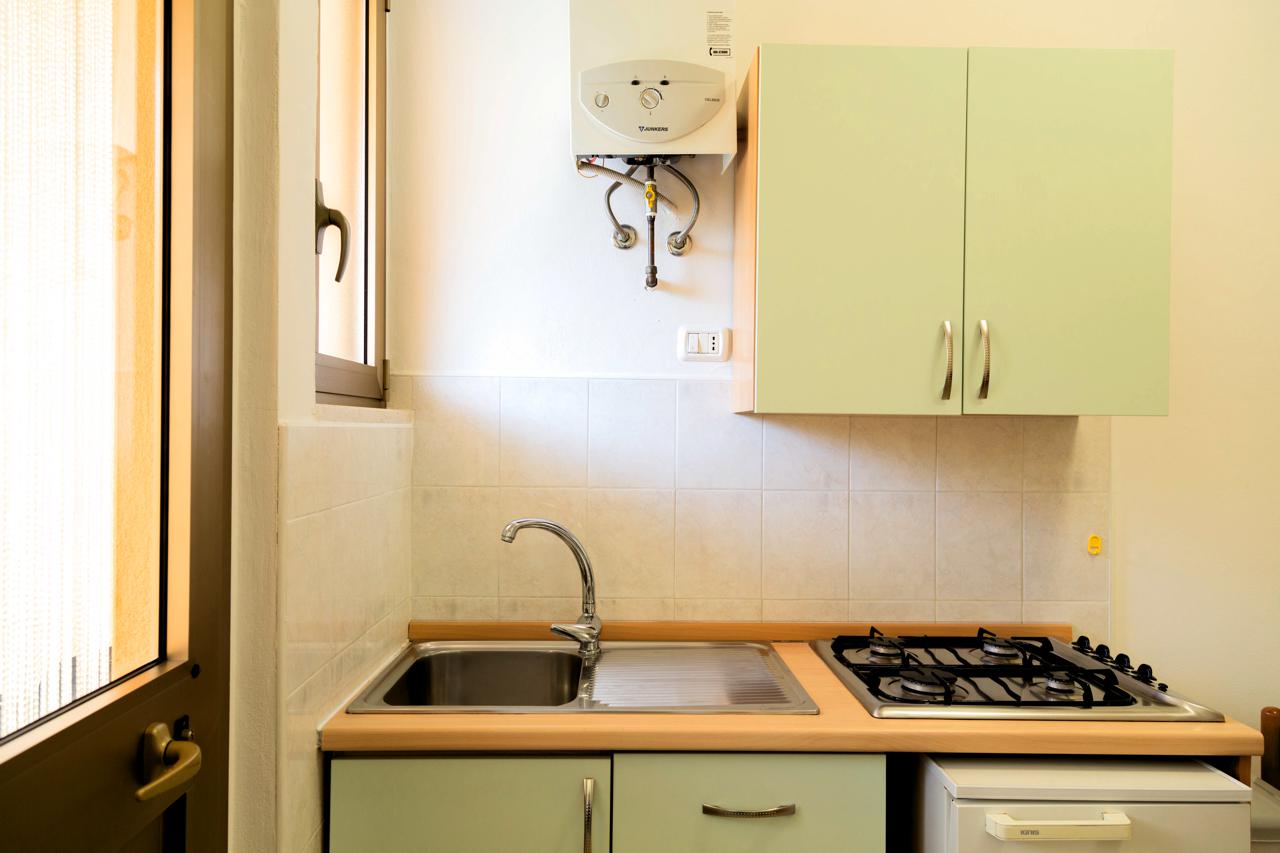 L’angolo cottura è attrezzato con una fornitura base di stoviglie, piatti, bicchieri e posate (mancano caffettiera e biancheria da cucina).
