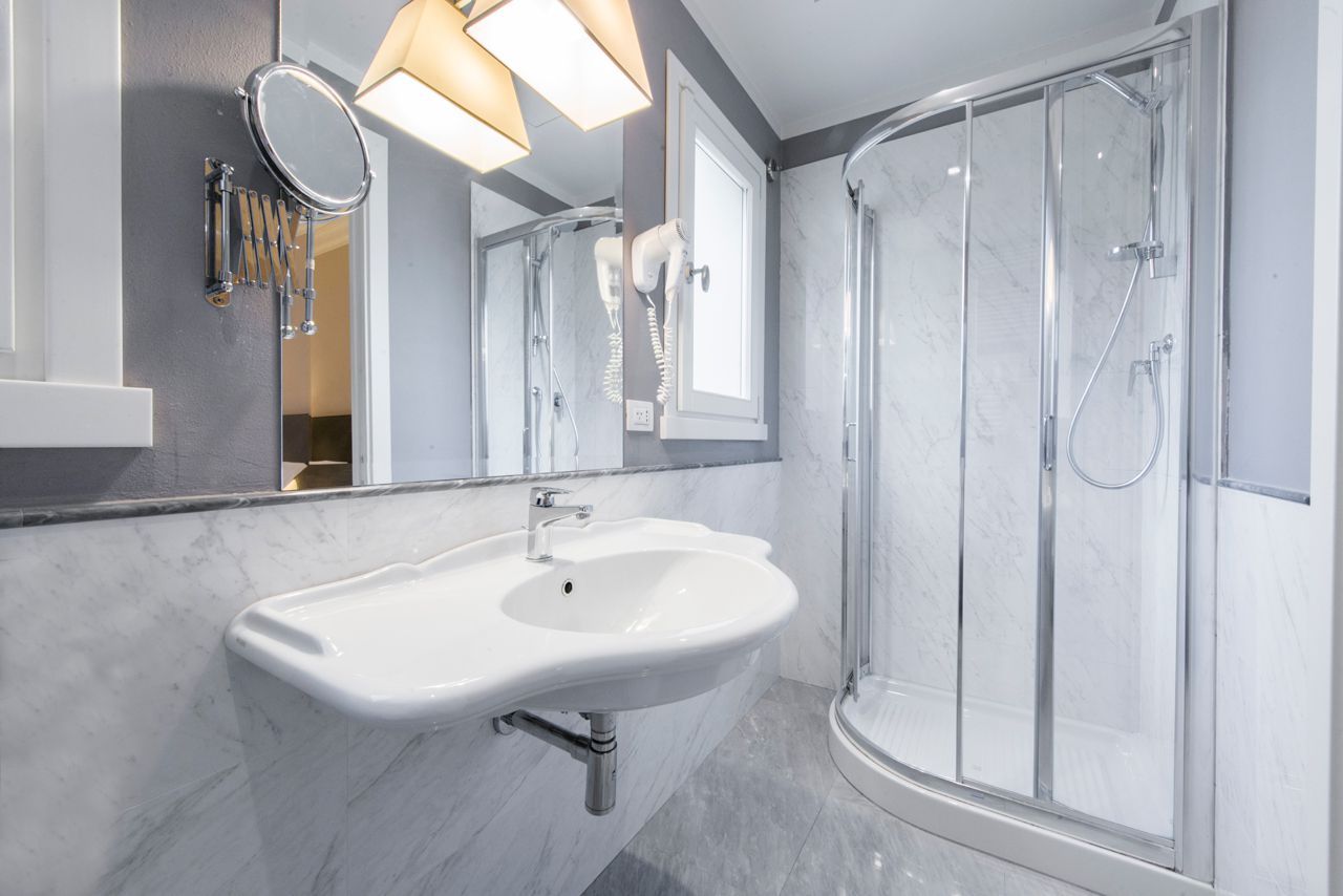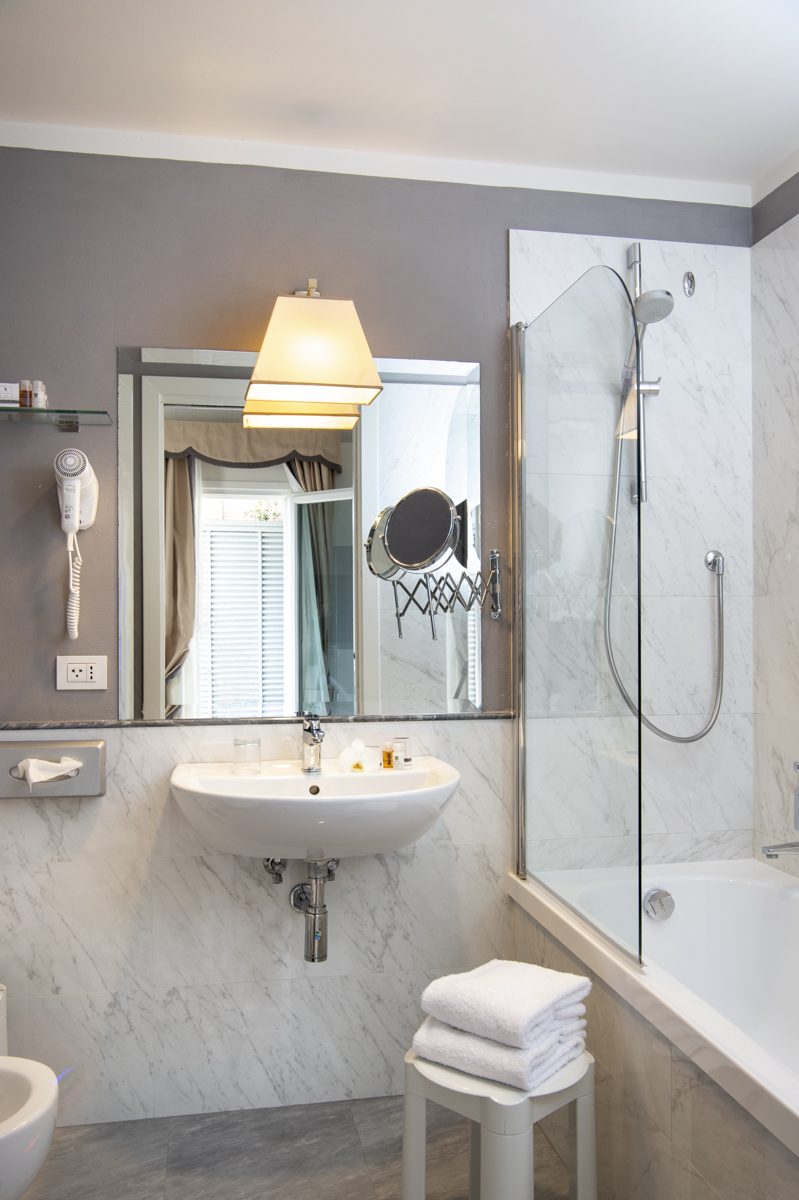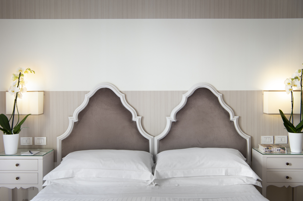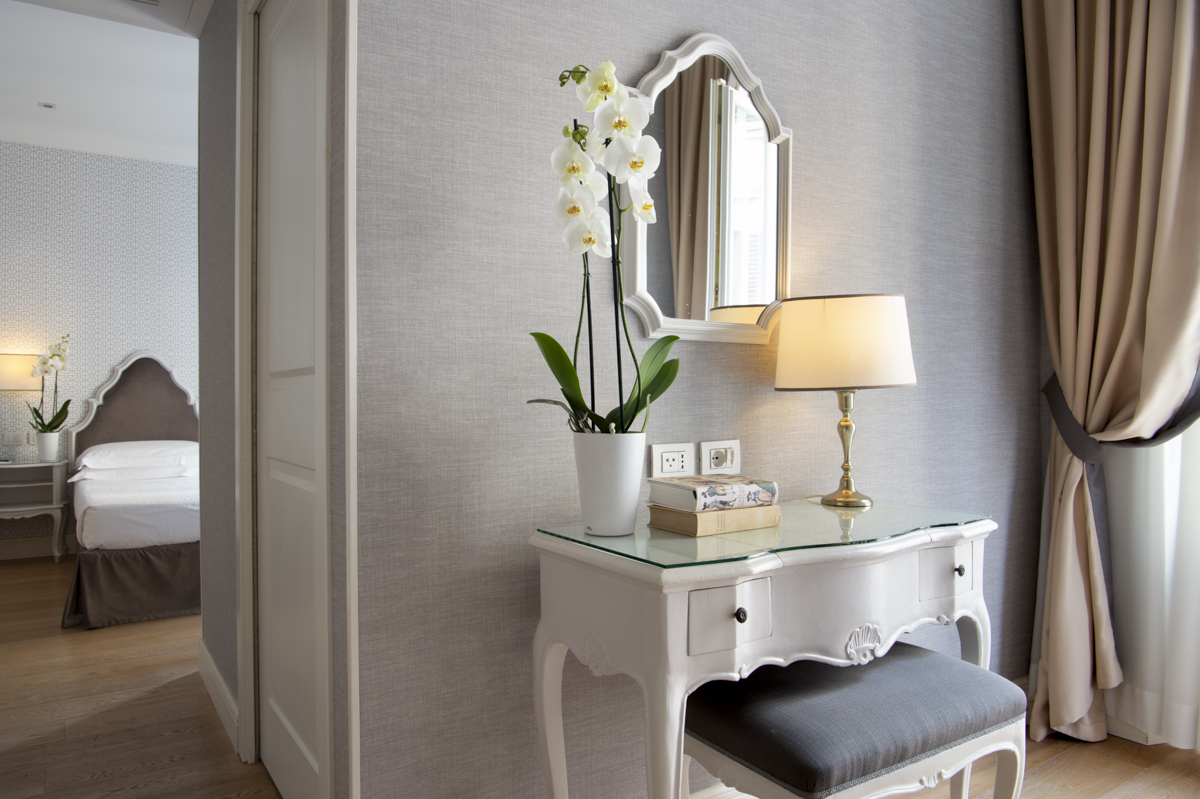 Camera elegante con arredi bianchi in stile classico, parquet, connessione Wi-Fi gratuita, minibar, macchinetta per tè e caffè e TV a schermo piatto con canali satellitari e pay-per-view.