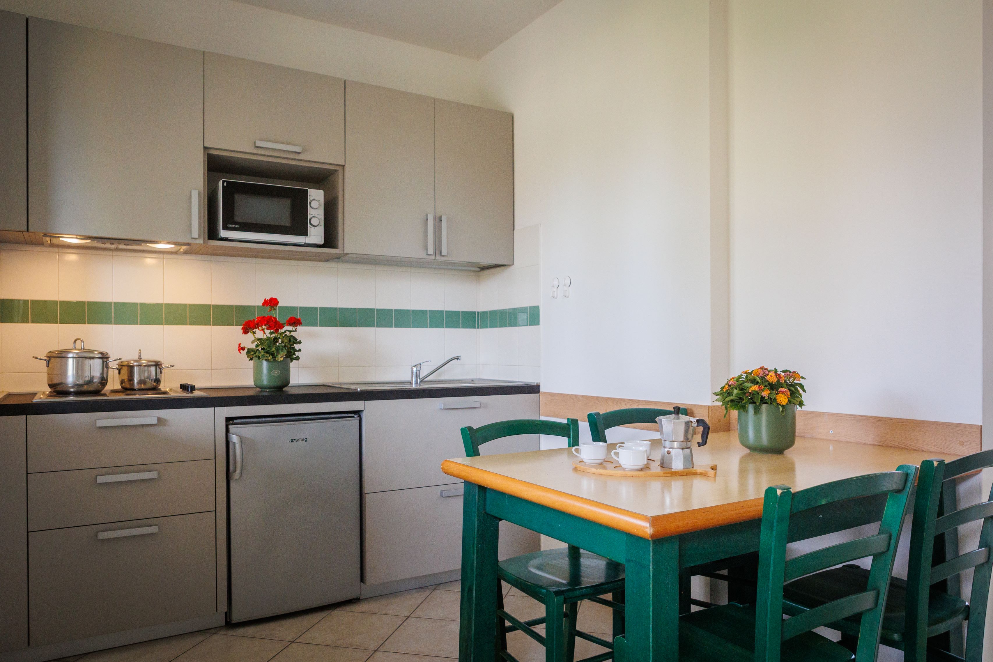quite area-two rooms apartment - small living room with kitchenette anddouble sofa bed + bedroom with double bed and single bed + bathroom with shower and hair dryer + small patio with table and chairs and small garden not fenced - ANIMALS NOT ALLOWED
