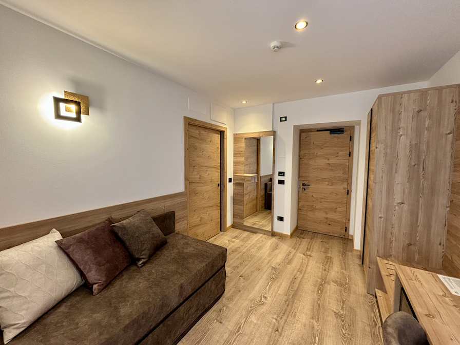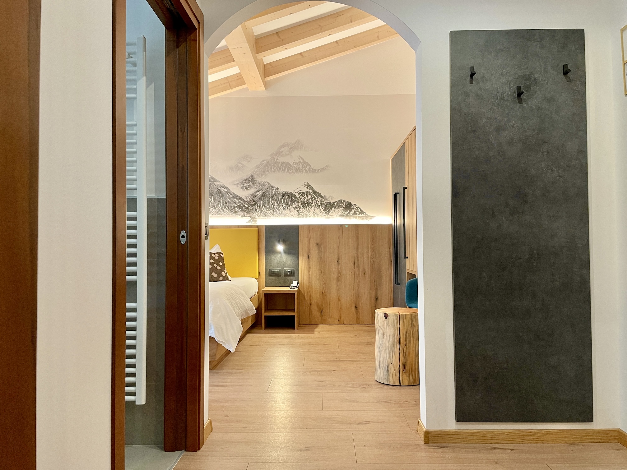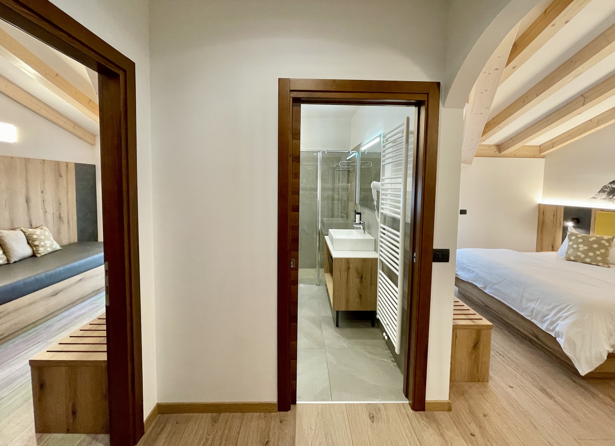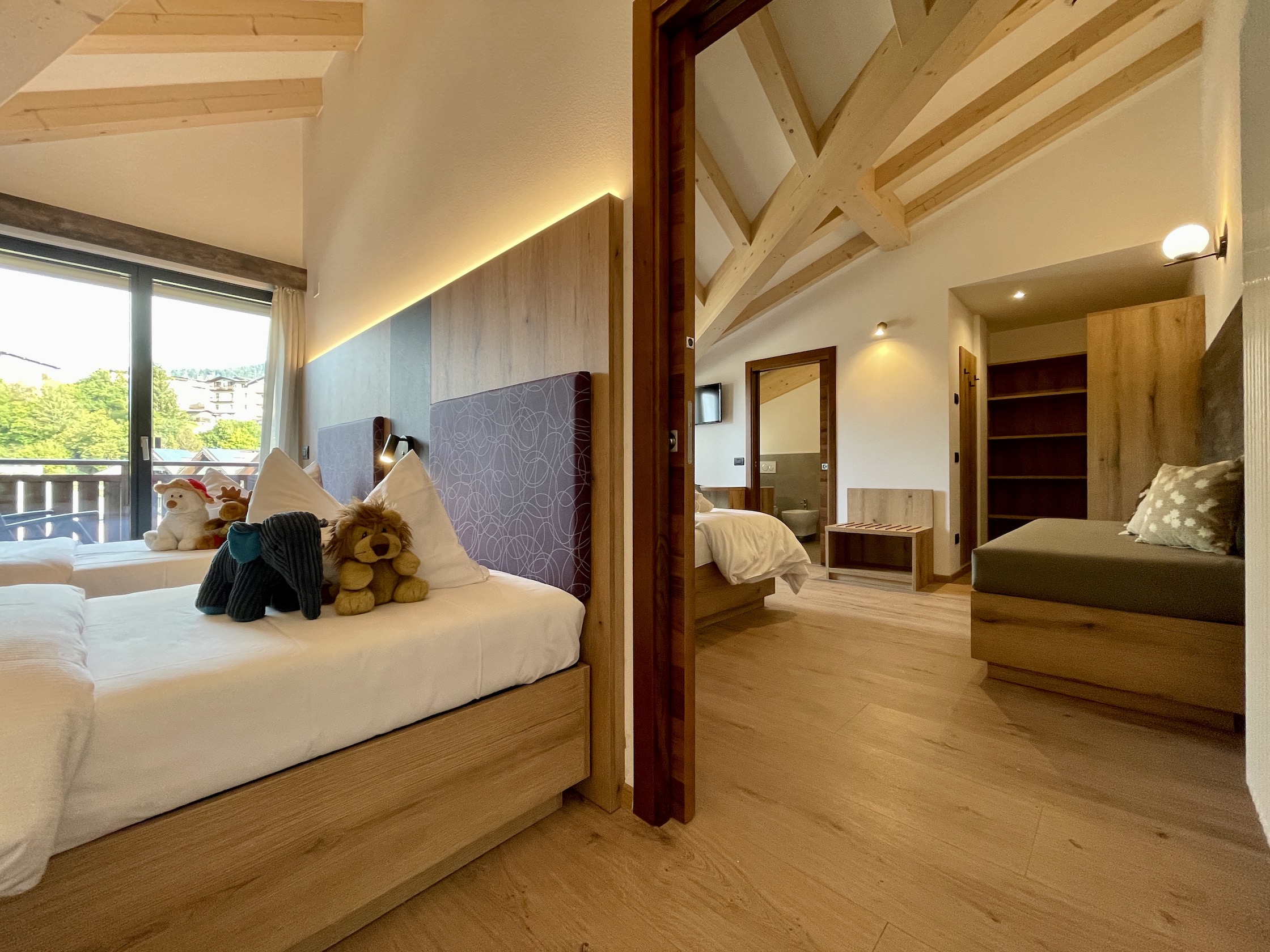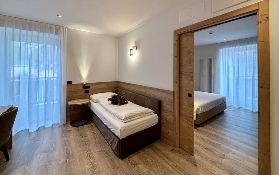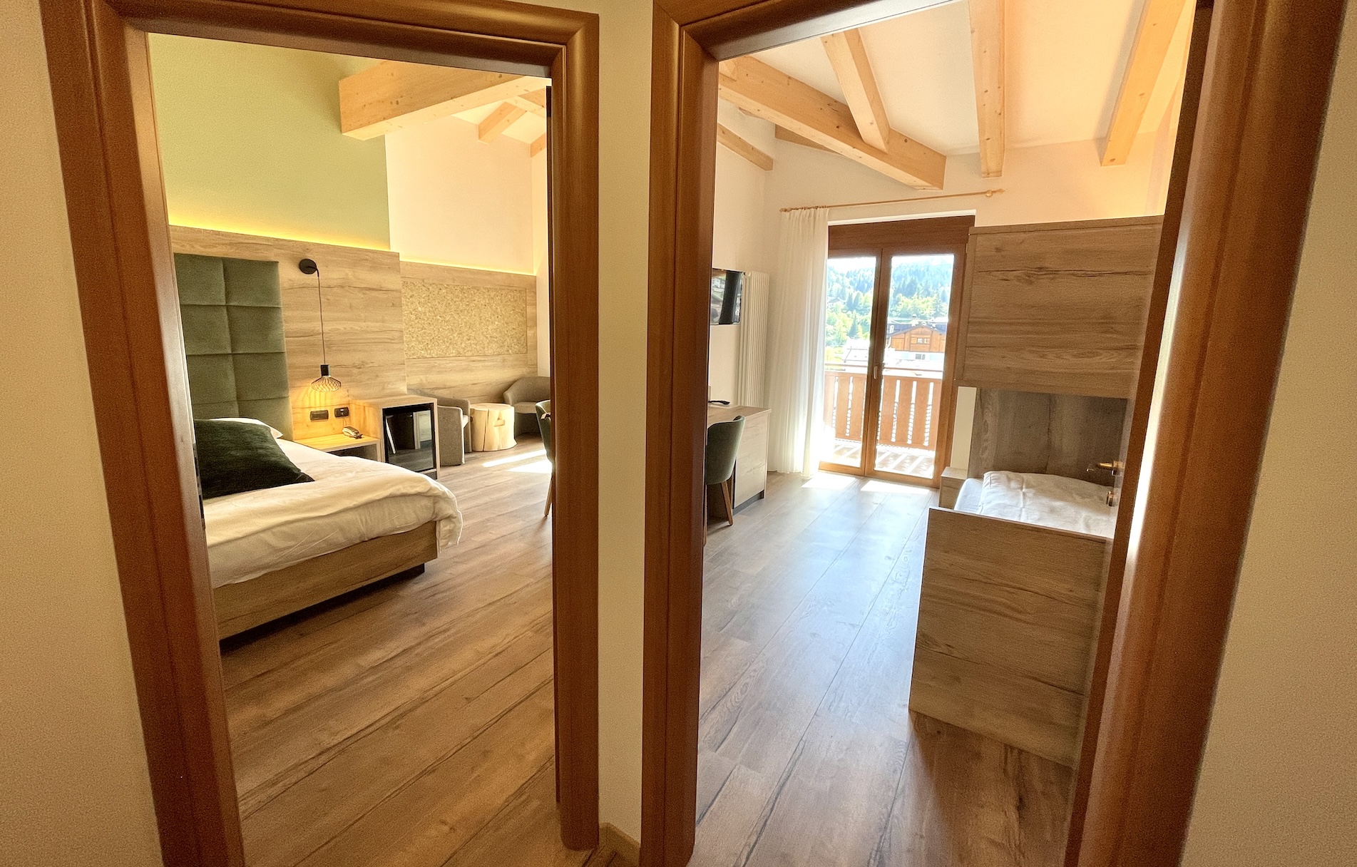 Scopri la nostra nuovissima Family Alpina, stanza che, con i suoi ambienti separati e i due bagni garantisce la privacy e comodità di casa.