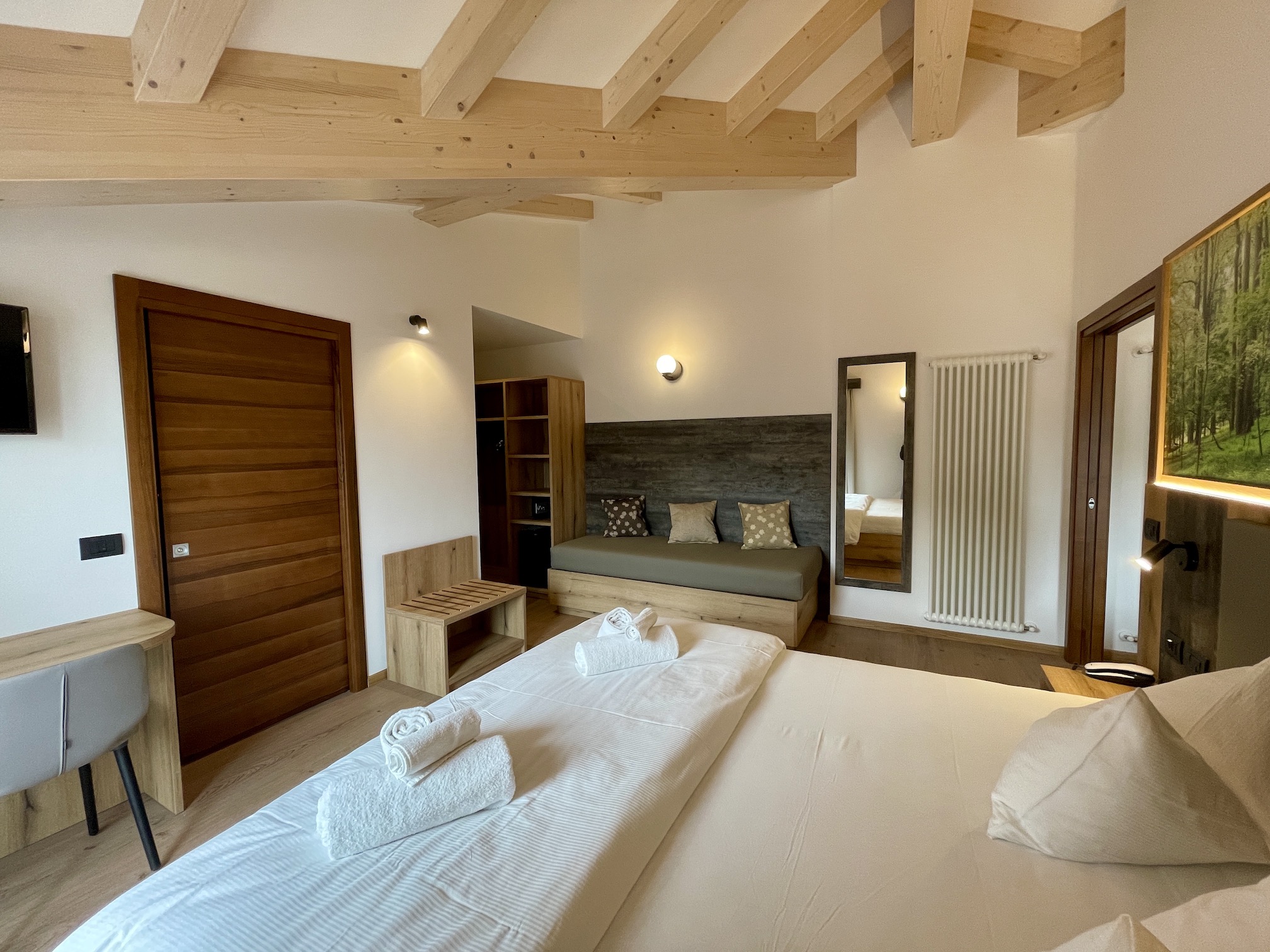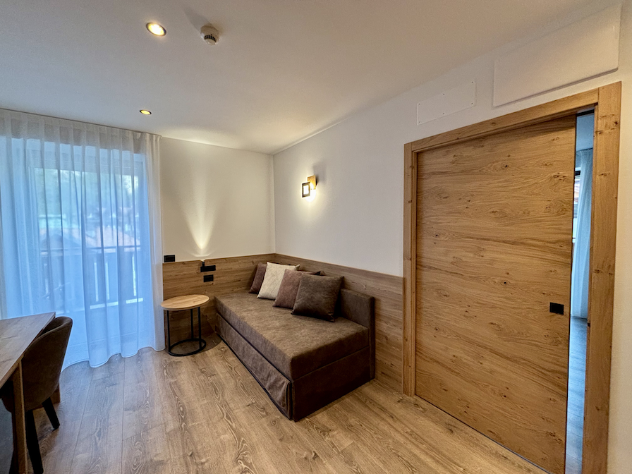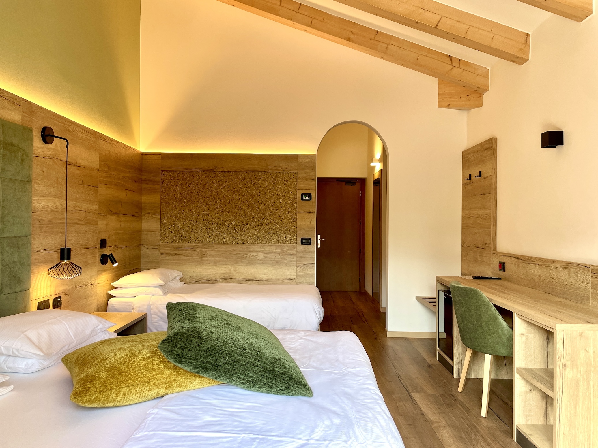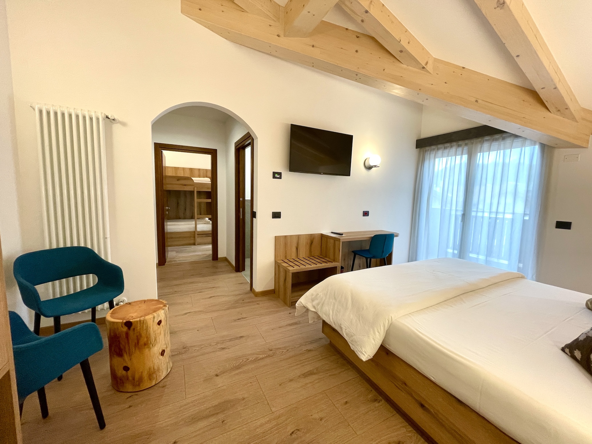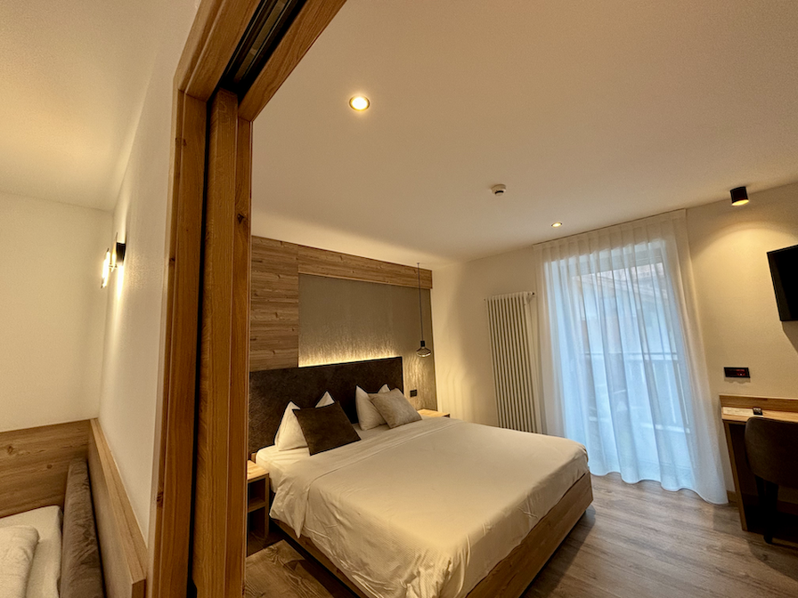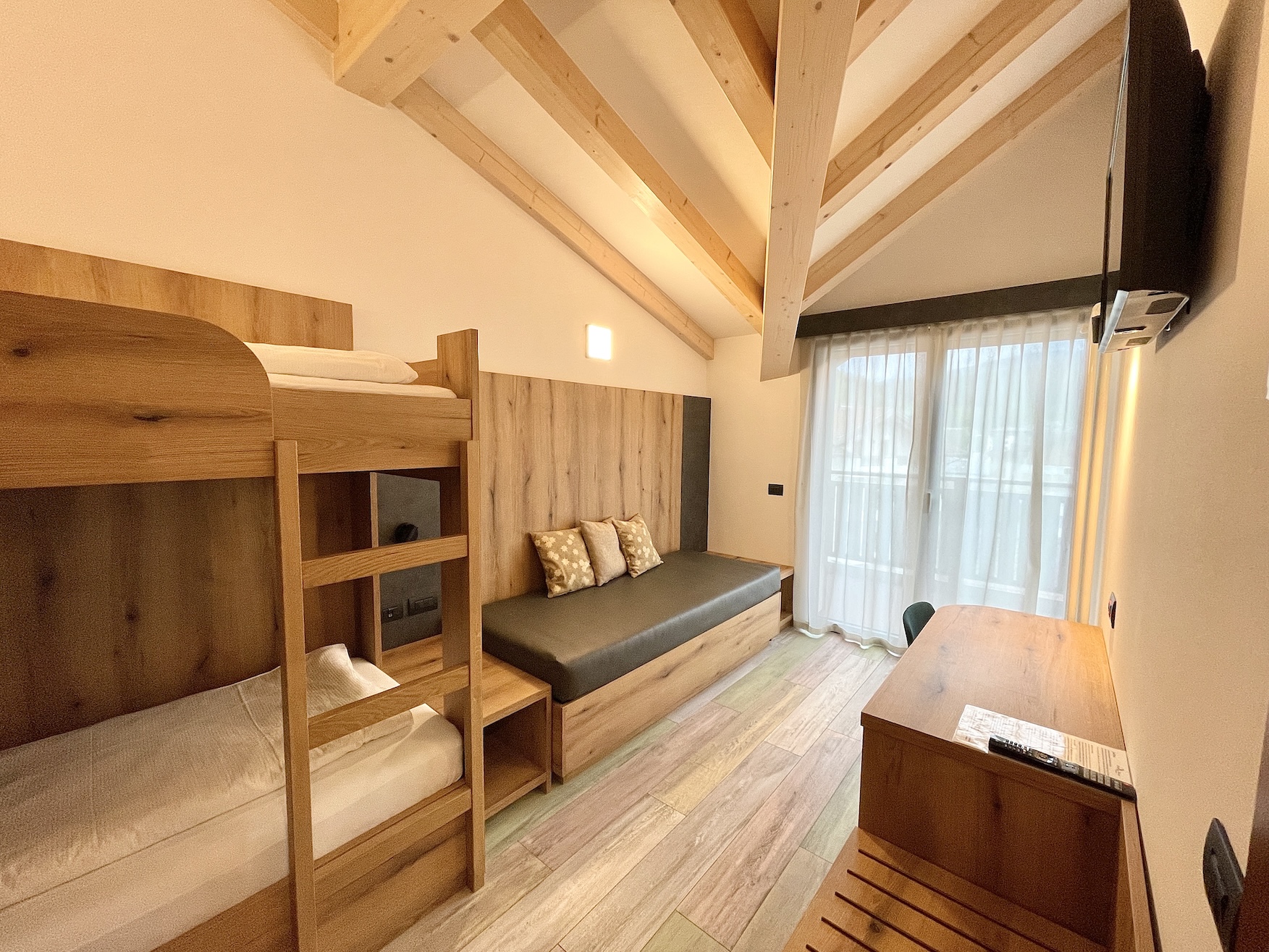 Scopri la nostra nuovissima Family Alpina, stanza che, con i suoi ambienti separati e i due bagni garantisce la privacy e comodità di casa.