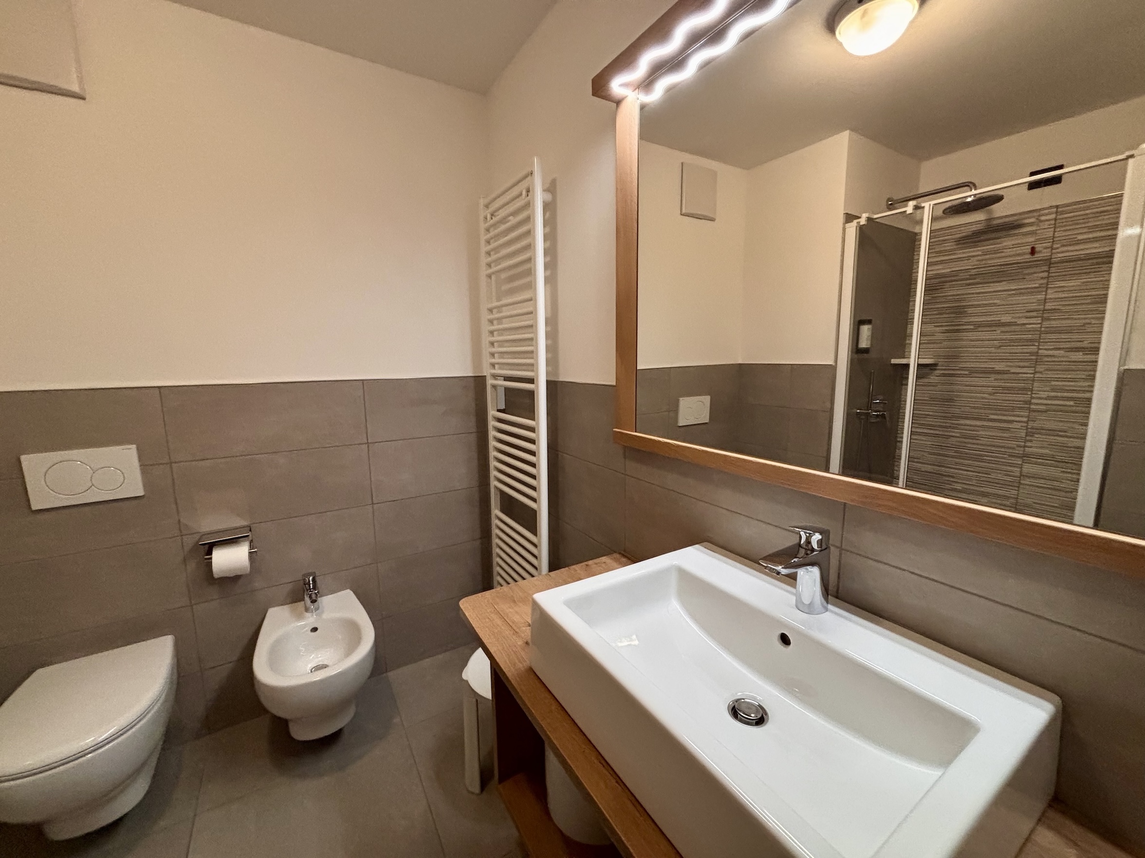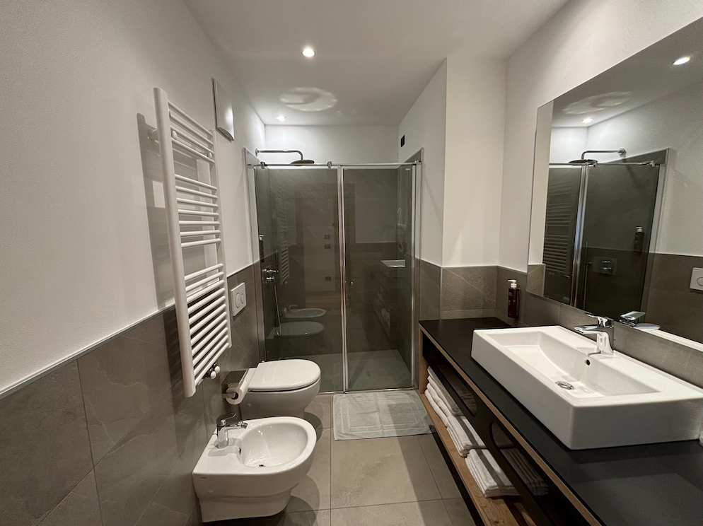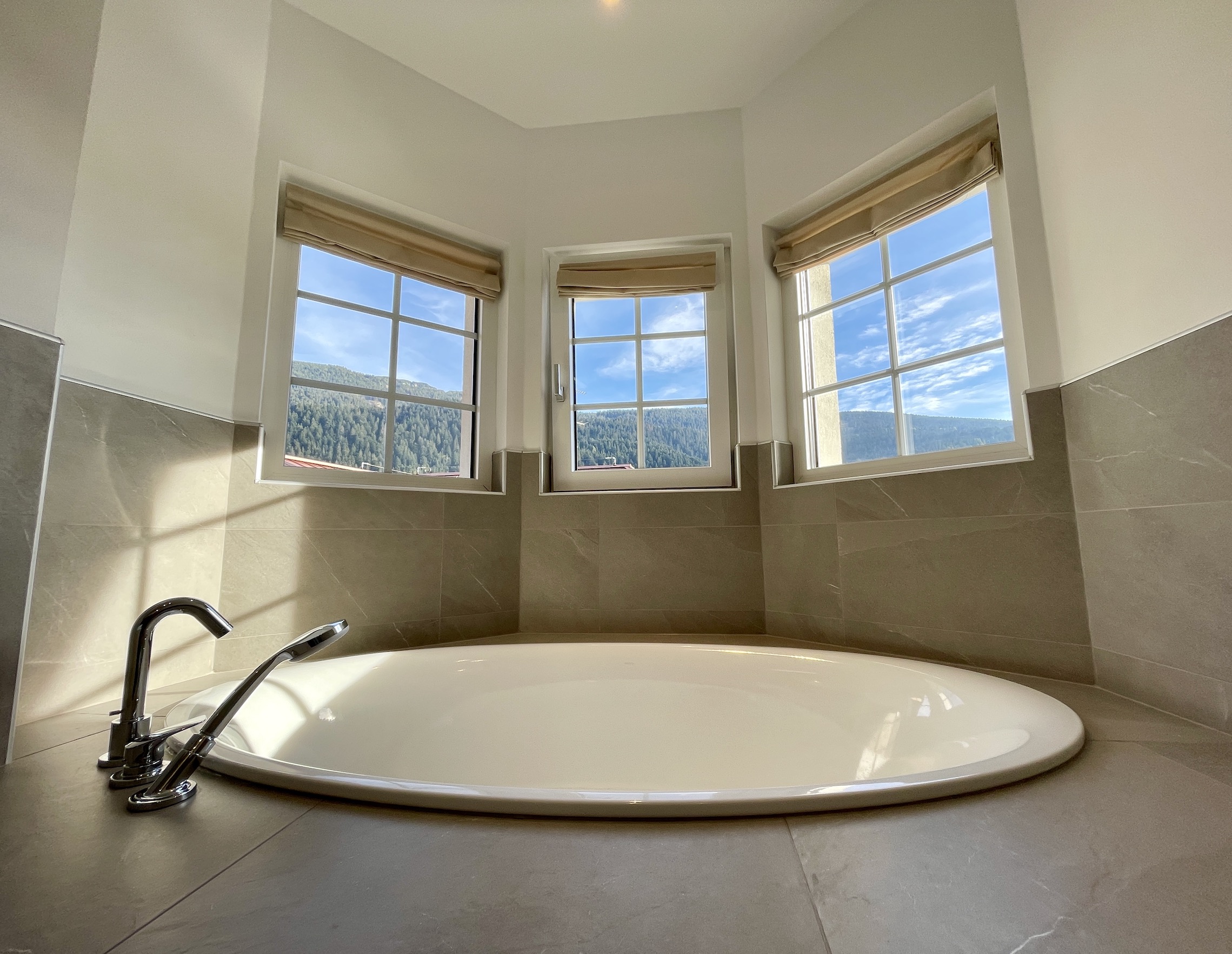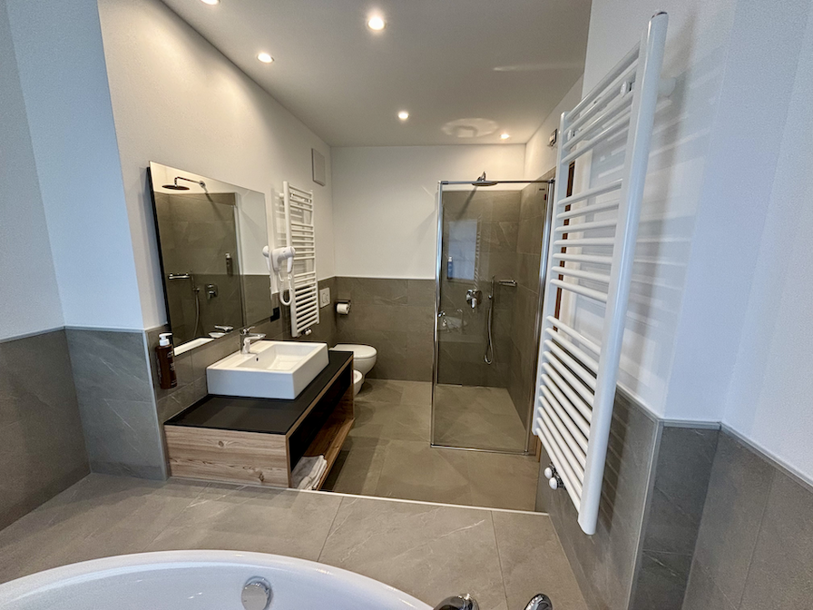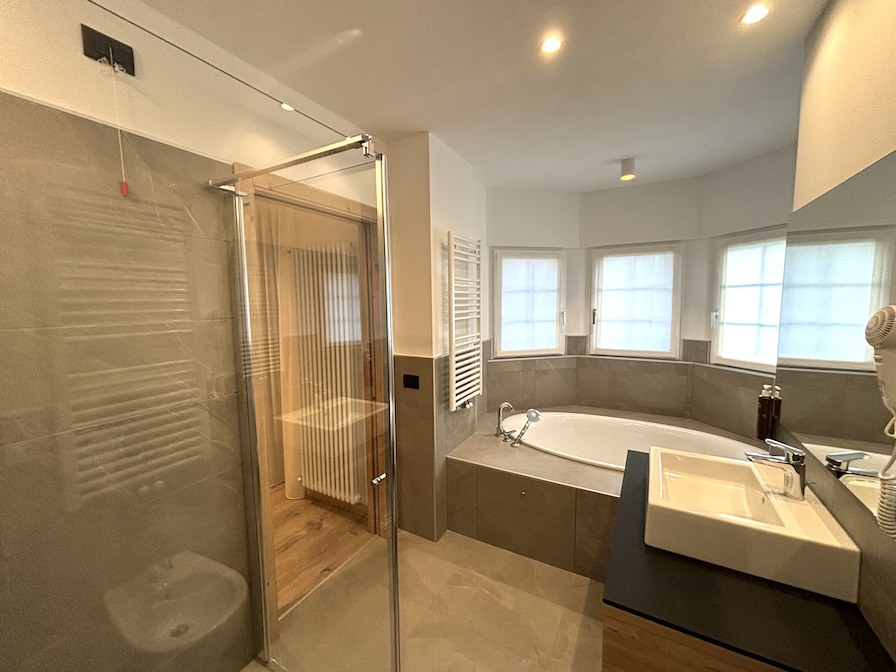 Nell'ampio bagno troverai una vasca ad aspettarti dopo le lunghe camminate o una giornata sugli sci.