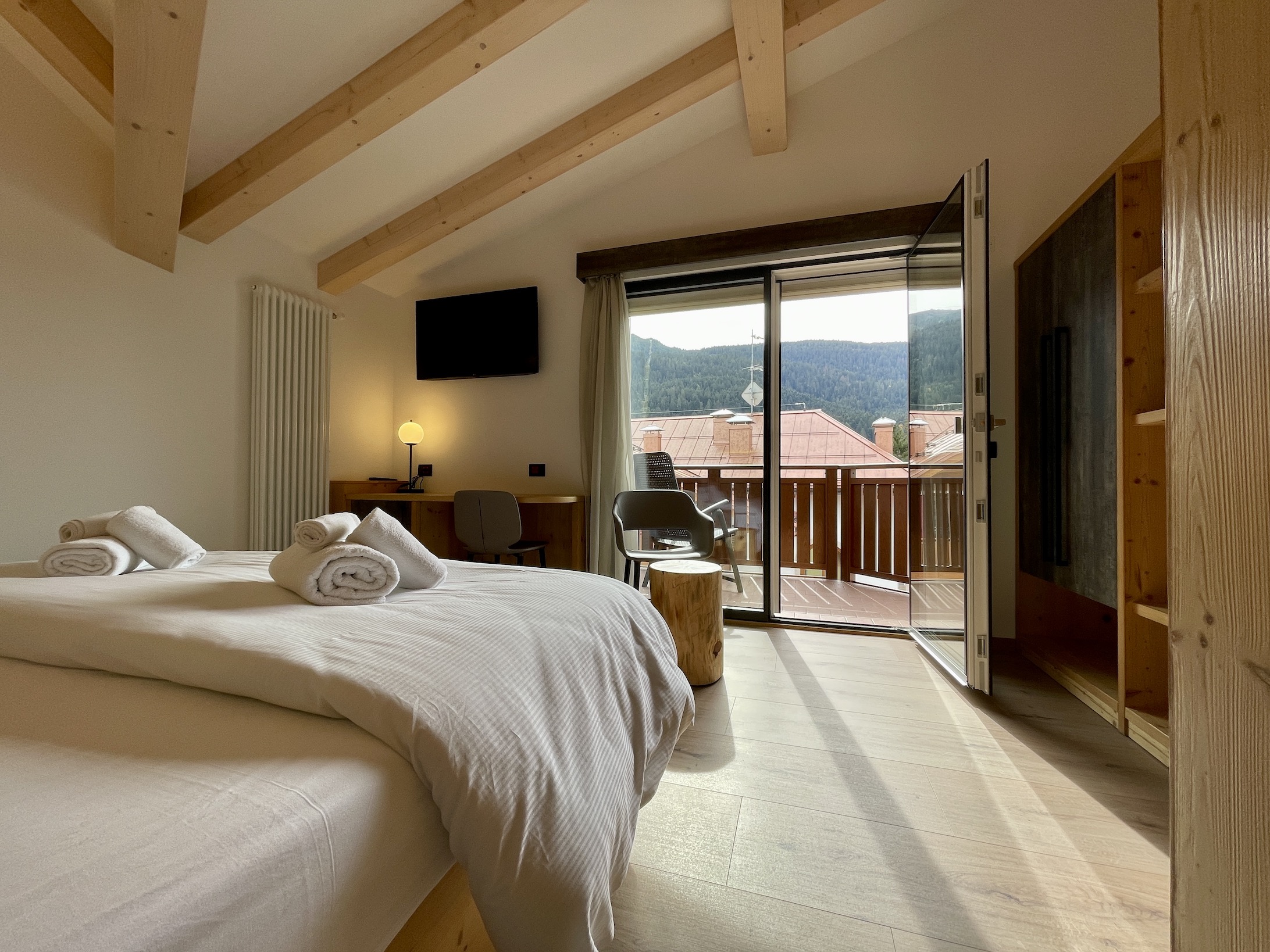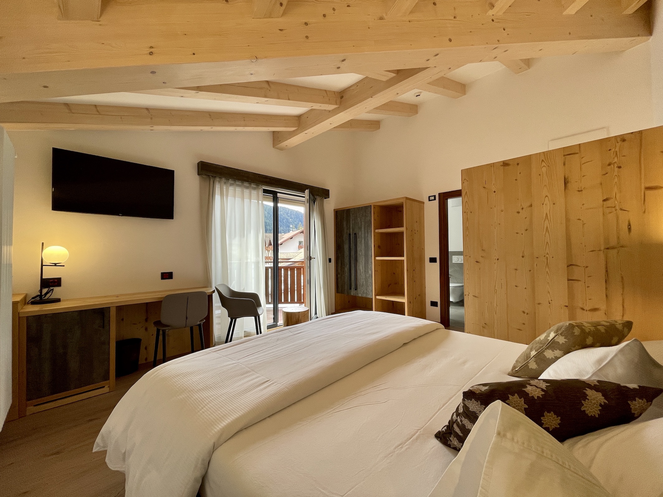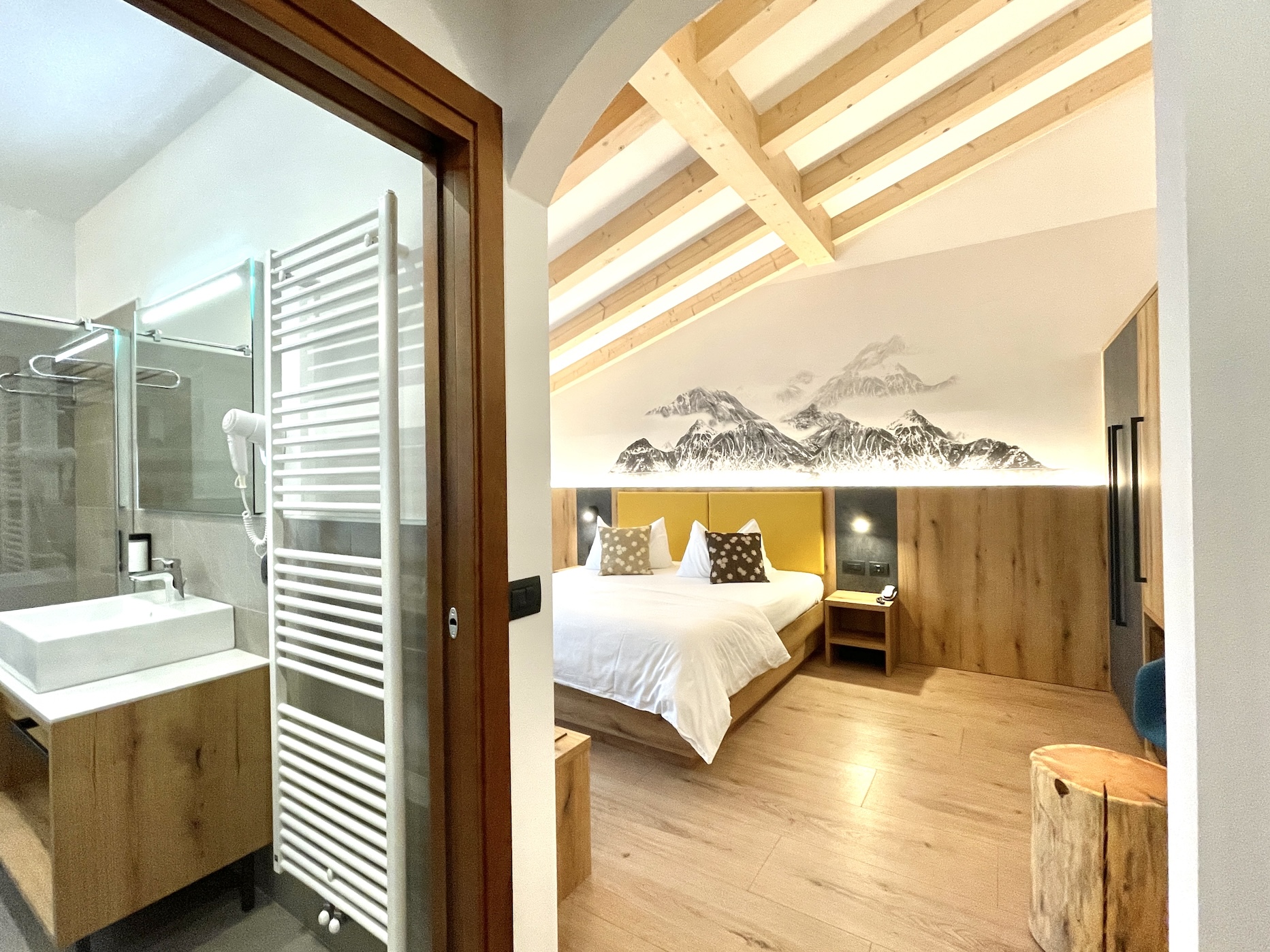 Due ambienti separati per soddisfare al meglio le esigenze di privacy e comodità, proprio come a casa. La caratteristica che contraddistingue questa stanza, oltre all'arredamento moderno ma al contempo montano, è la sua magnifica vista sulle Dolomiti di Brenta.