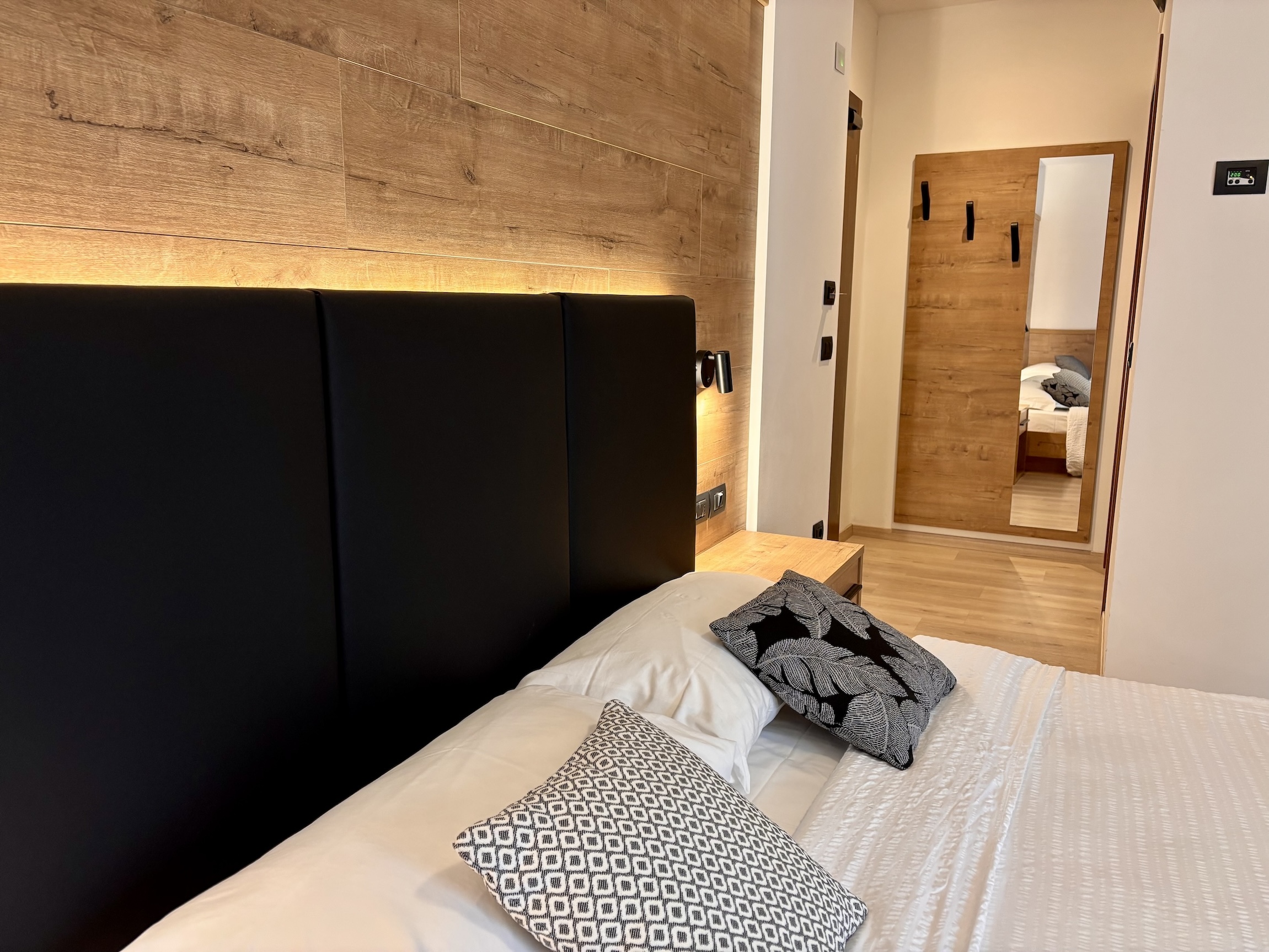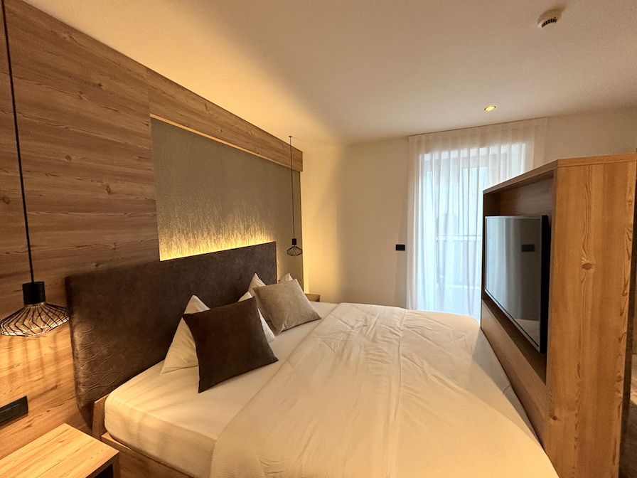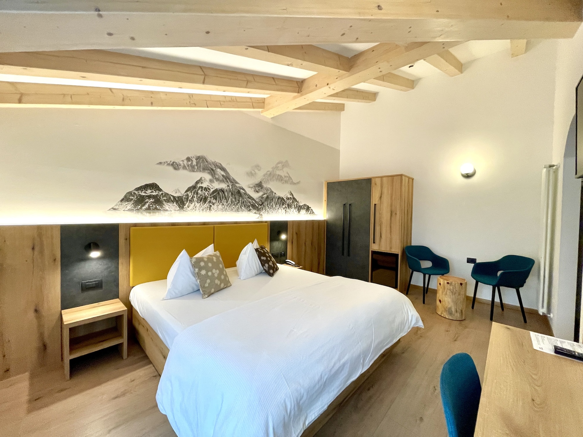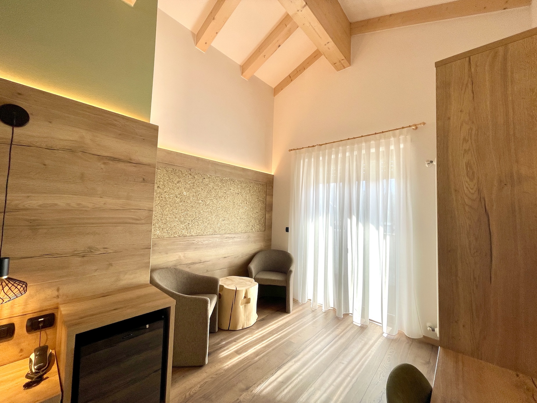 Due ambienti separati per soddisfare al meglio le esigenze di privacy e comodità, proprio come a casa. La caratteristica che contraddistingue questa stanza, oltre all'arredamento moderno ma al contempo montano, è la sua magnifica vista sulle Dolomiti di Brenta.