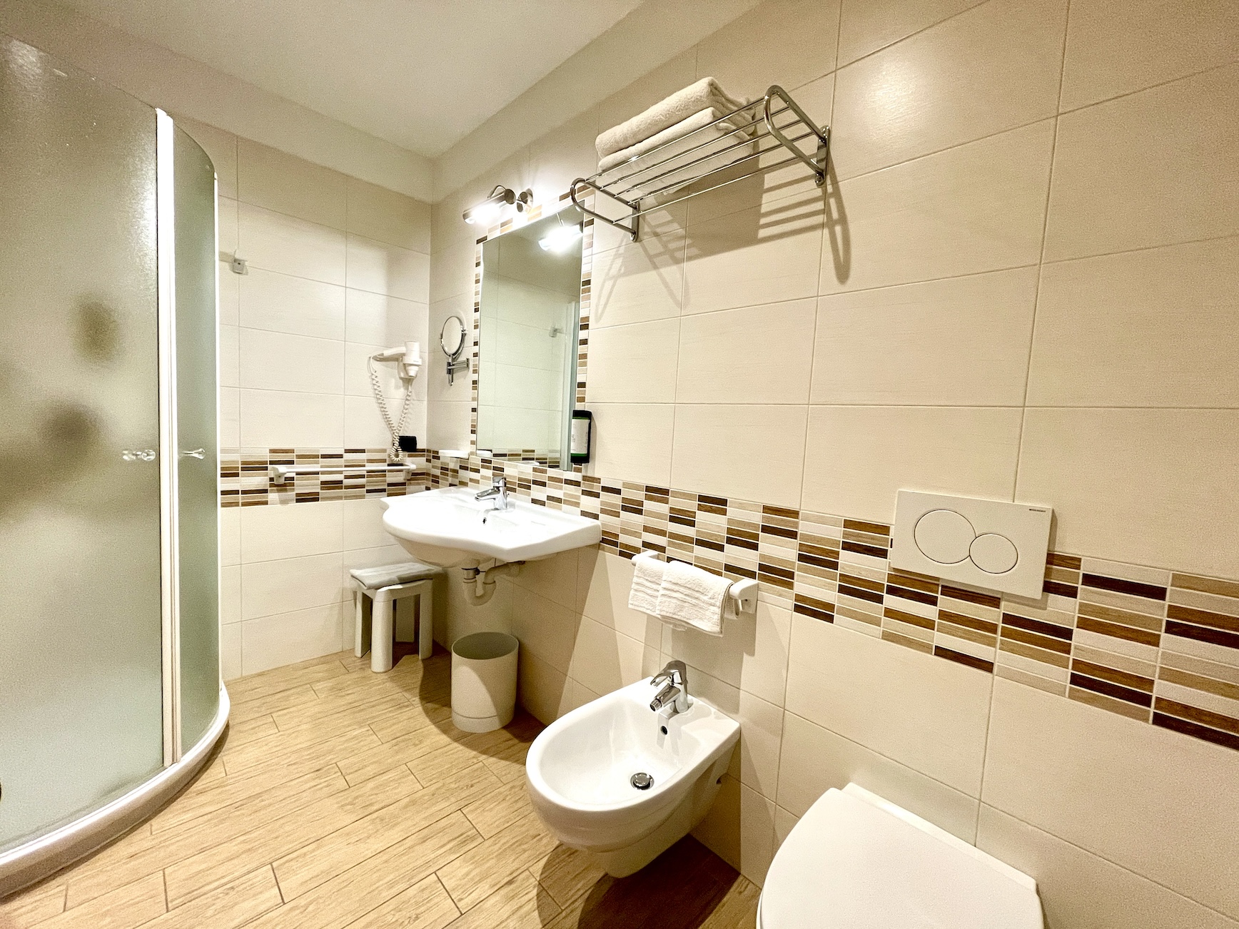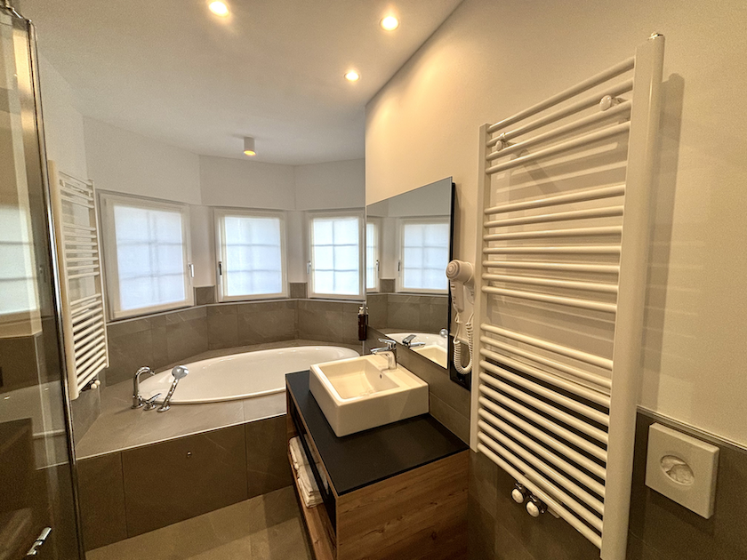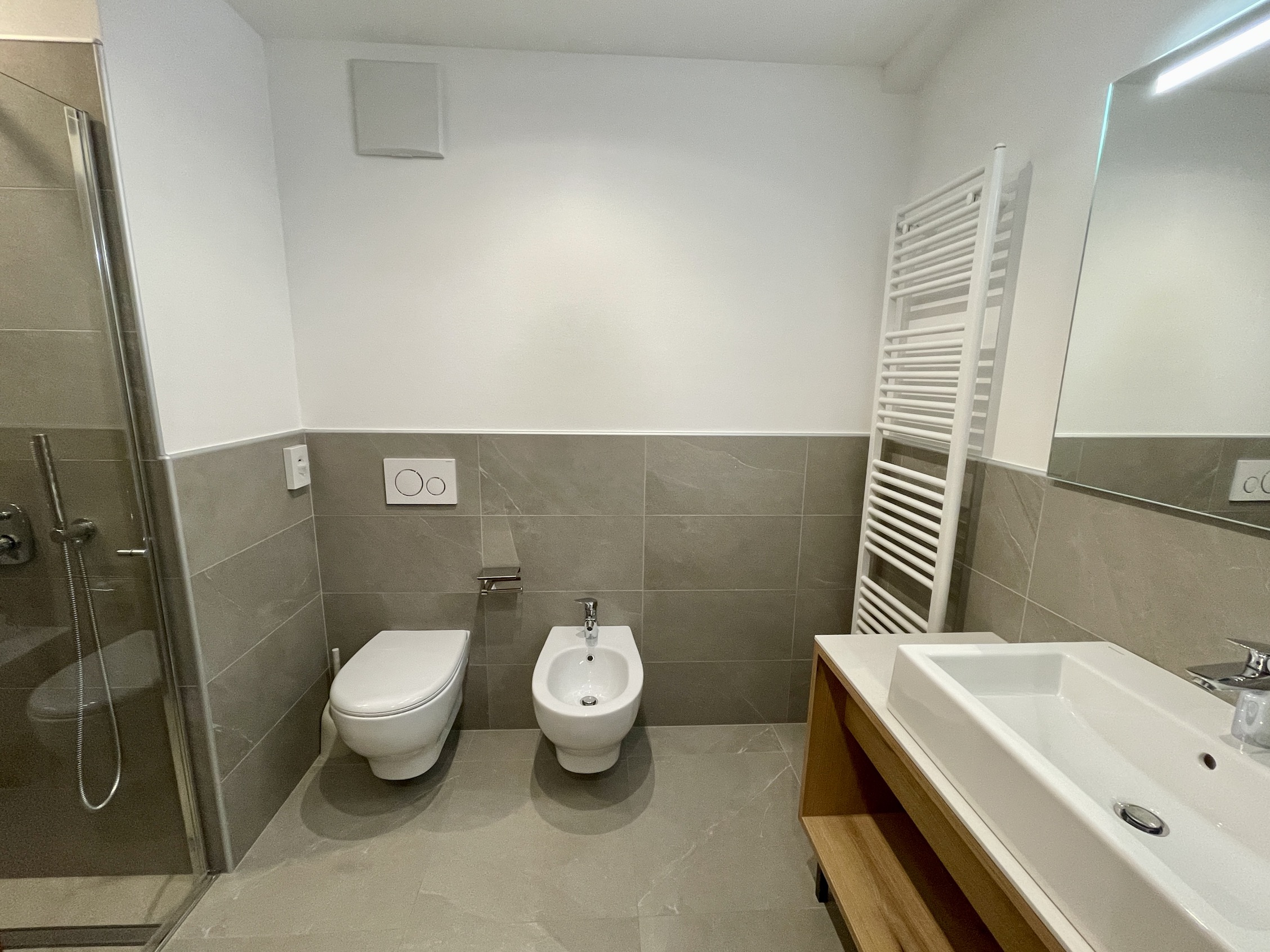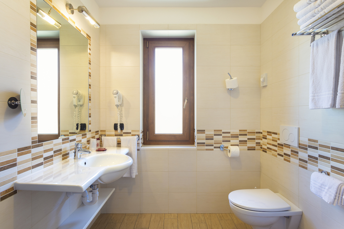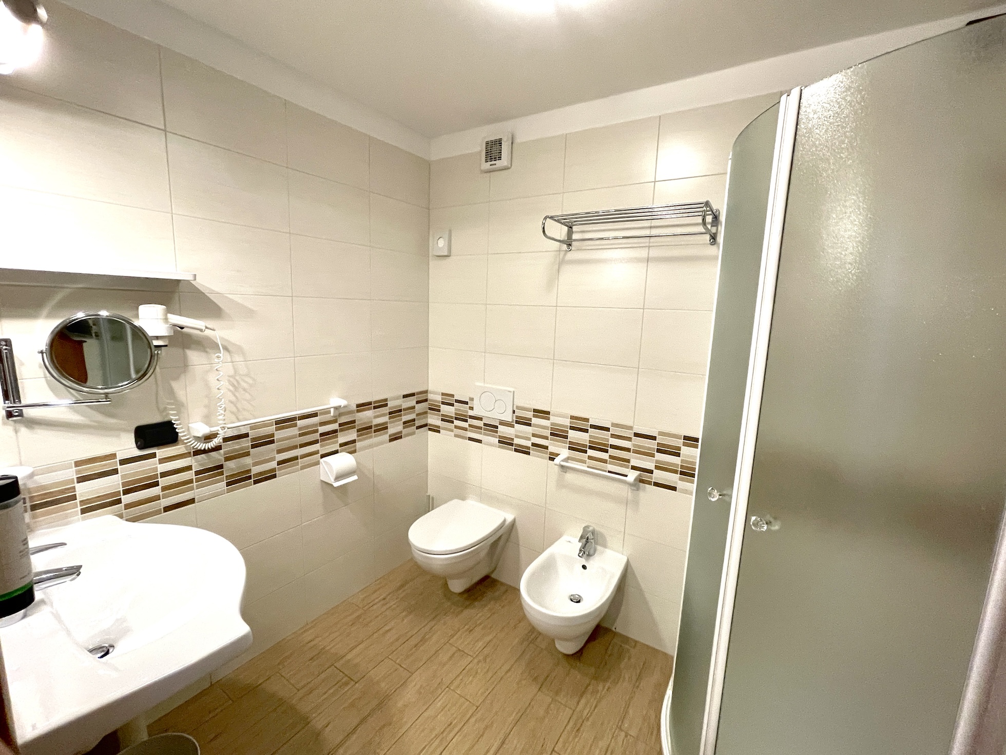 Nel bagno finestrato, oltre alla doccia, troverai una vasca dove poterti rilassare dopo un'escursione o una sciata in Paganella.