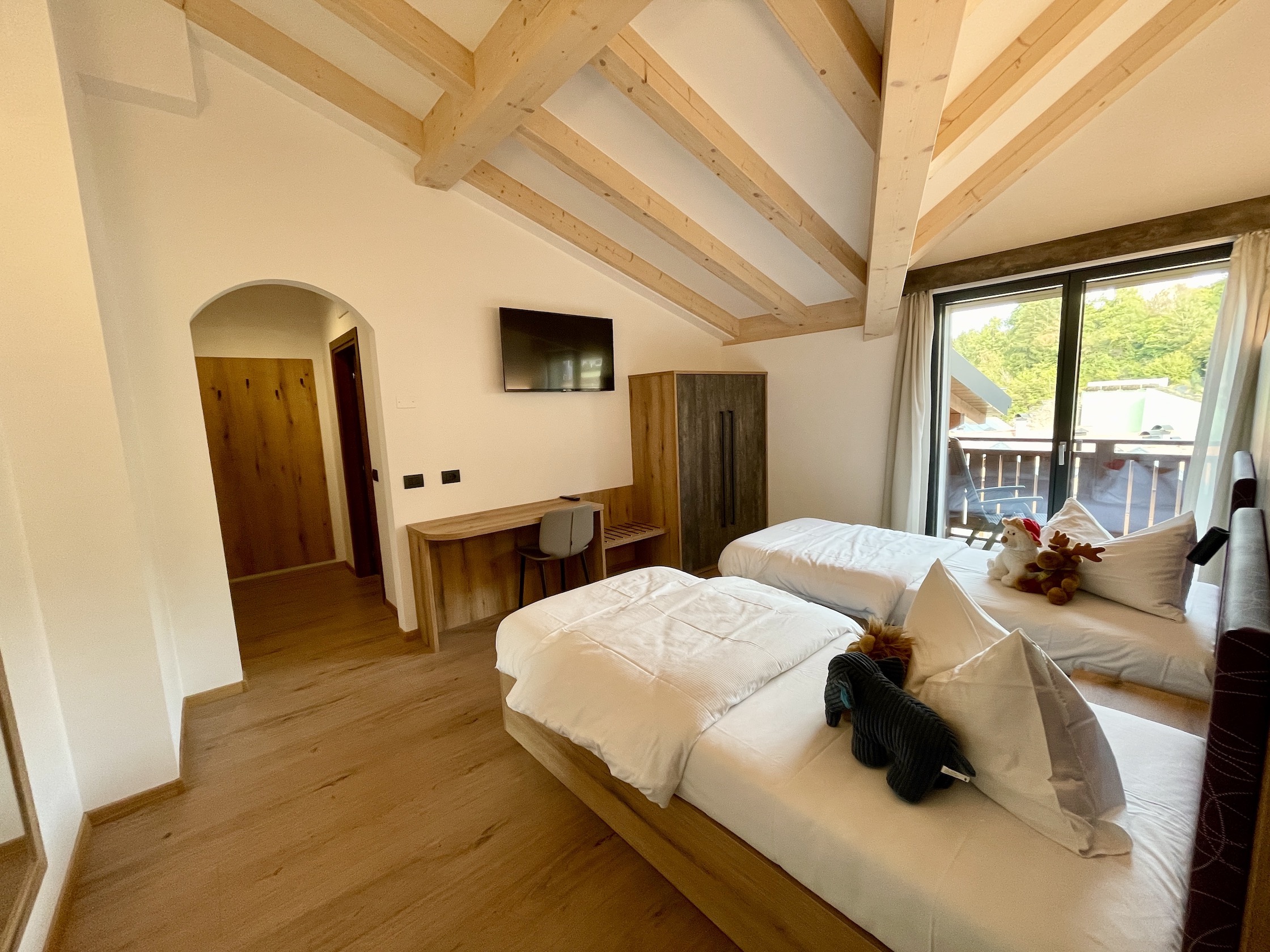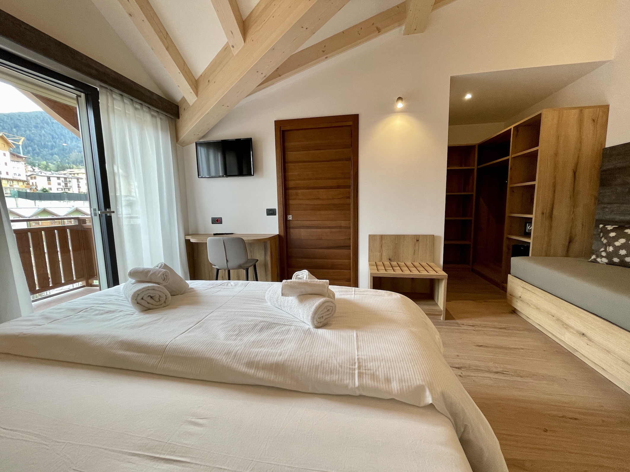 Questa tipologia di stanza family può ospitare fino a 5 persone ed è dotata di un ampio balcone con una magnifica vista sulle Dolomiti di Brenta!