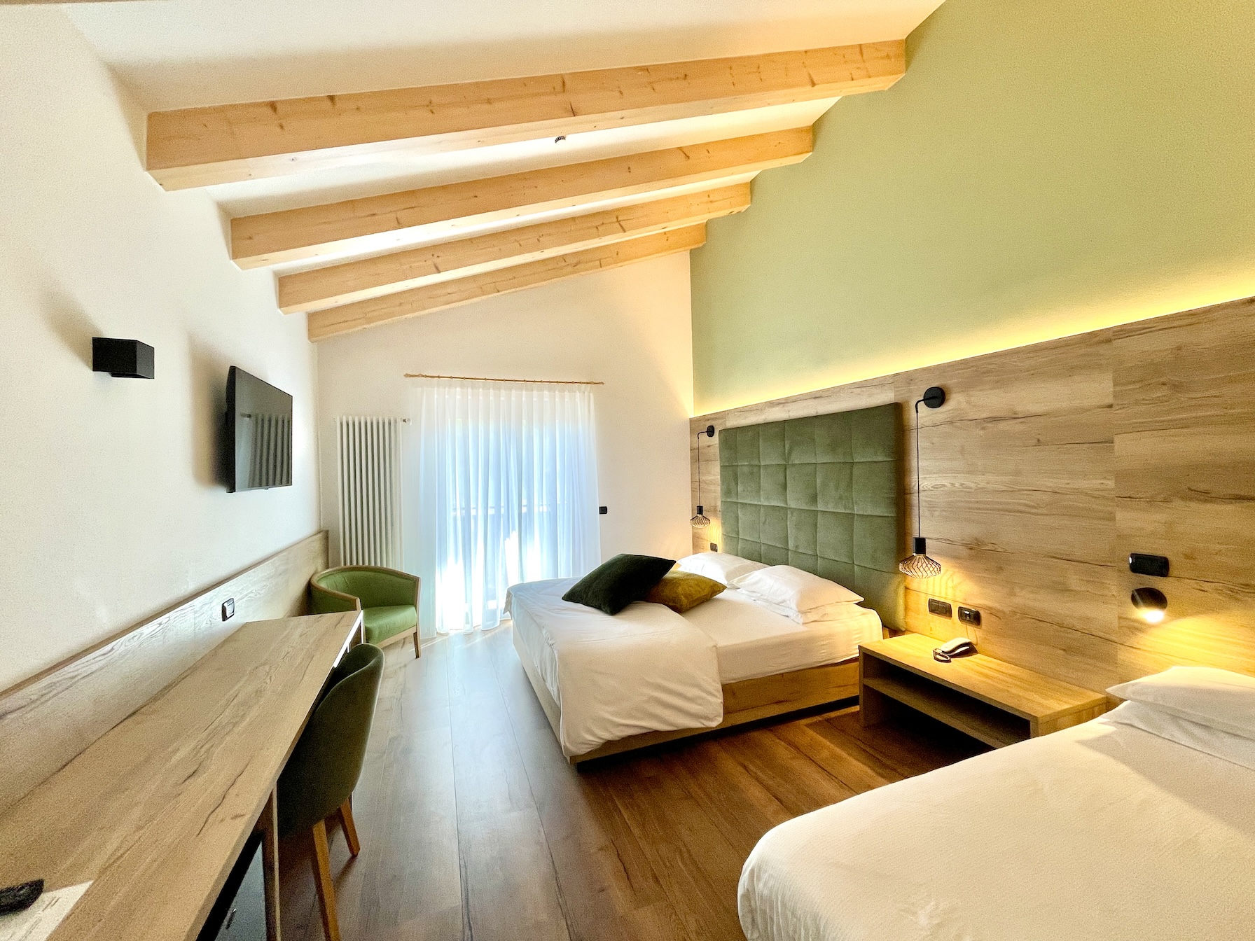 Questa tipologia di stanza family può ospitare fino a 5 persone ed è dotata di un ampio balcone con vista Paganella!