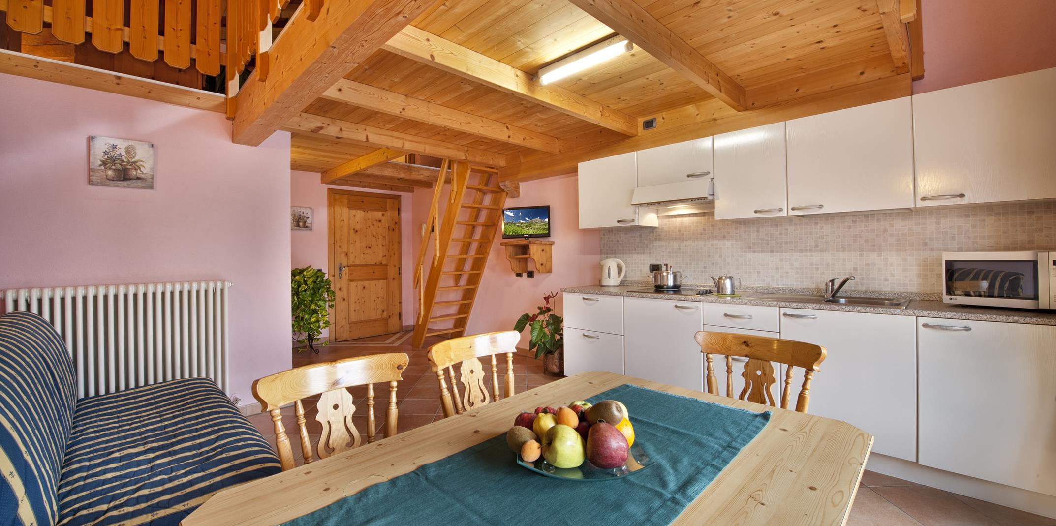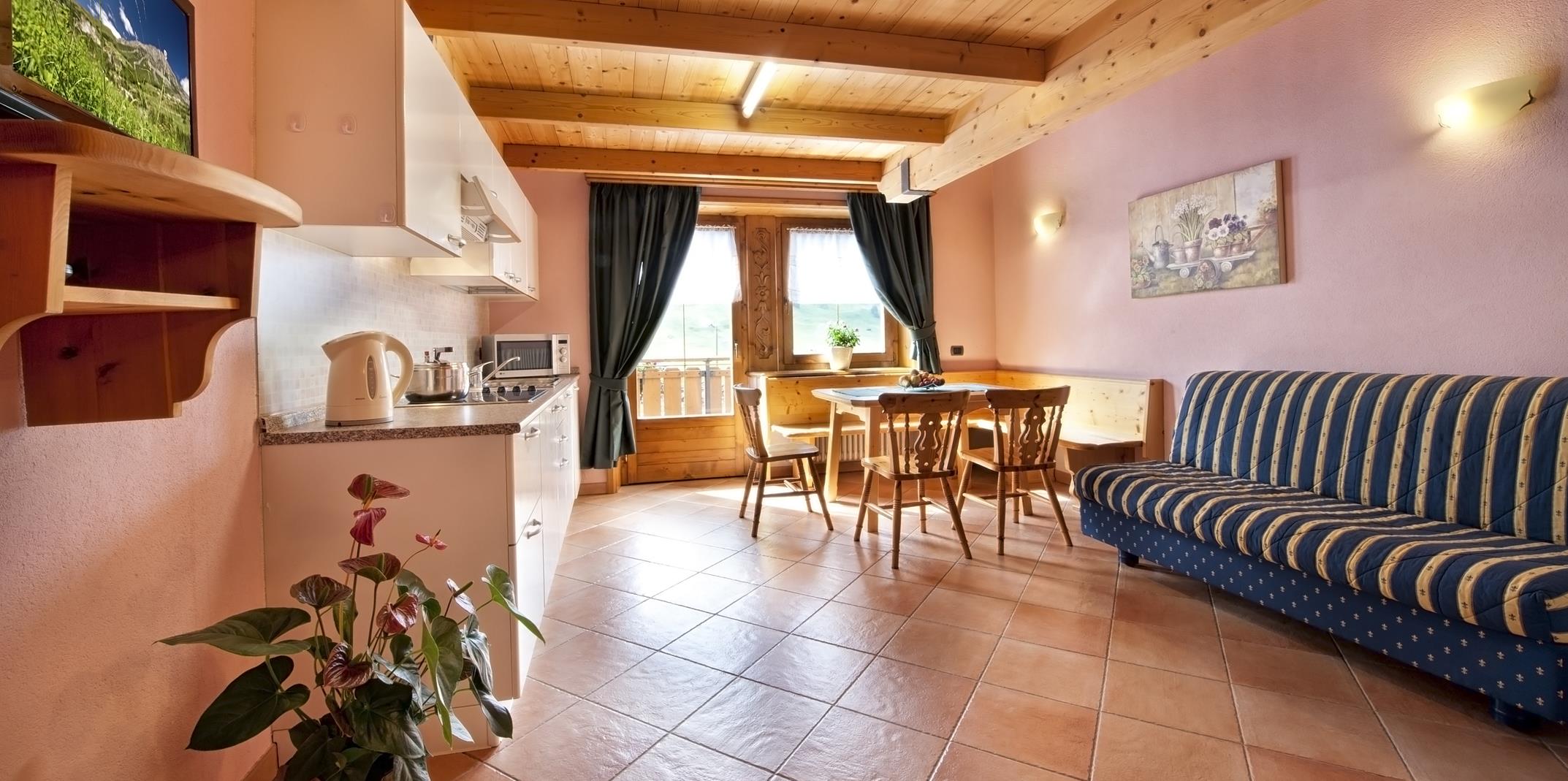 Il nostro appartamento su due livelli è arredato in caratteristico stile alpino, con travi a vista e mobili in legno massiccio. Entrando, potrete apprezzare il soggiorno con cucina a vista attrezzata e completo di divano letto. Uno splendido balcone, inoltre, vi regalerà una vista panoramica su Livigno.