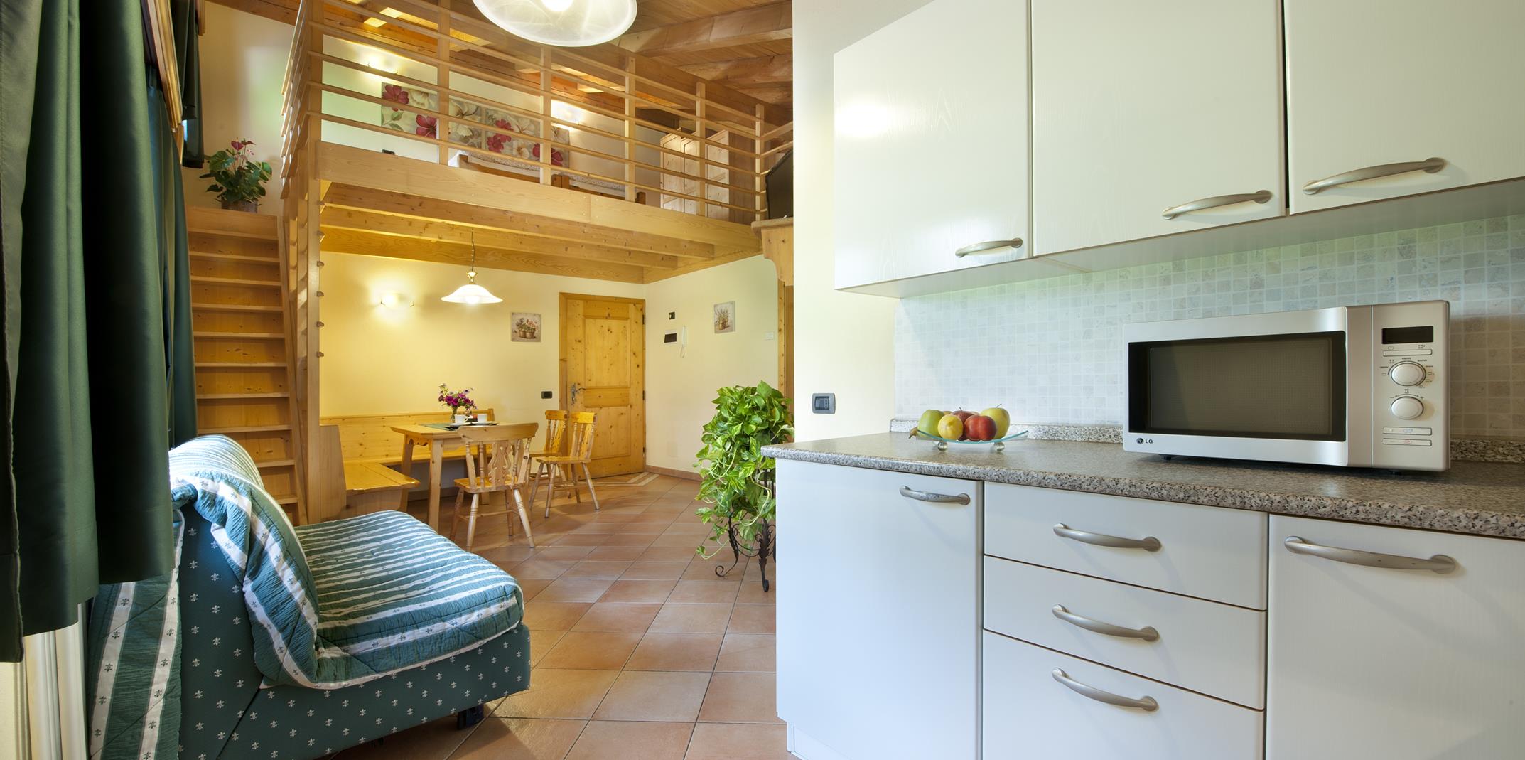 Munita di tutte le comodità e ammobiliata in tipico stile montano, con pavimenti in parquet, soffitto e arredi in legno massiccio, è ideale per un soggiorno rilassante e piacevole in coppia.
